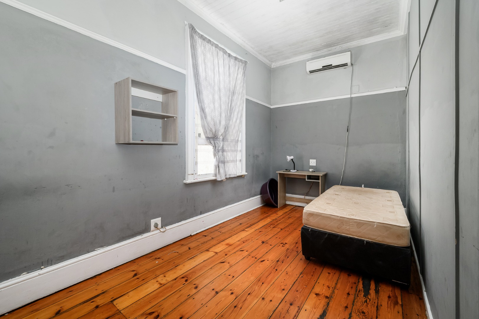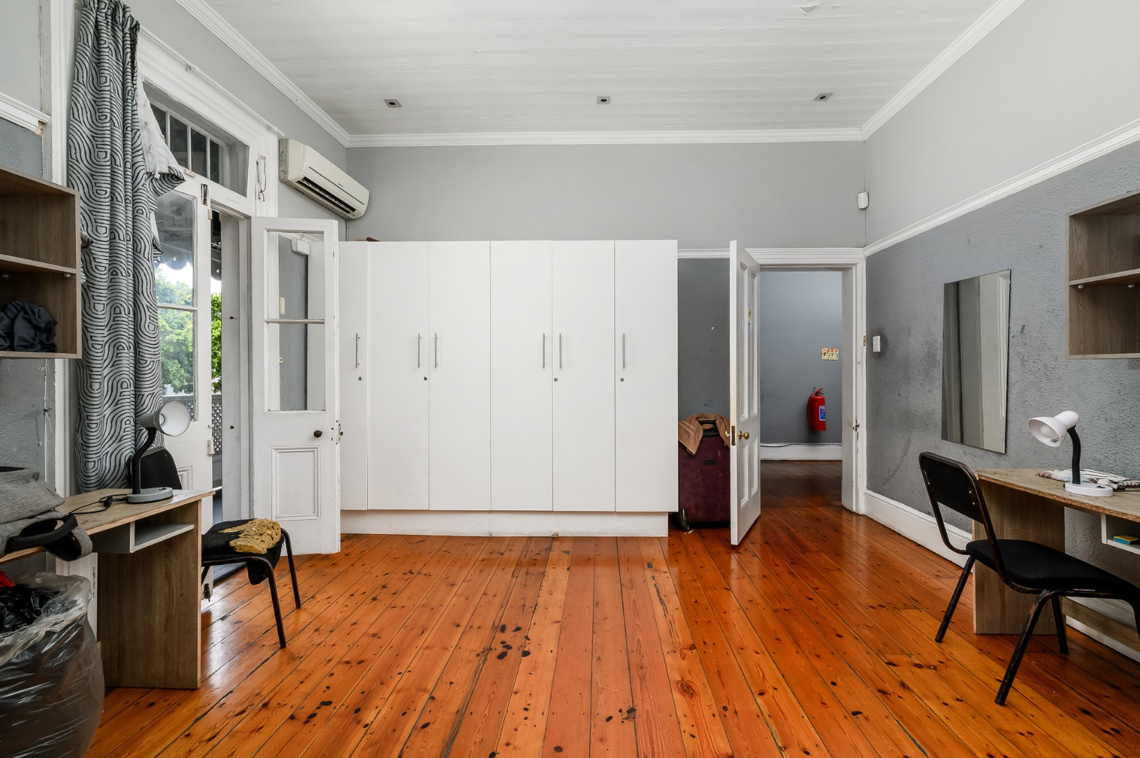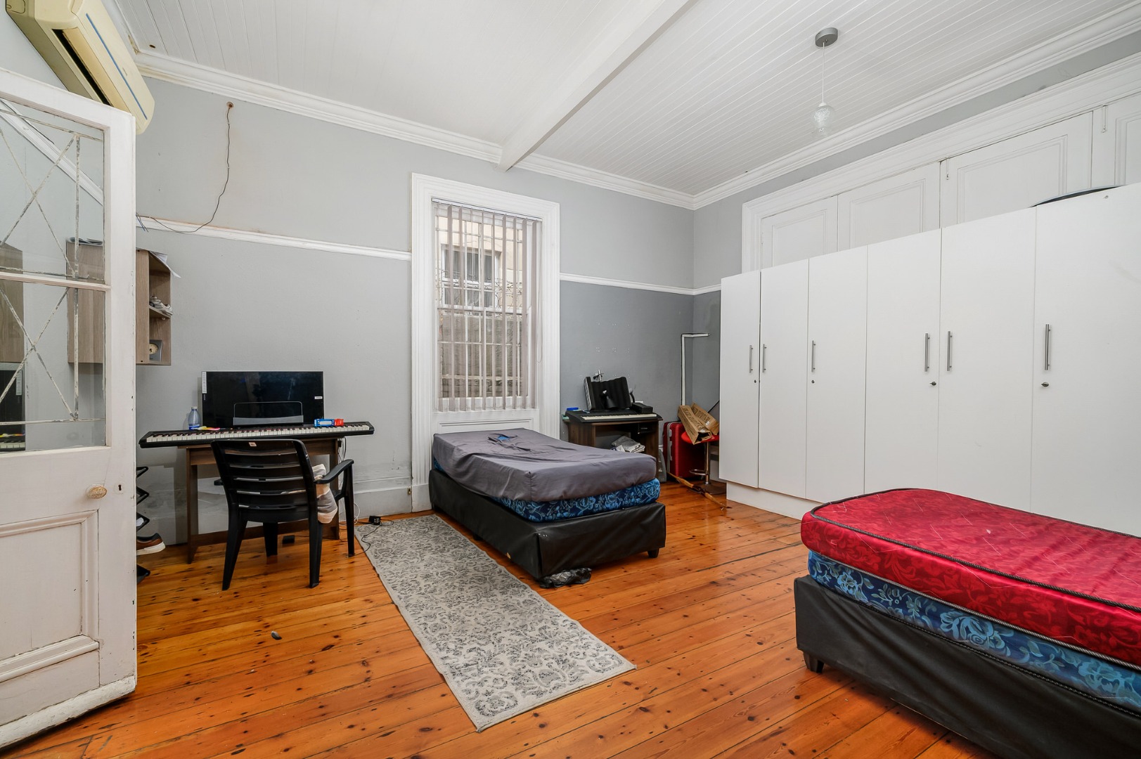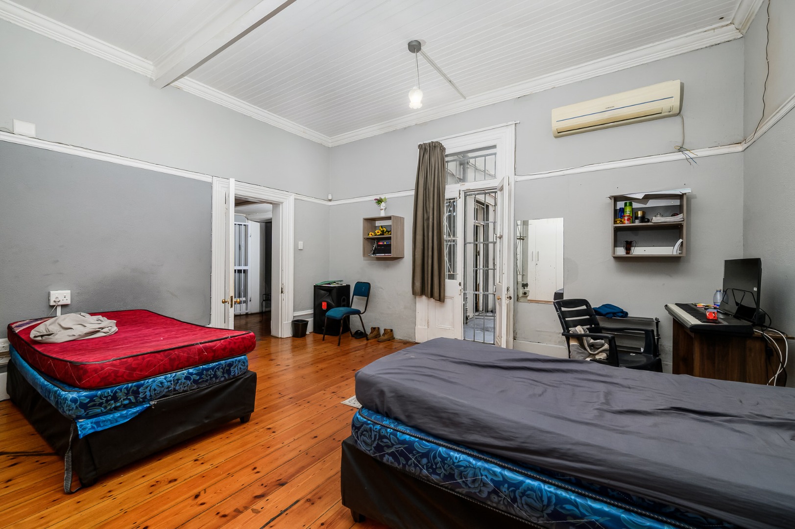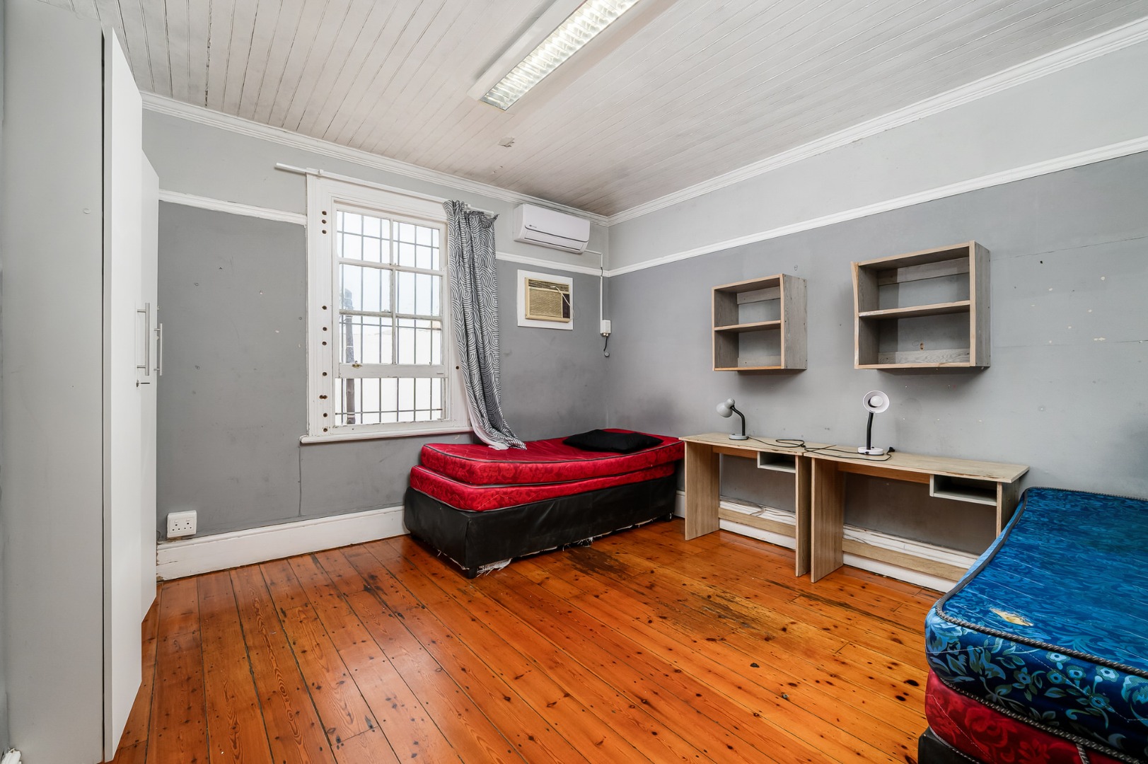 Most of the home features exposed wooden flooring, enhancing both character and durability. The property is double volume, contributing to a sense of space throughout. Four of the seven bedrooms are fitted with air-conditioning units, and built-in cupboards are provided in the bedrooms as well as desks. Accommodation includes a mix of single-occupancy and shared rooms, allowing for flexible rental configurations.