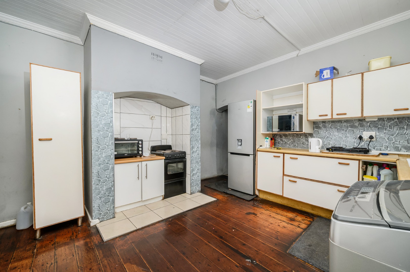 A welcoming entrance hall leads into a generous living area, creating a comfortable communal space. The kitchen is well appointed with ample built-in cupboards and includes water connections for a washing machine as well as space for a freestanding stove.
