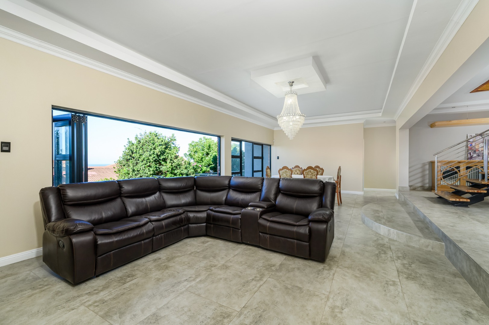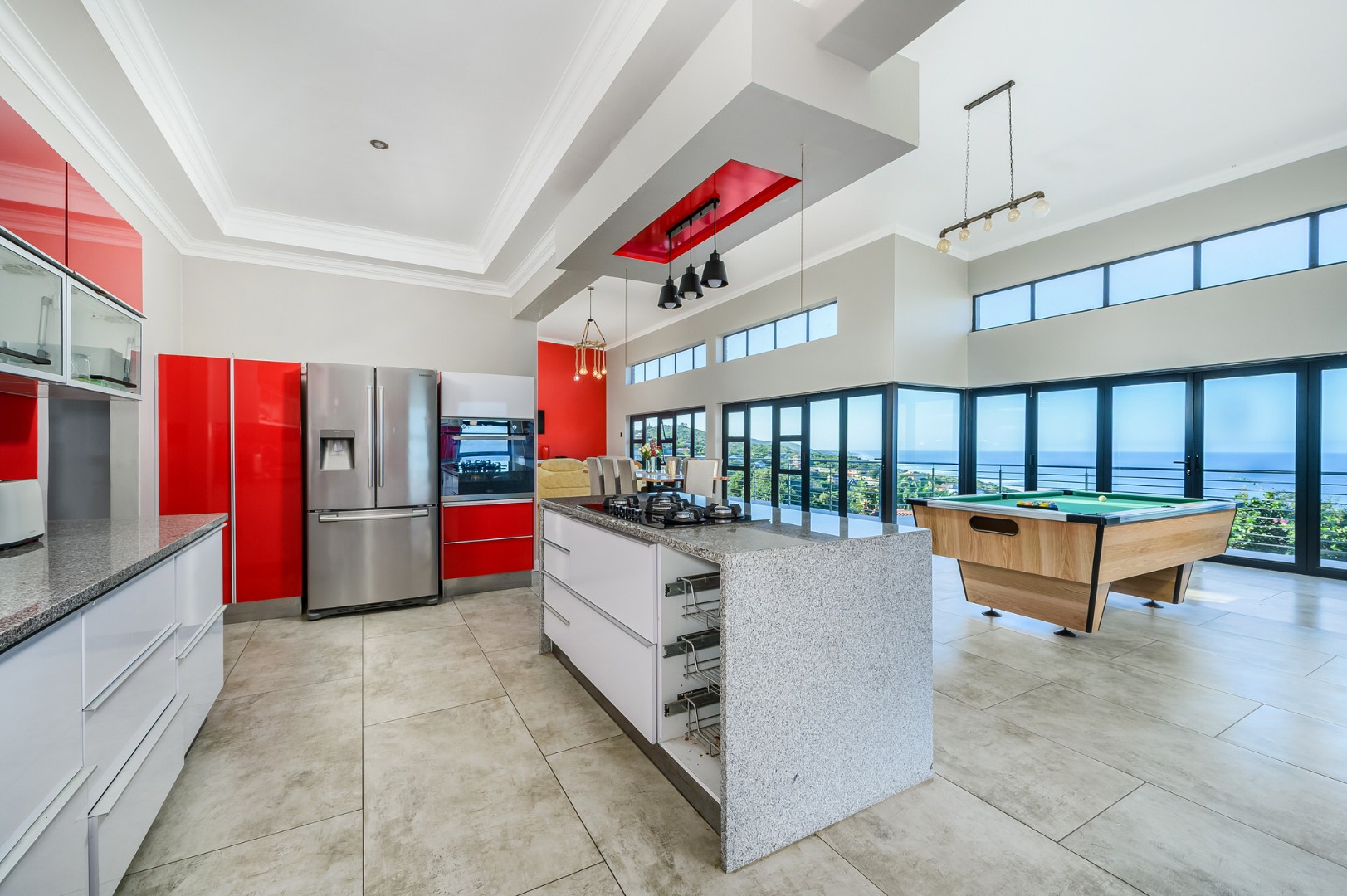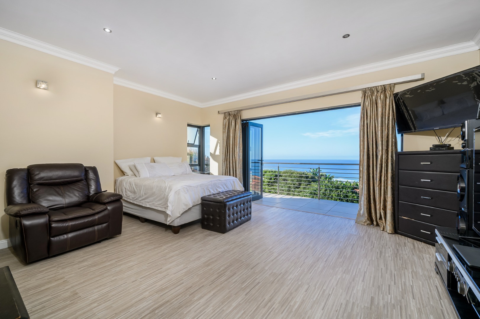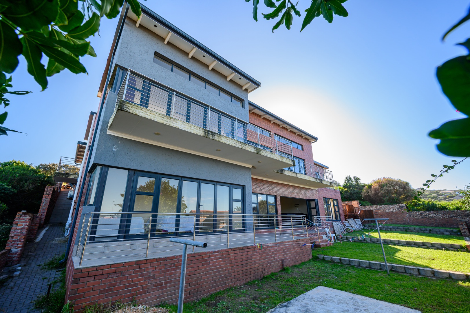Downstairs, a fully equipped Kitchenette serves a generous open plan dinning and a lounge area . Three beautifully appointed bedrooms ,each offers an an-suit bathrooms and ample cupboards space, ensuring privacy and comfort for family or guests. Stacker doors open unto covered patio where the sea breeze and stunning views create the perfect setting for outdoor relaxation or entertain .