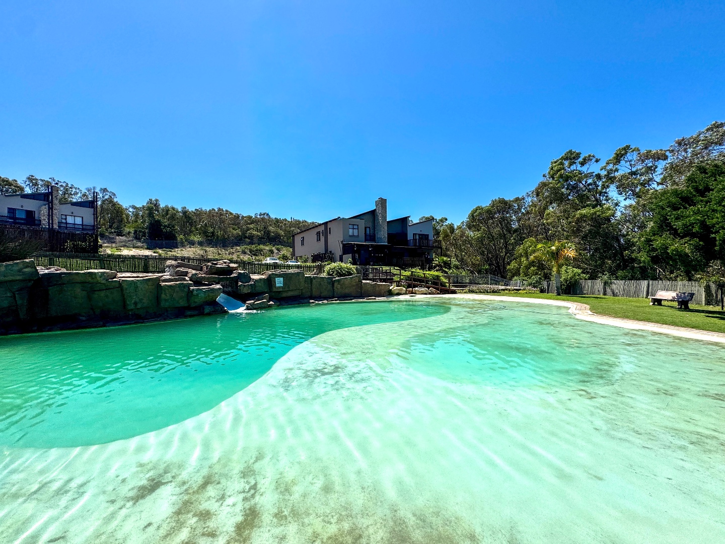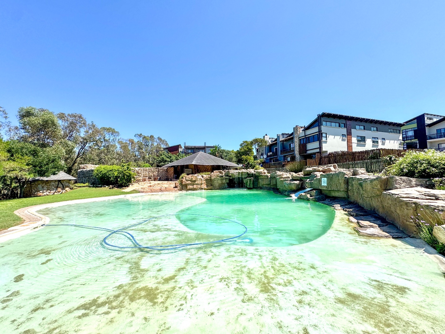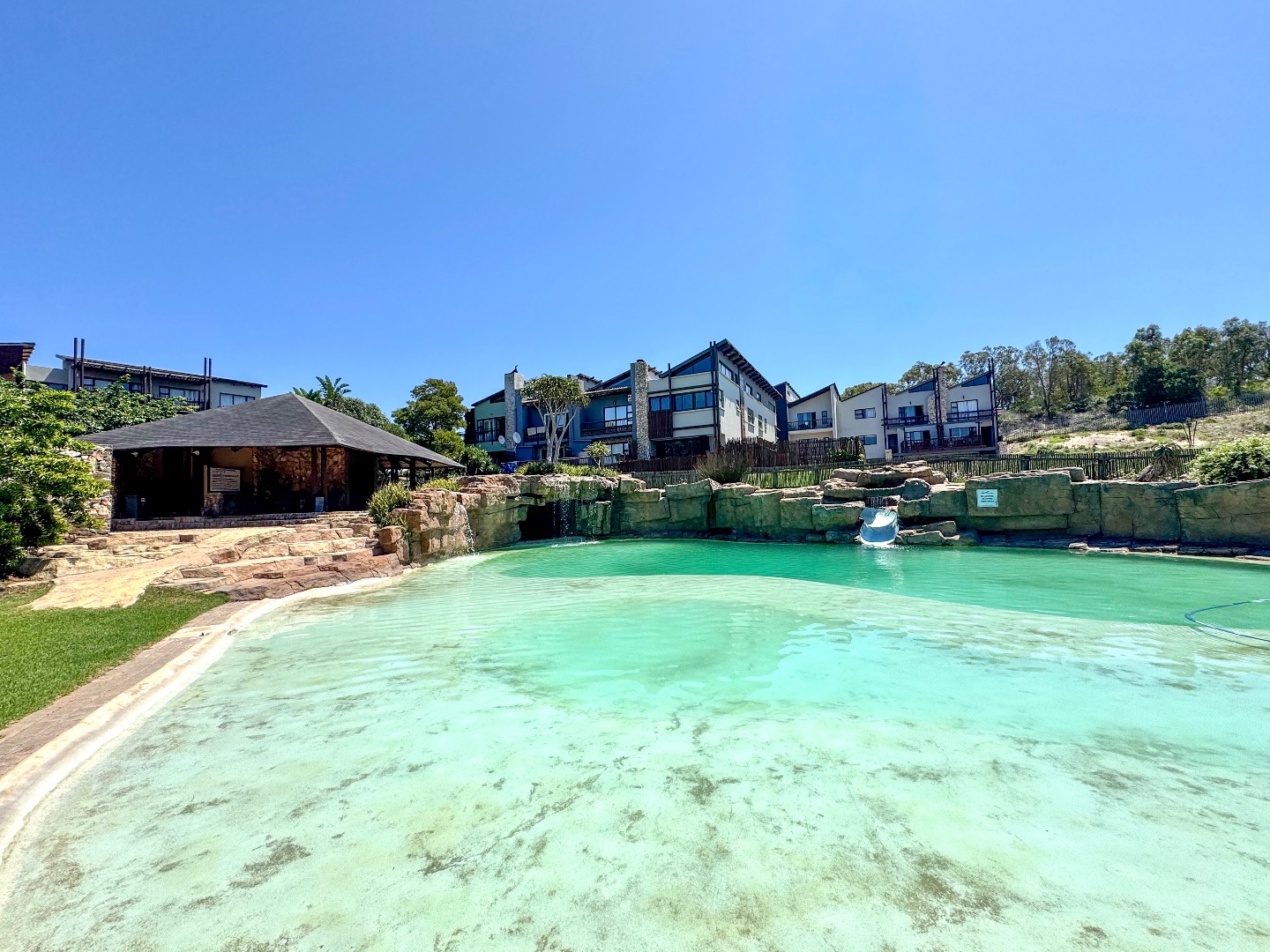 Estate swimming pool, with slide and entertainment area for residents.