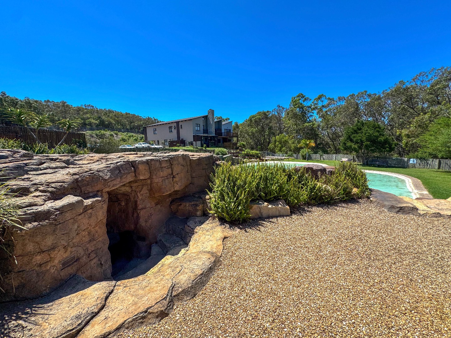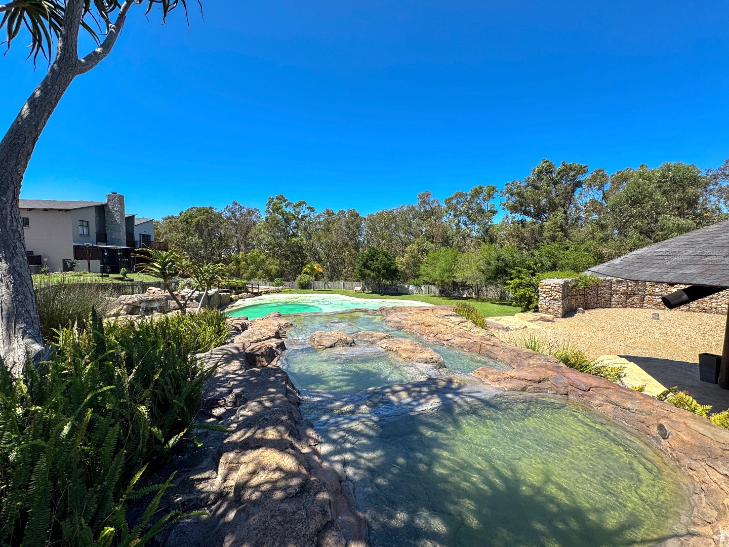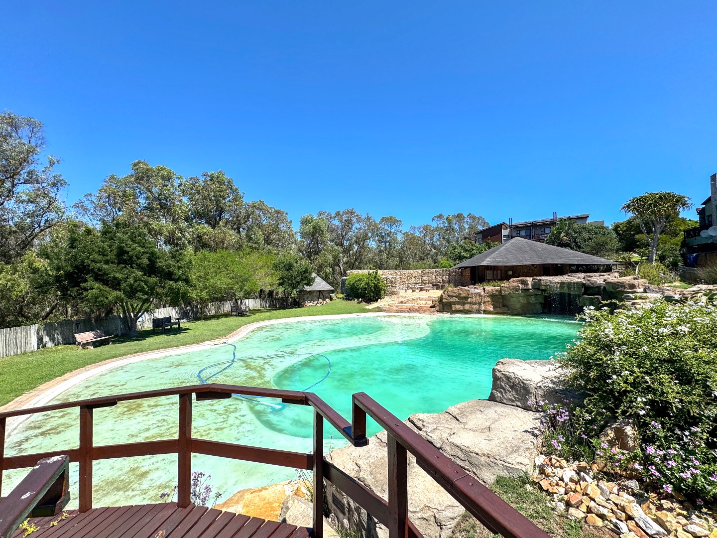 Estate swimming pool, with slide and entertainment area for residents.