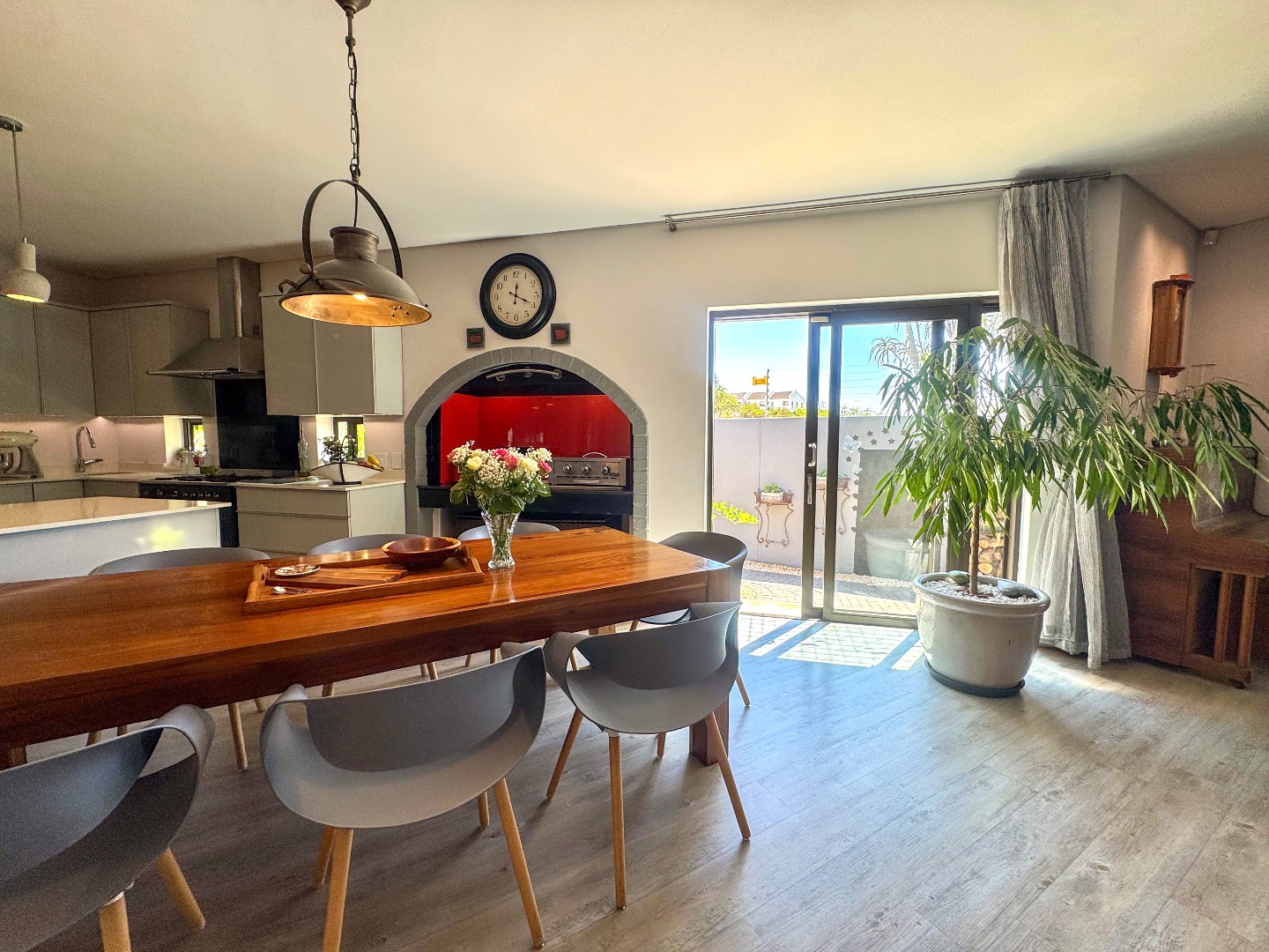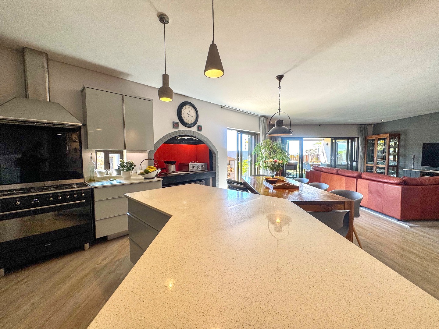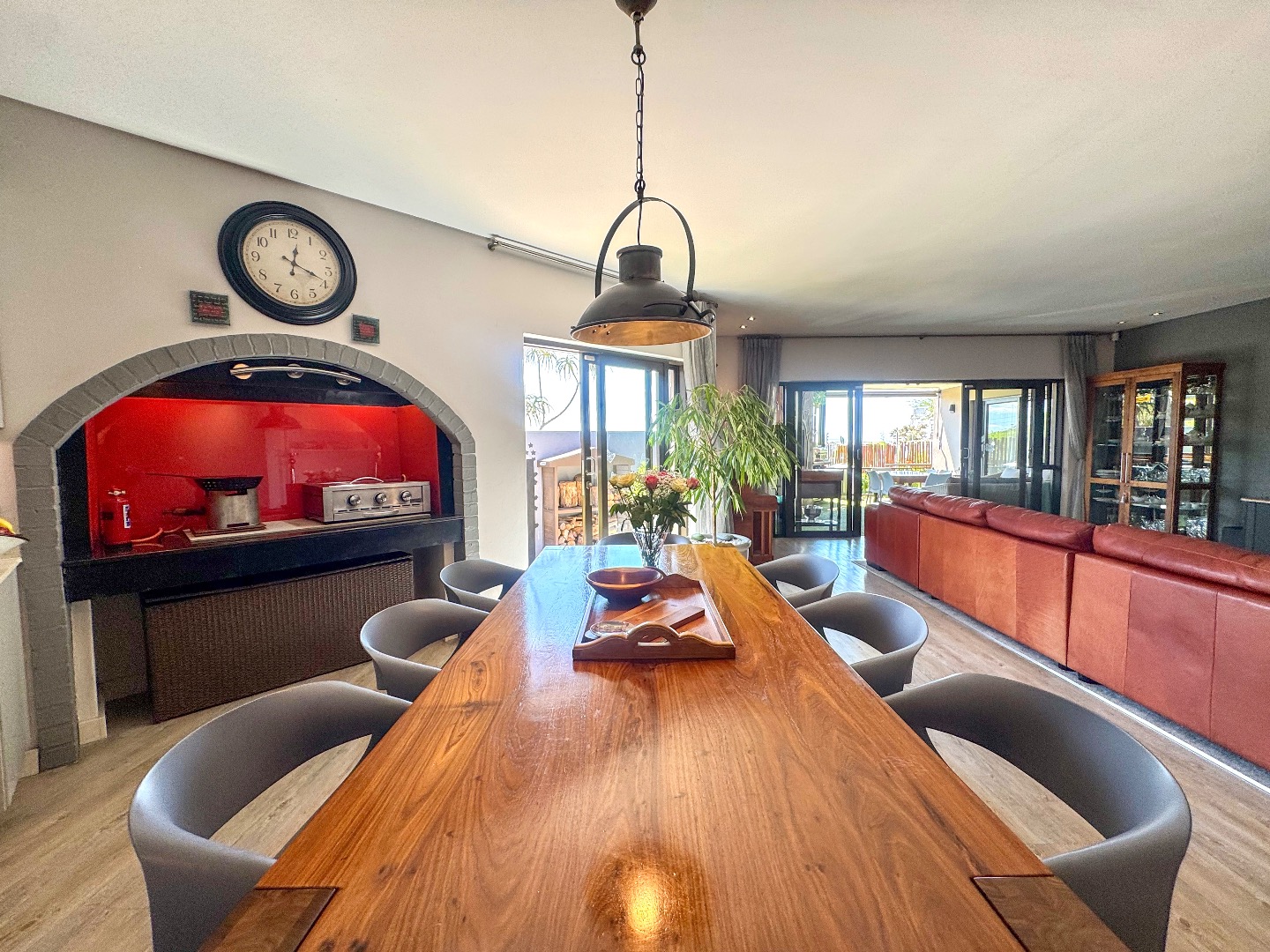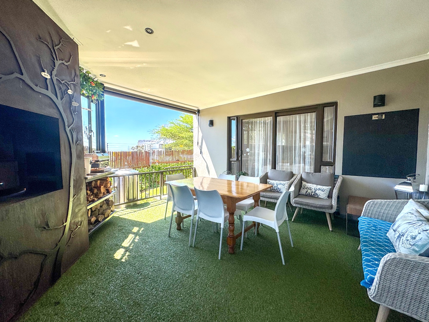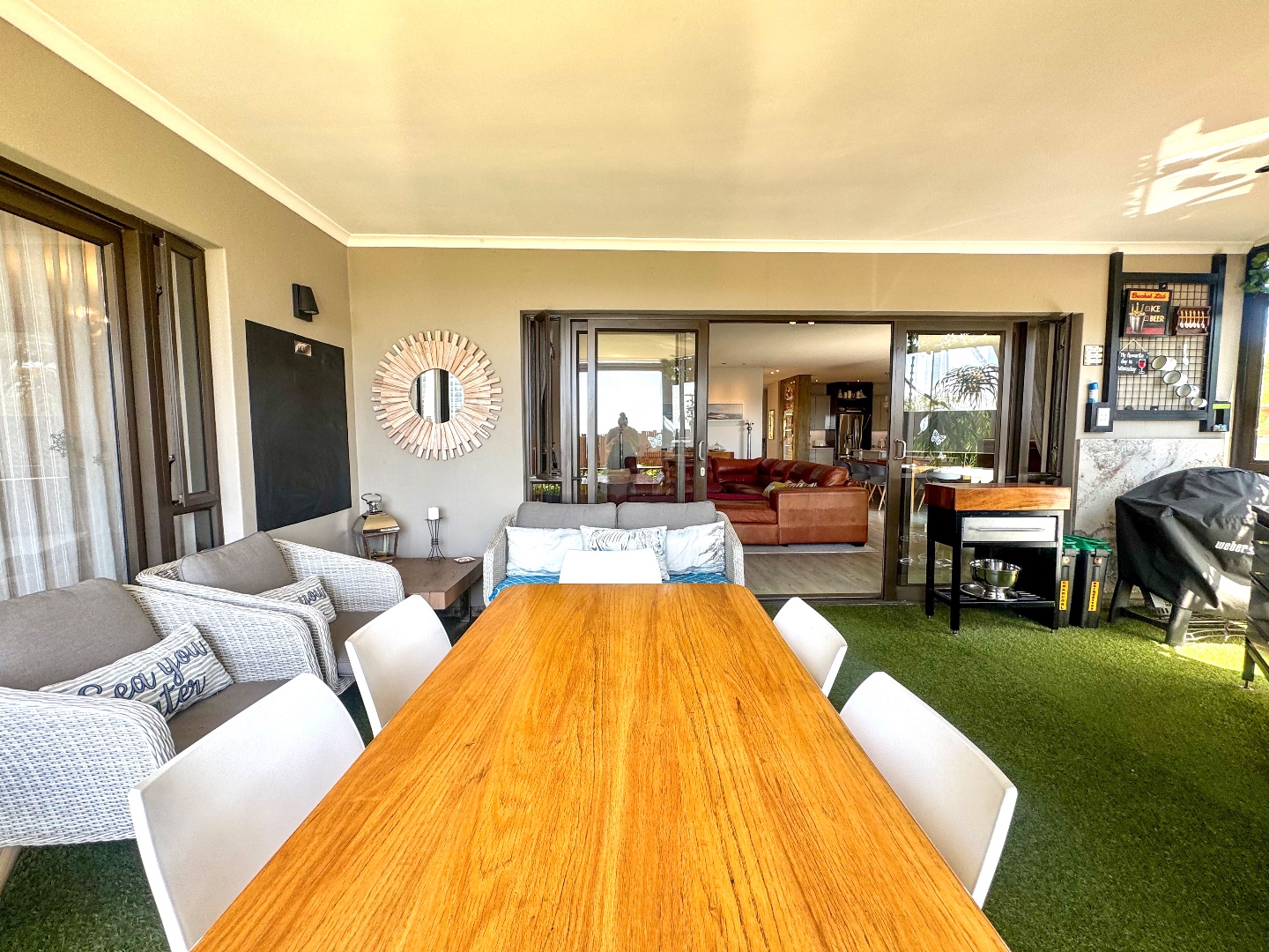 The living area flows effortlessly onto a covered entertainment patio with a built-in braai — perfect for relaxed entertaining or peaceful afternoons at home. An outdoor shower with hot and cold water adds a practical coastal touch after beach visits or time spent outdoors.