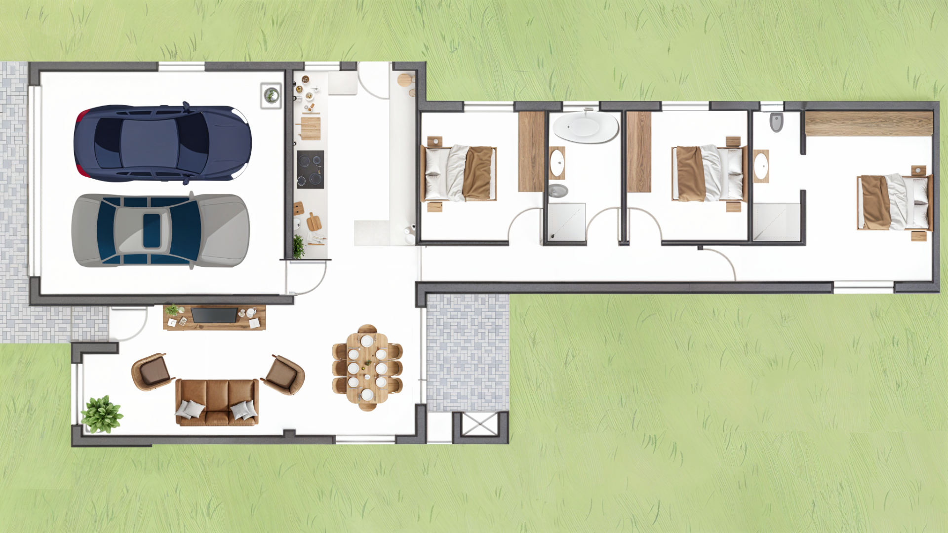 Private Bedroom Wing: All three bedrooms are tucked away in a dedicated wing, ensuring quiet and privacy away from the living areas.