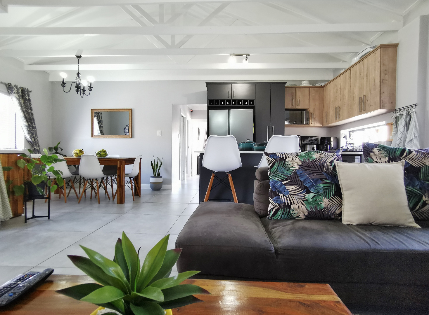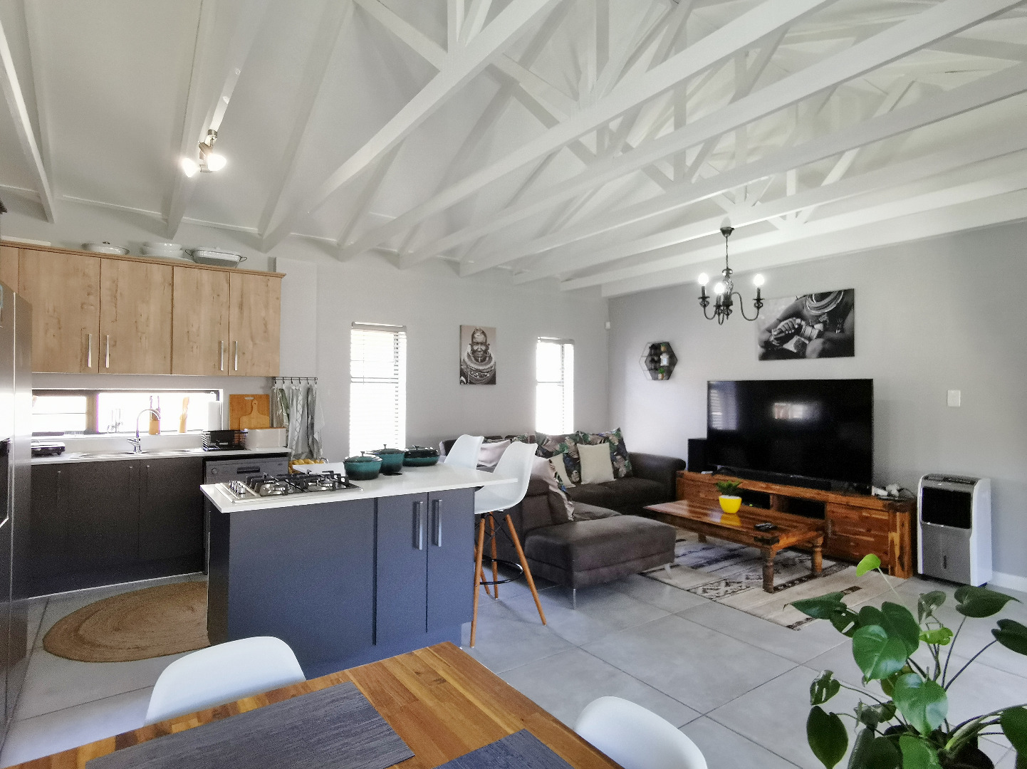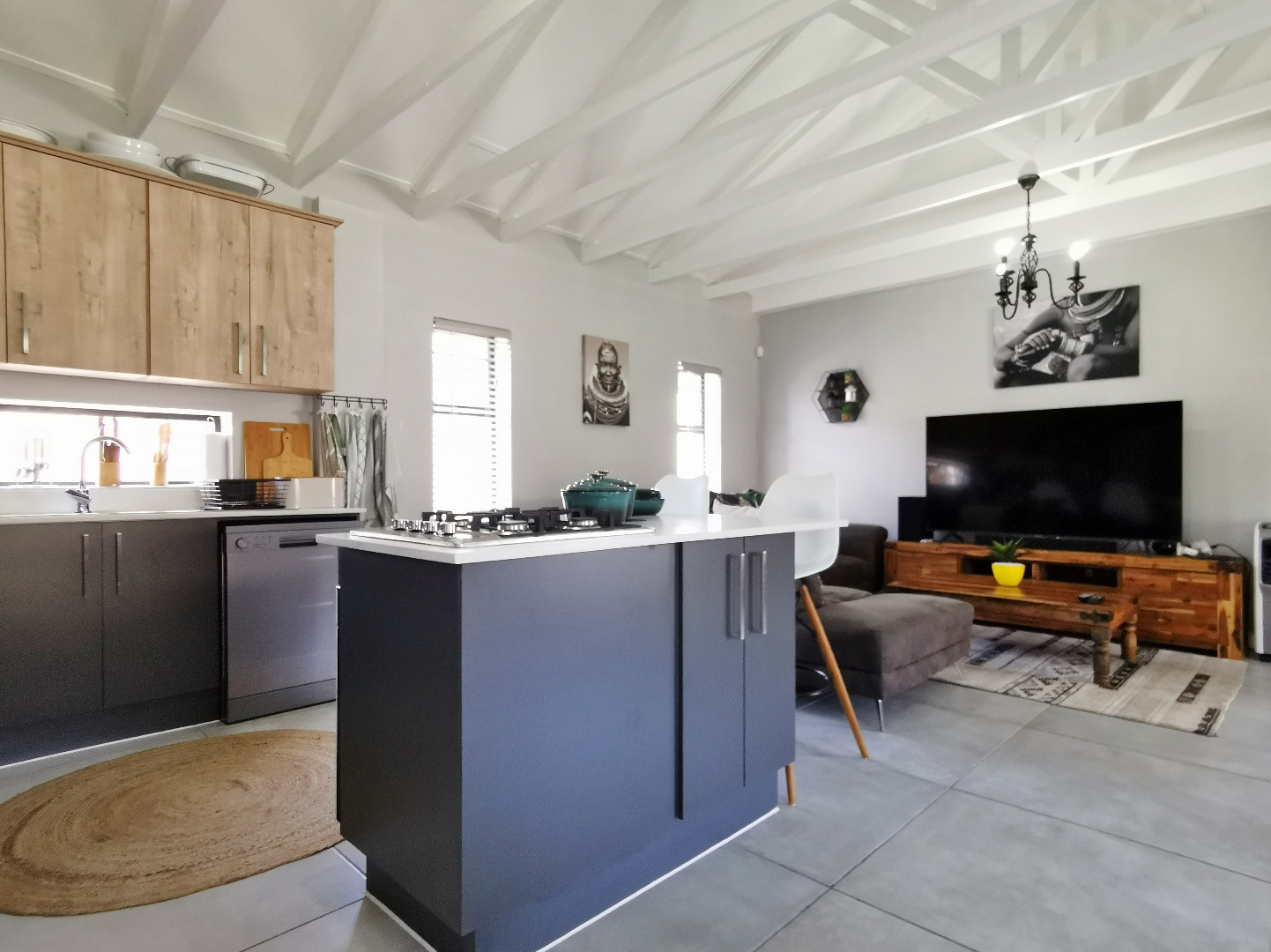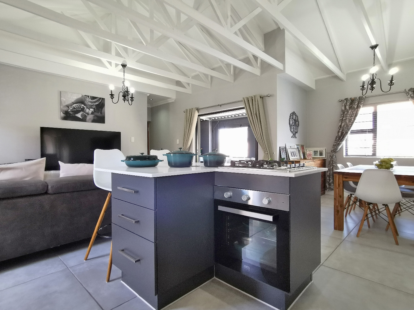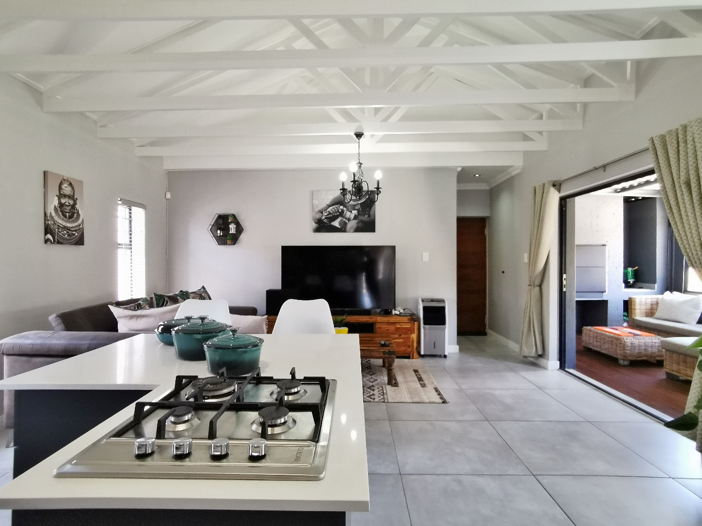 At the heart of the home is a stylish open-plan kitchen fitted with a centre island and breakfast counter, under-counter oven and gas hob, flowing seamlessly into the lounge and dining areas. Sliding doors open onto a covered patio deck with a built-in braai, creating an ideal entertainment space overlooking the enclosed garden.