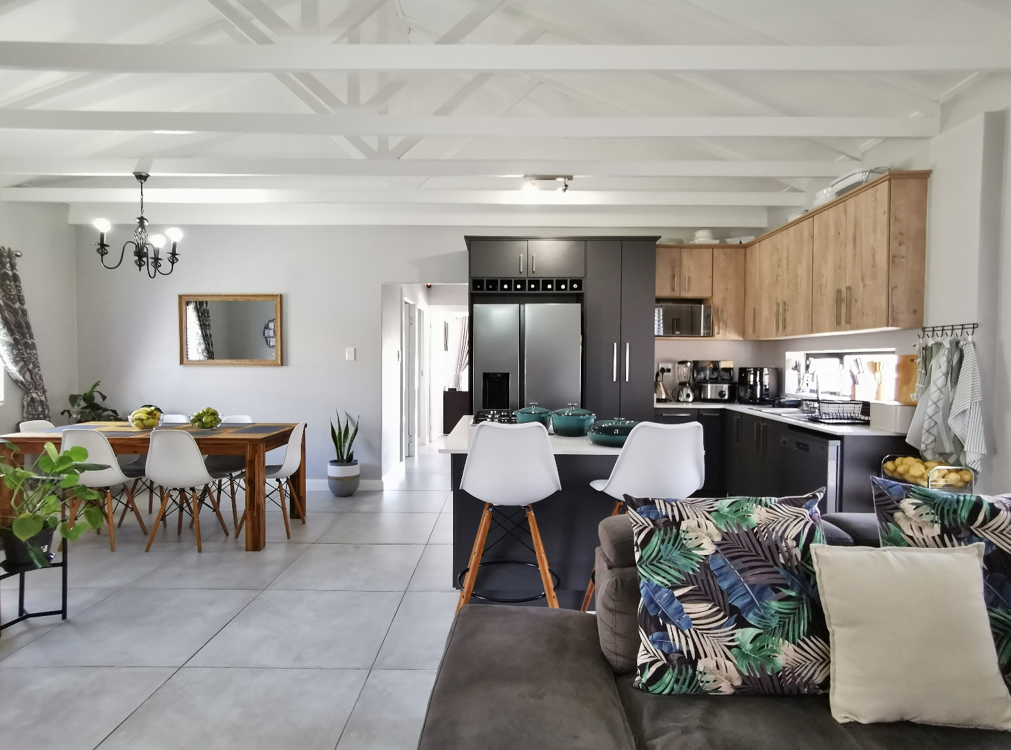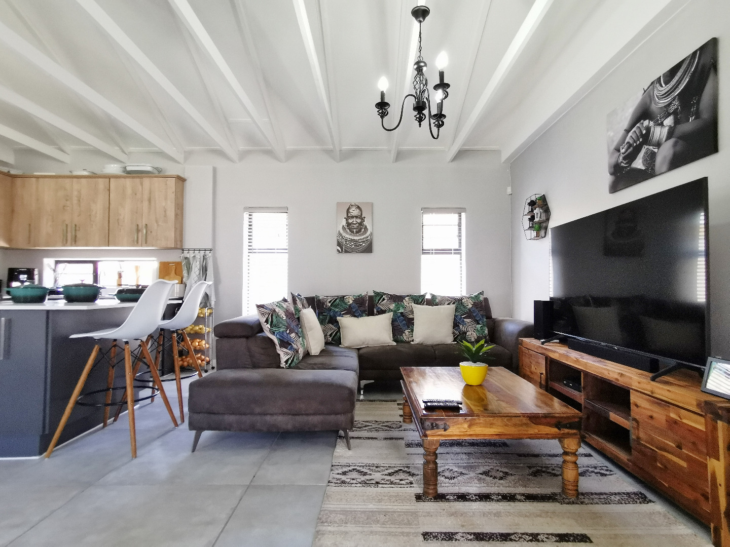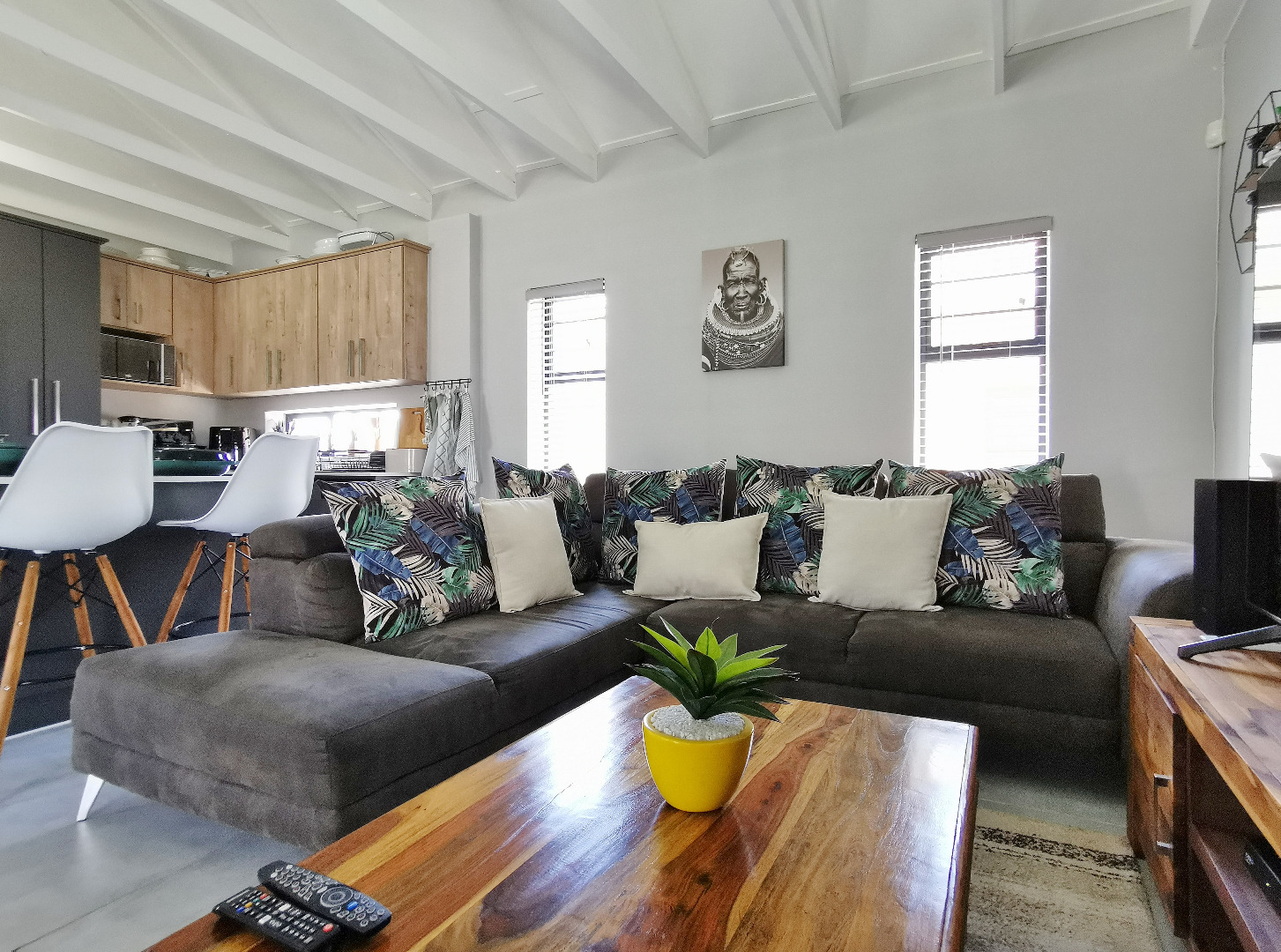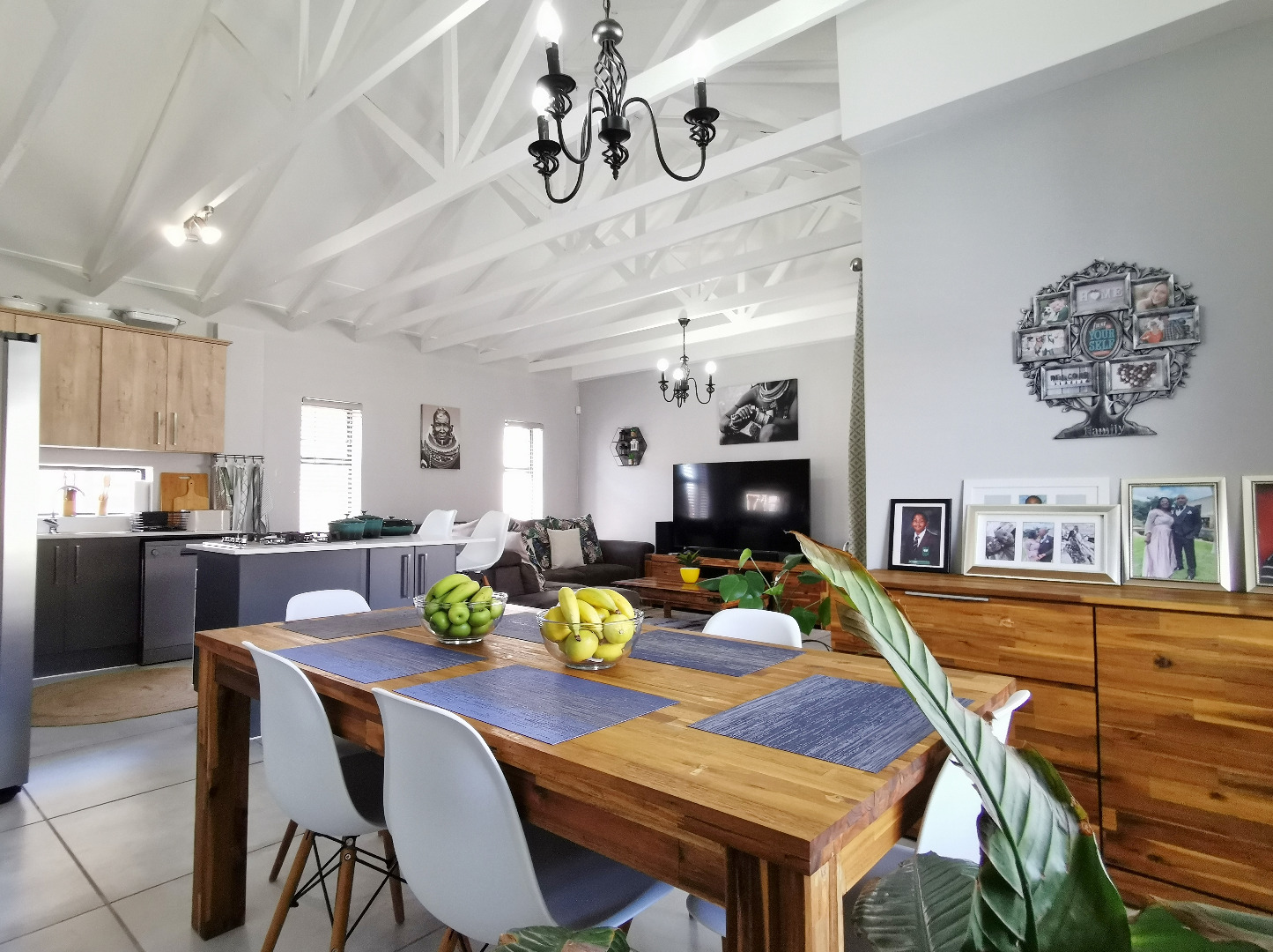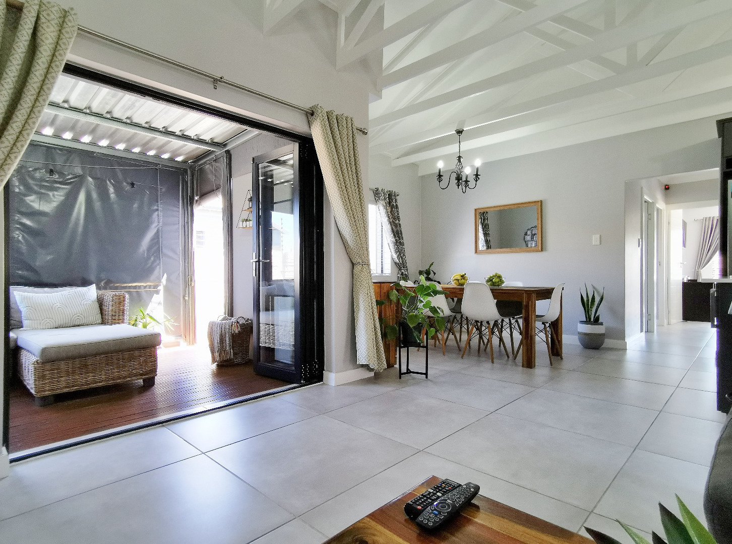 At the heart of the home is a stylish open-plan kitchen fitted with a centre island and breakfast counter, under-counter oven and gas hob, flowing seamlessly into the lounge and dining areas. Sliding doors open onto a covered patio deck with a built-in braai, creating an ideal entertainment space overlooking the enclosed garden.