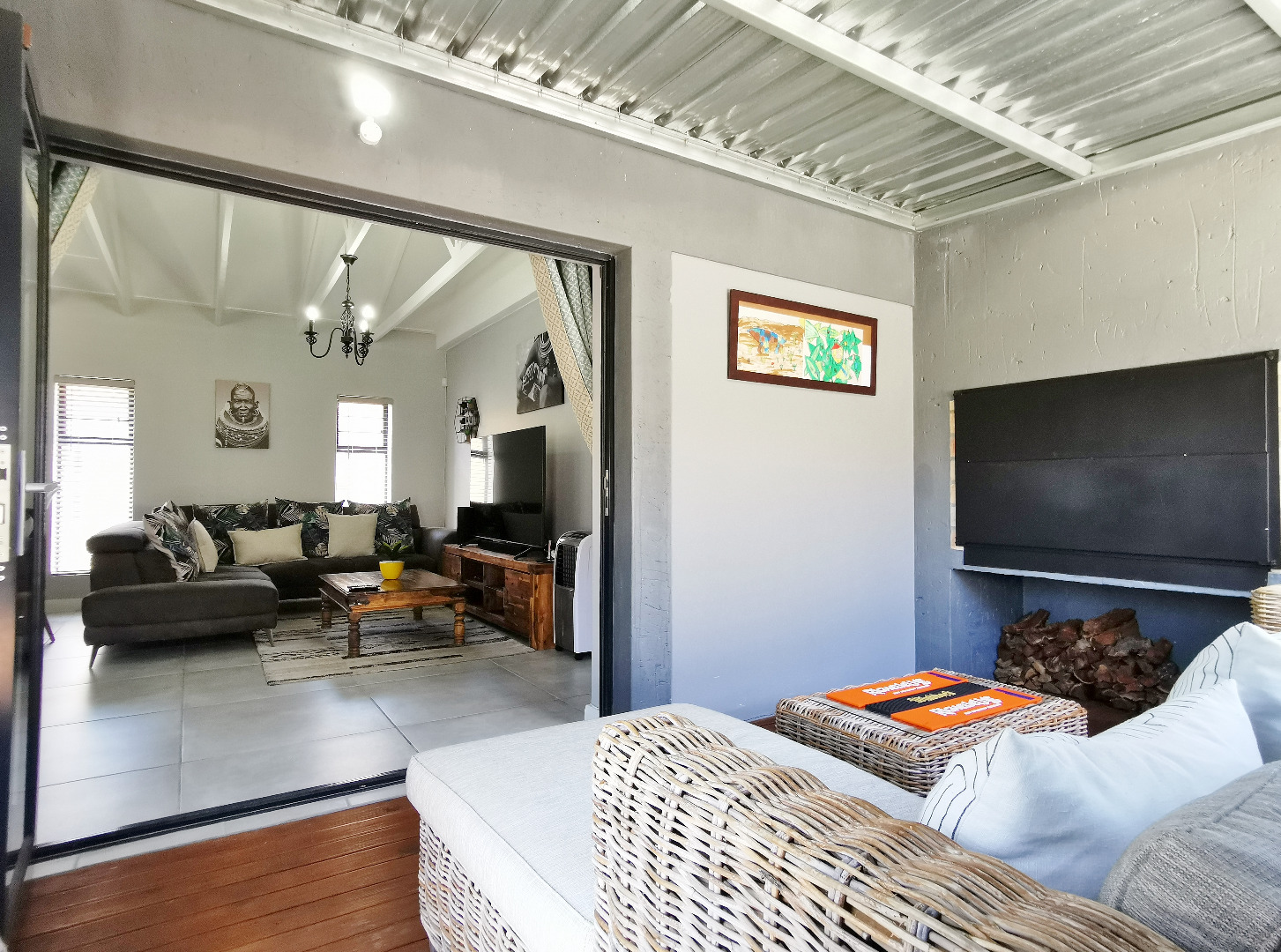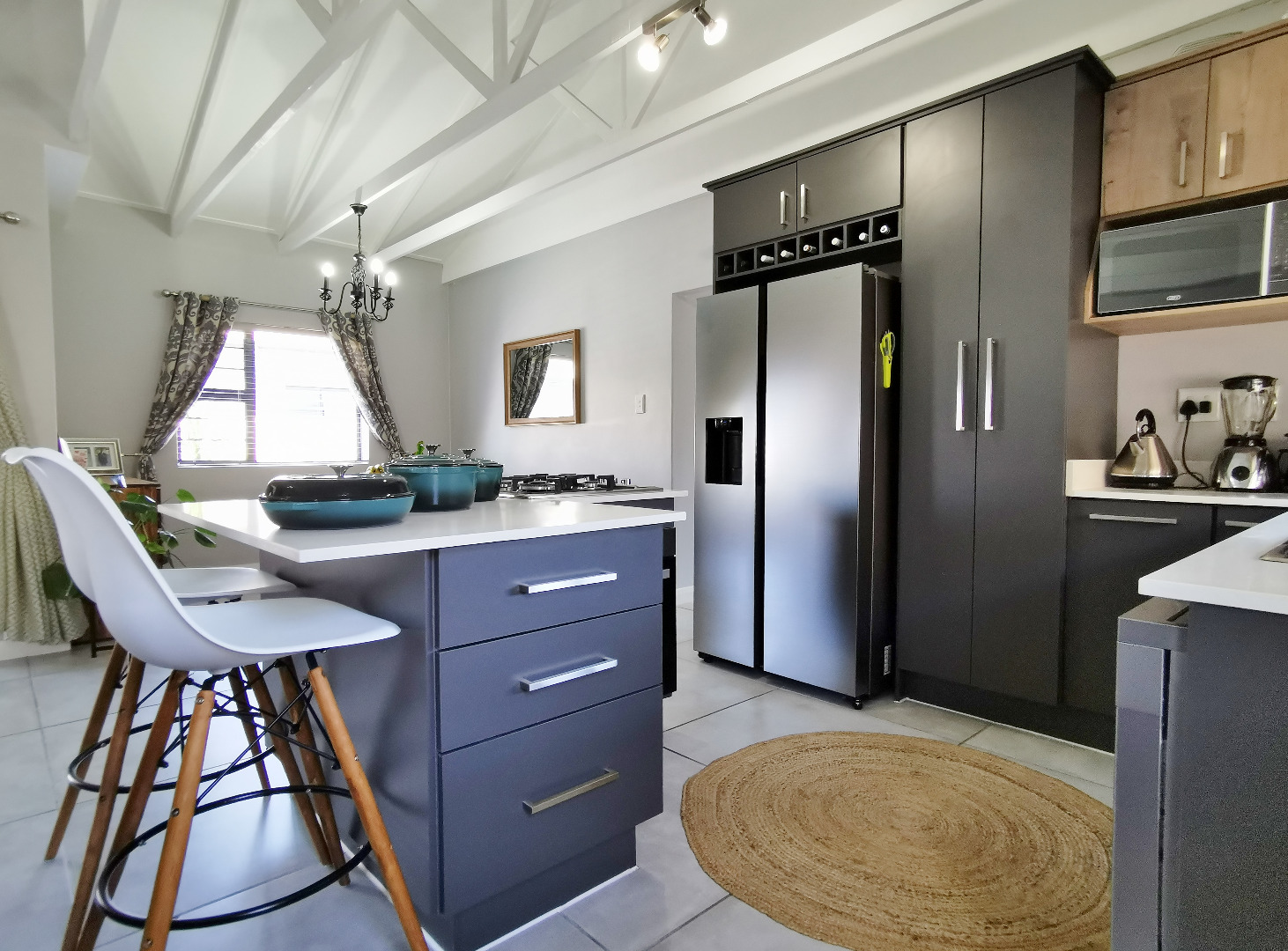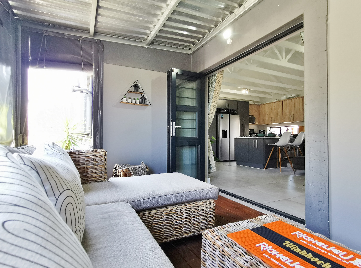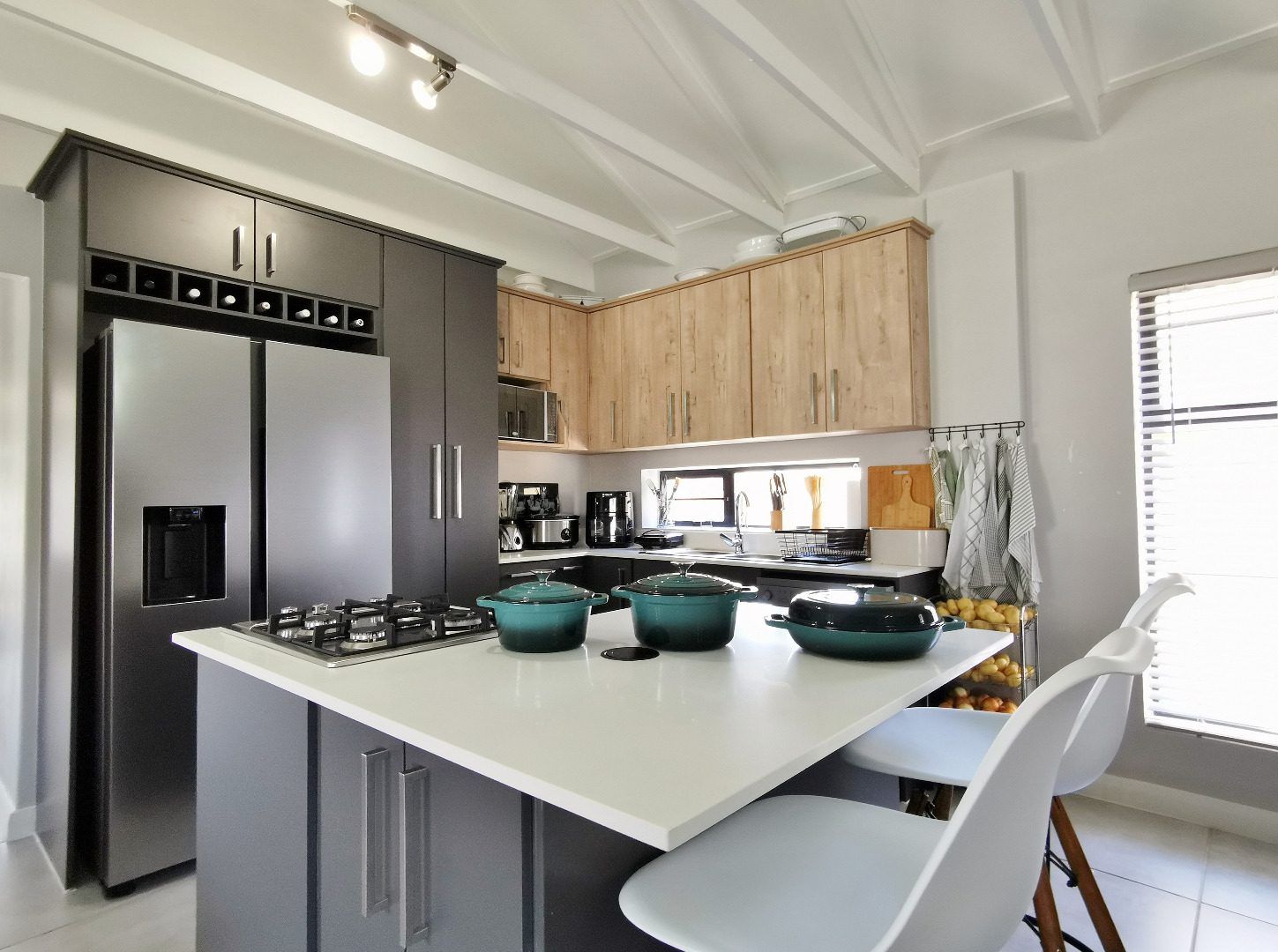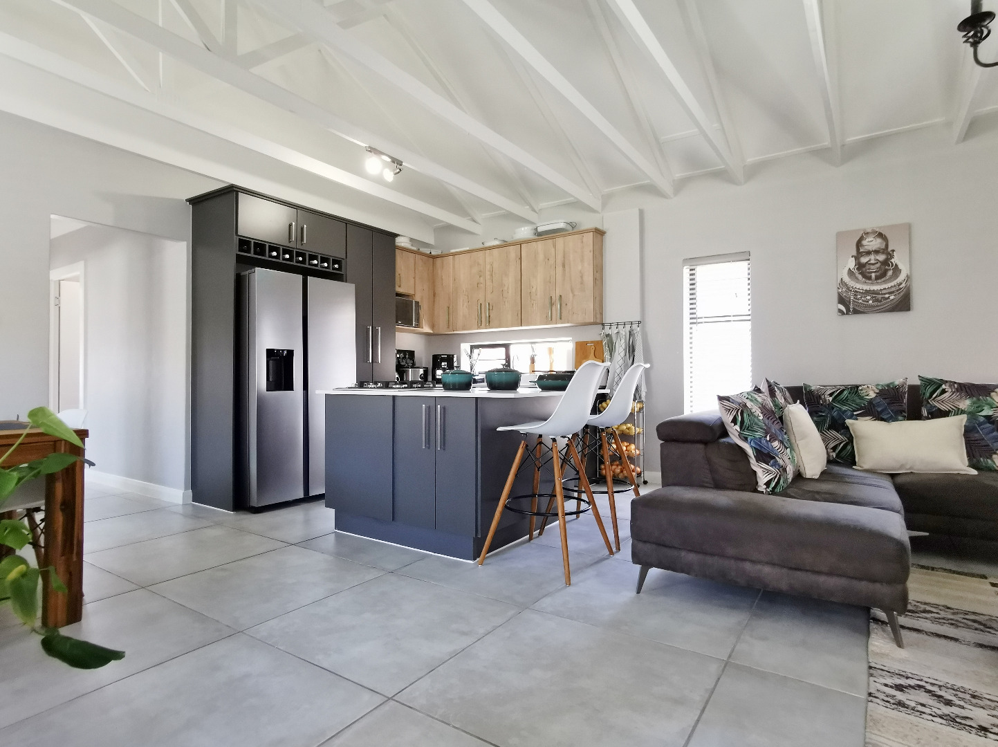 At the heart of the home is a stylish open-plan kitchen fitted with a centre island and breakfast counter, under-counter oven and gas hob, flowing seamlessly into the lounge and dining areas. Sliding doors open onto a covered patio deck with a built-in braai, creating an ideal entertainment space overlooking the enclosed garden.