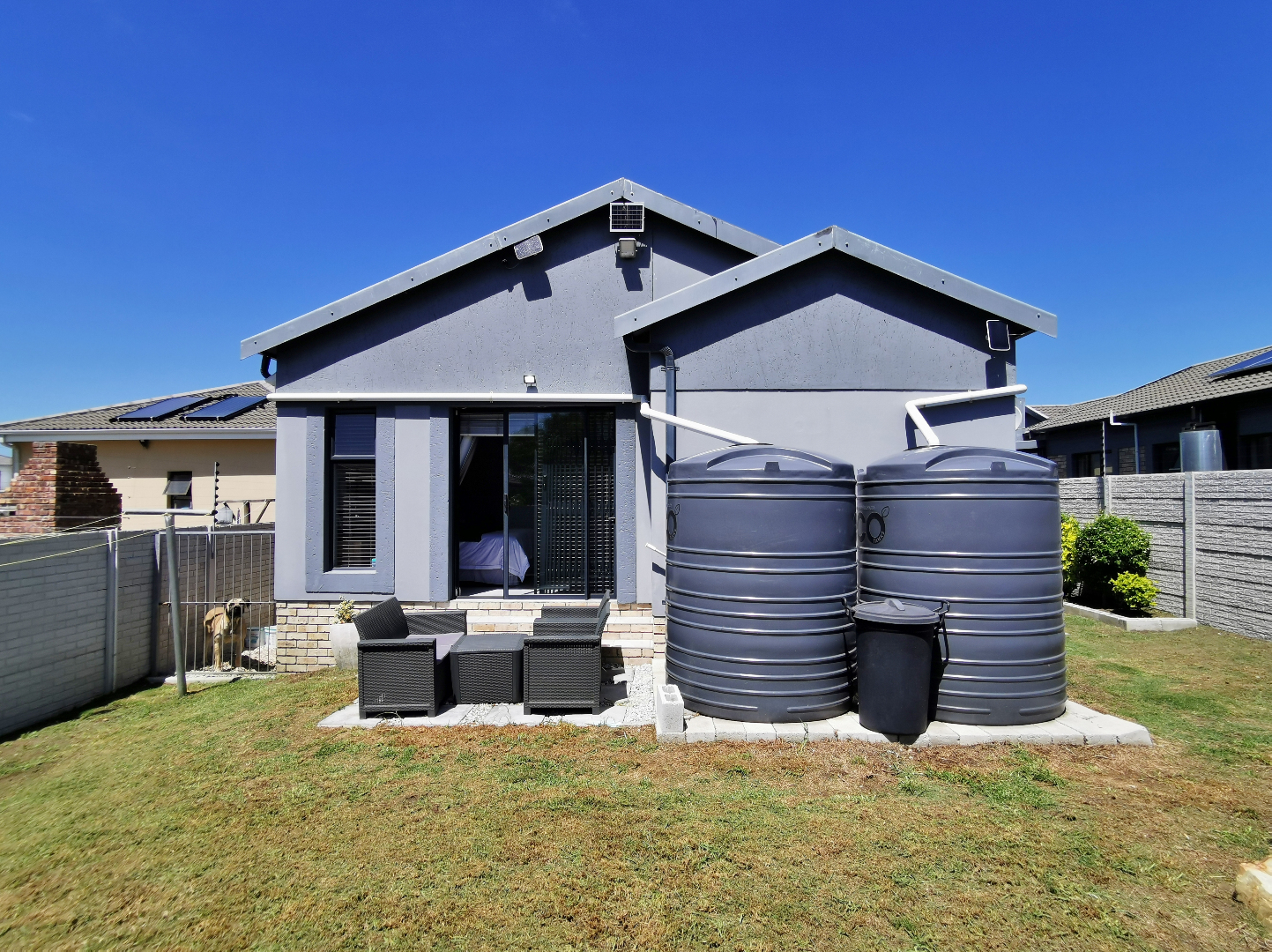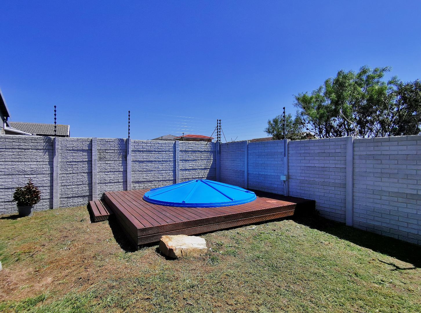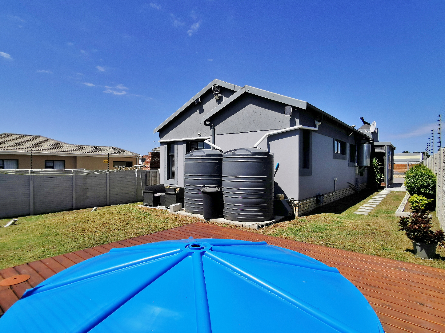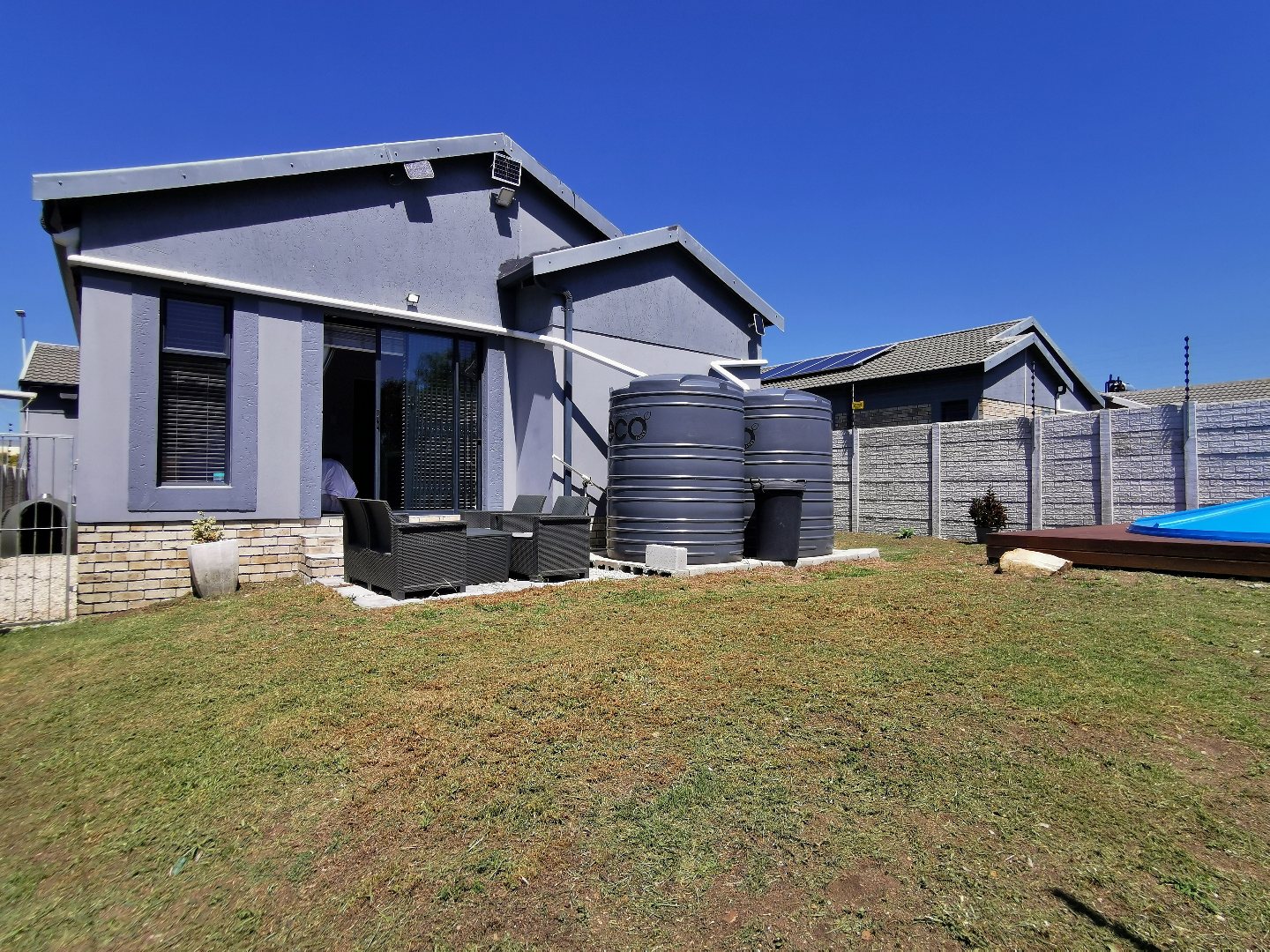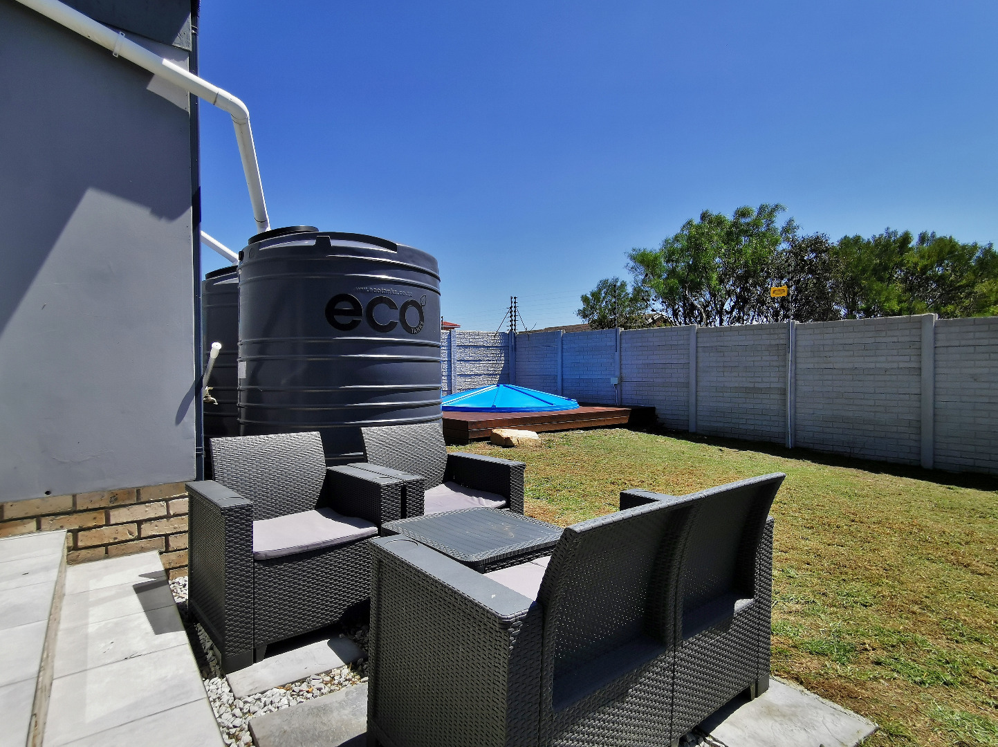The private backyard includes a splash pool set on a deck, while the main bedroom enjoys direct access to the garden via sliding doors and a small private patio.
