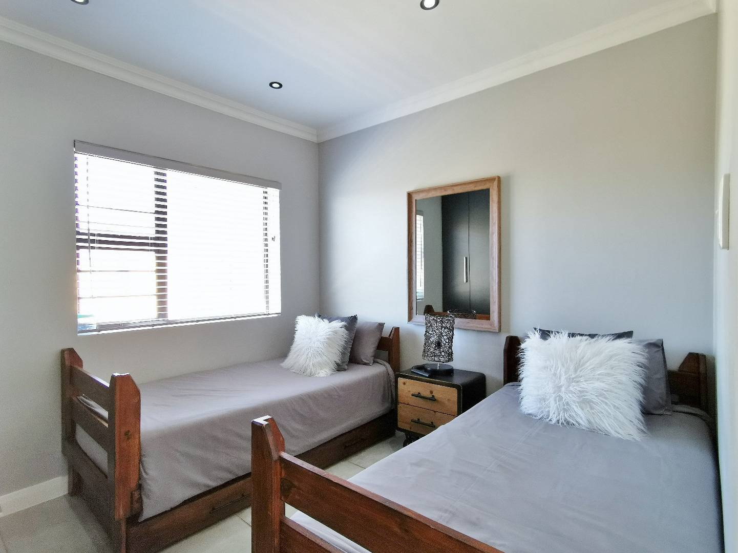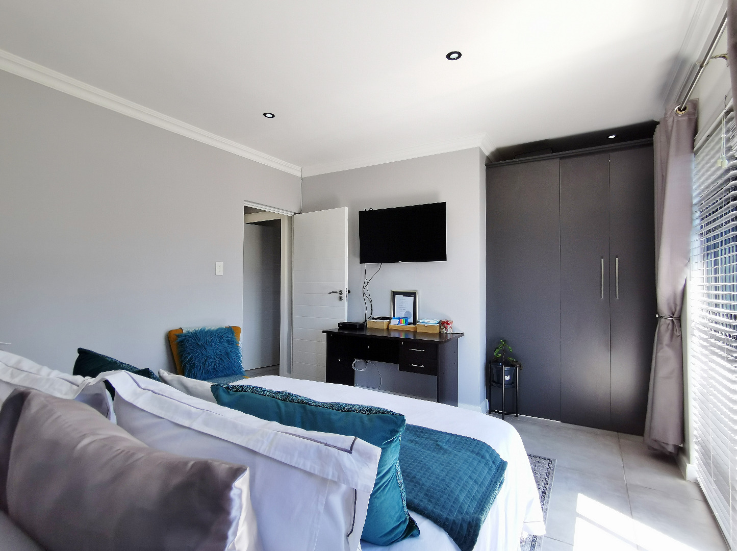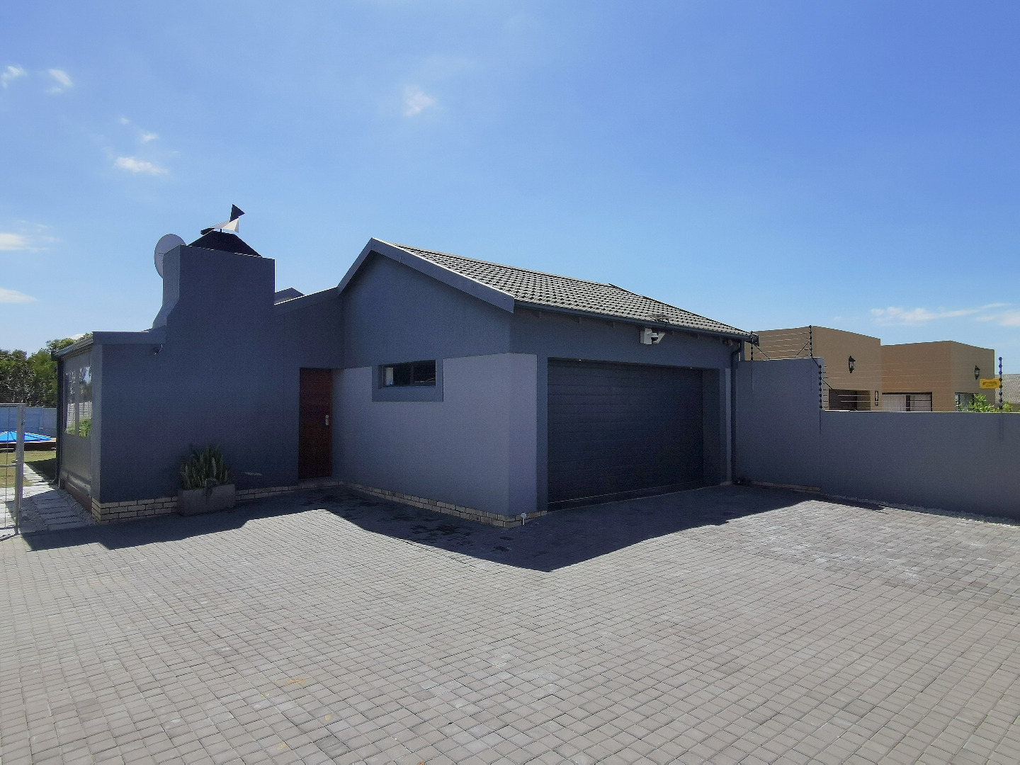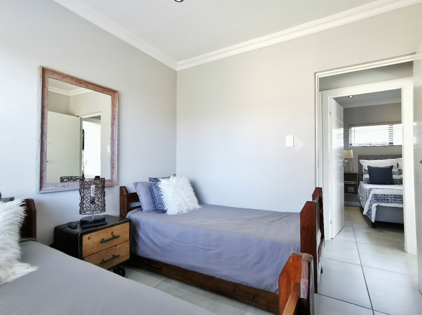 The home features three spacious bedrooms and two bathrooms (main en-suite accessed through a walk-in dressing area). Tiled throughout, the property presents a clean, contemporary feel with low-maintenance finishes.
