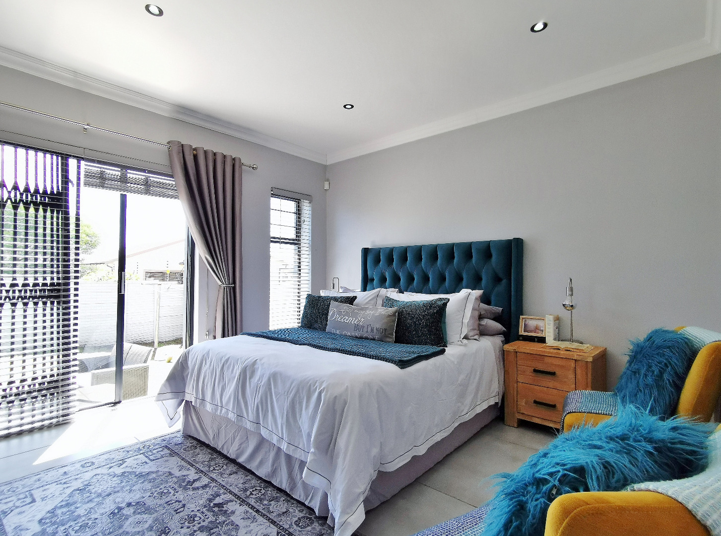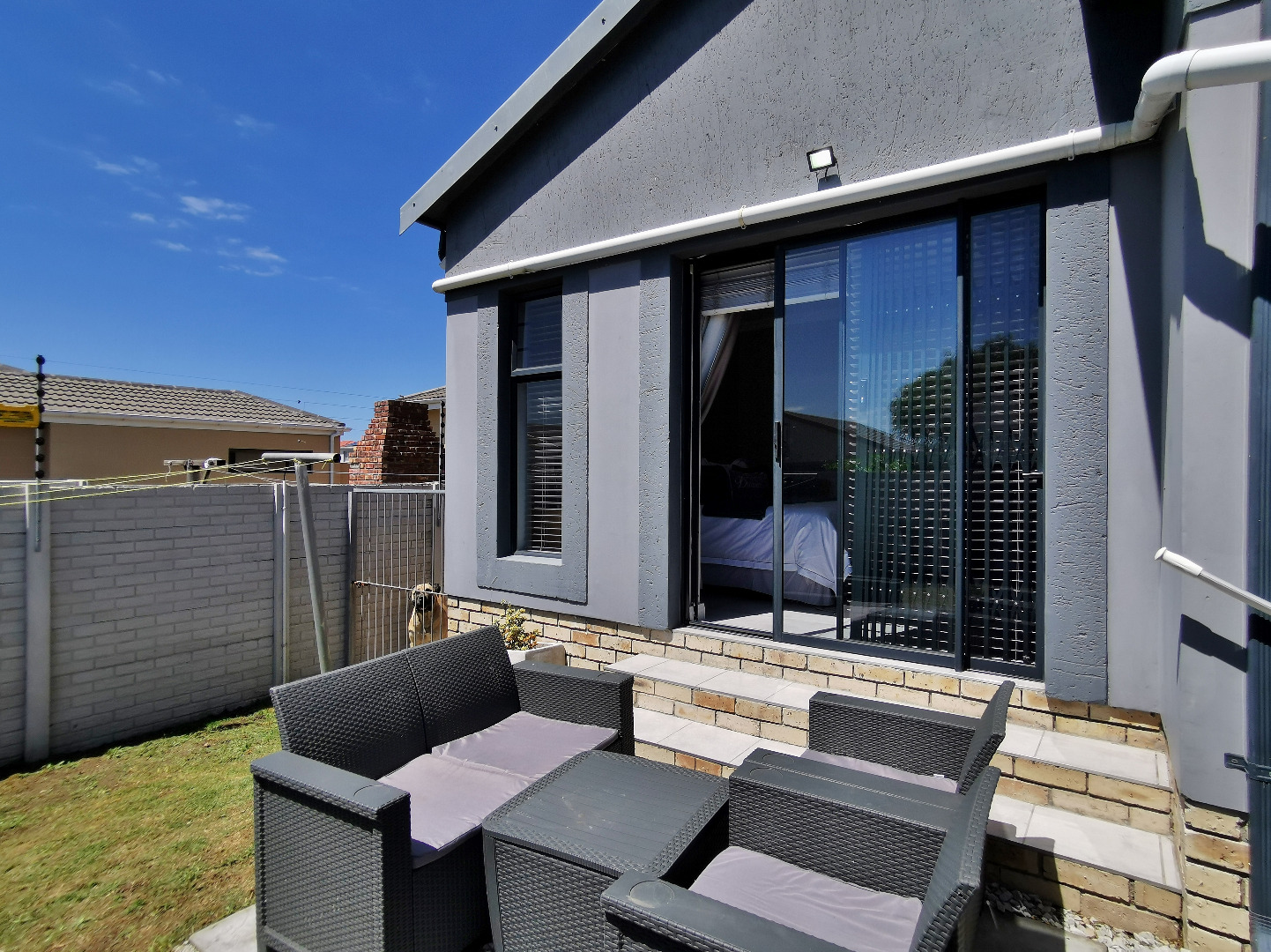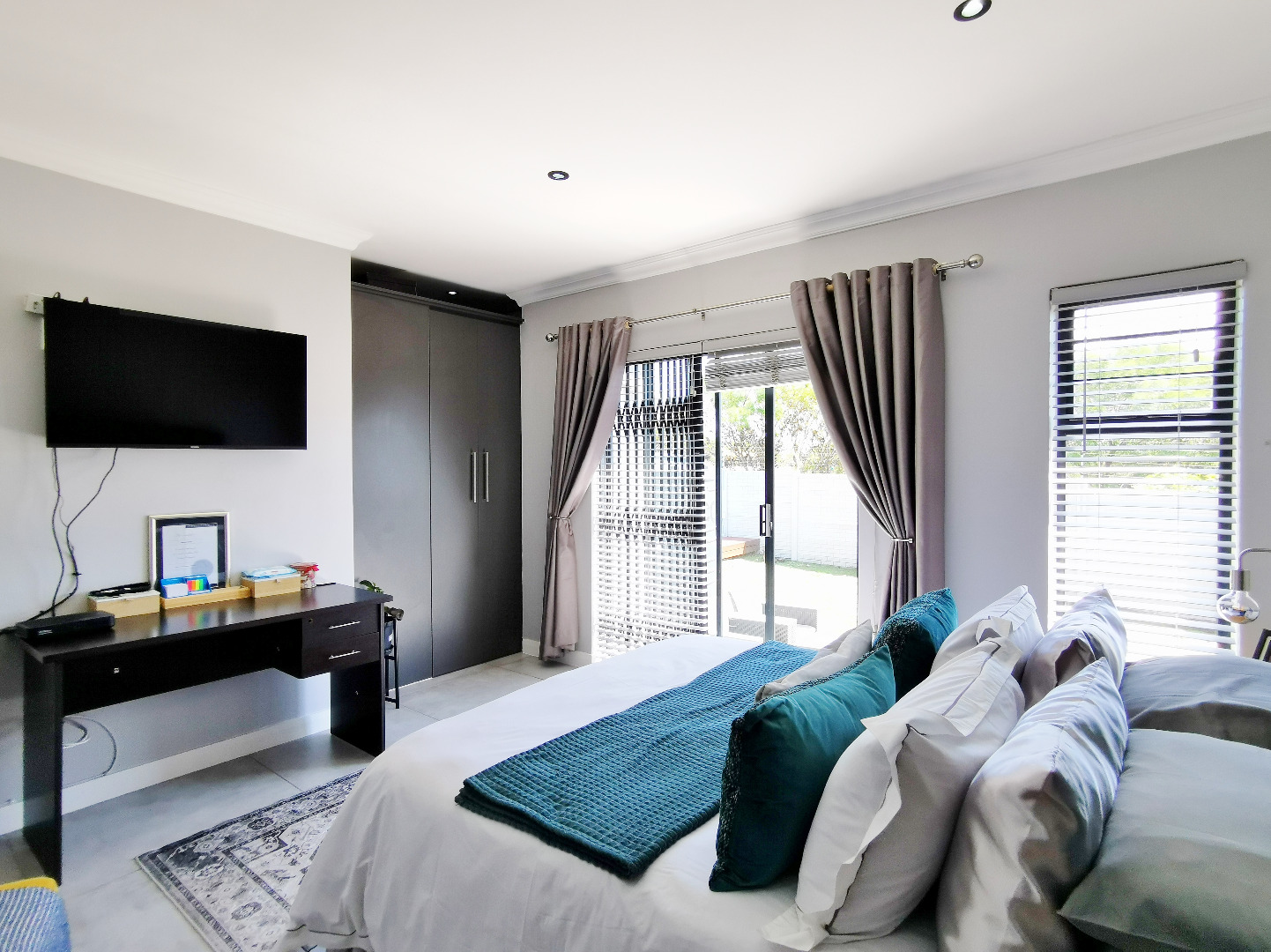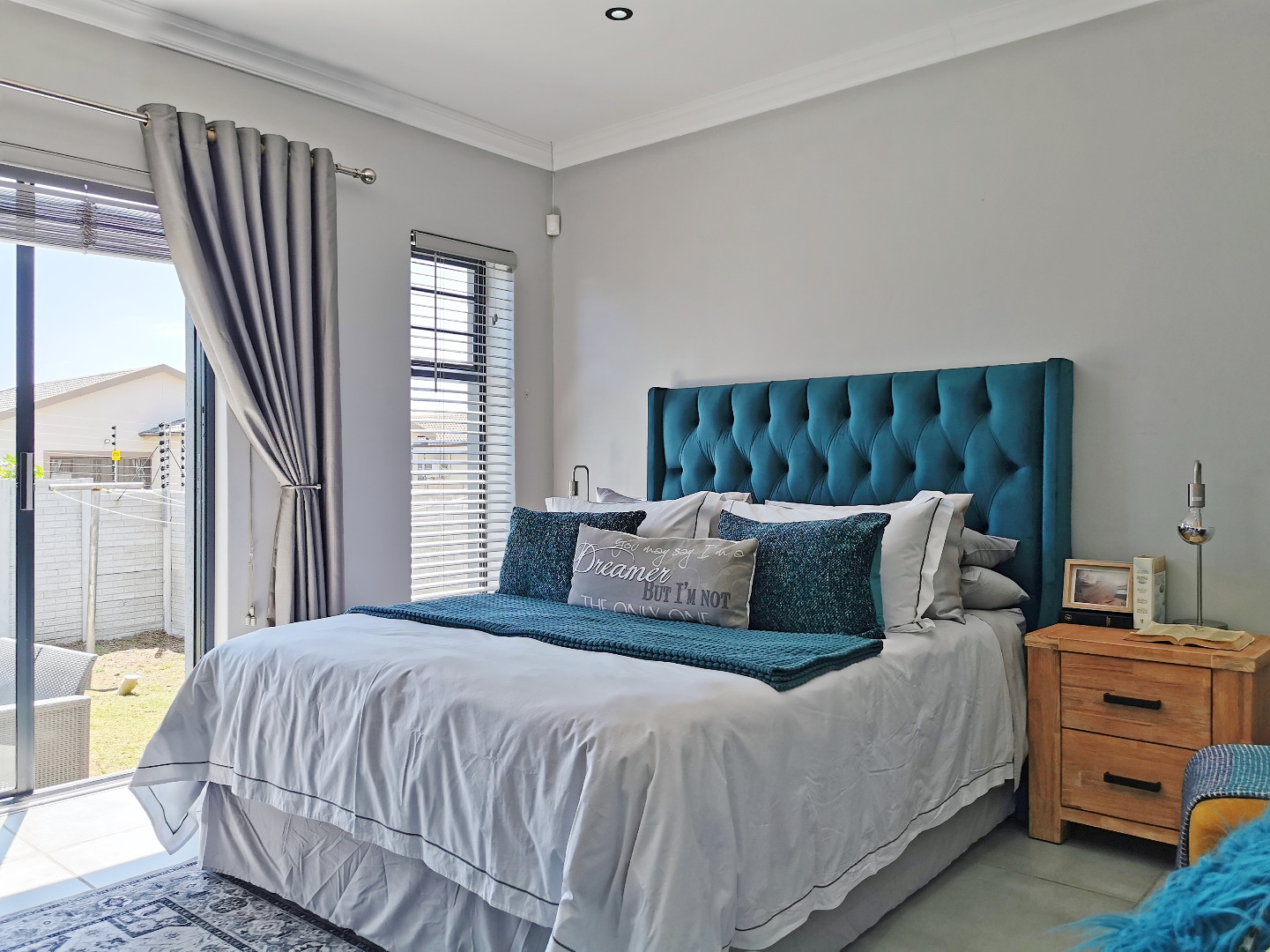 The home features three spacious bedrooms and two bathrooms (main en-suite accessed through a walk-in dressing area). Tiled throughout, the property presents a clean, contemporary feel with low-maintenance finishes.