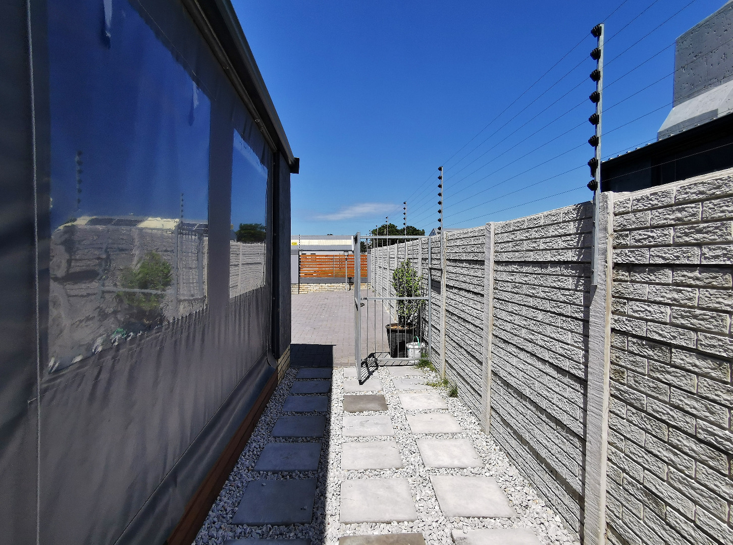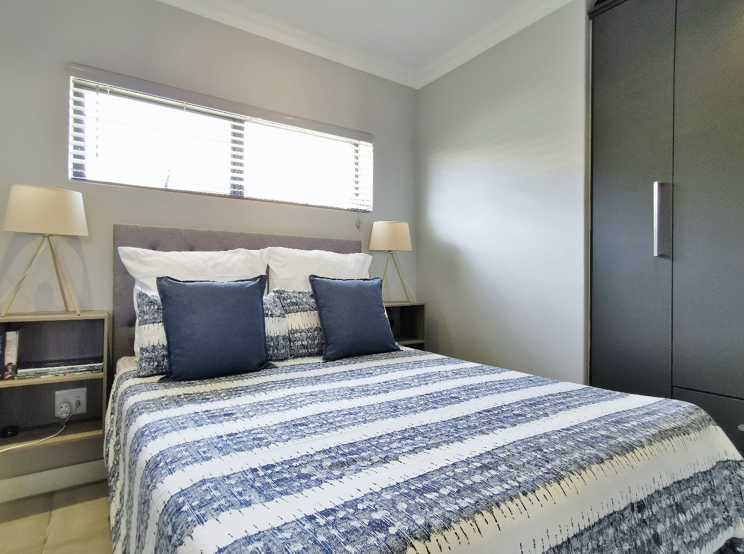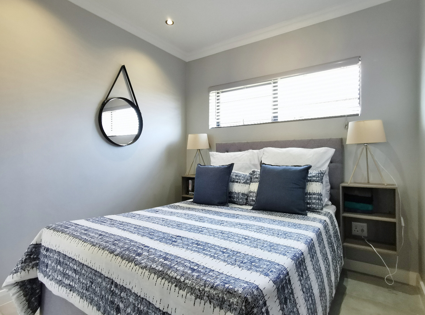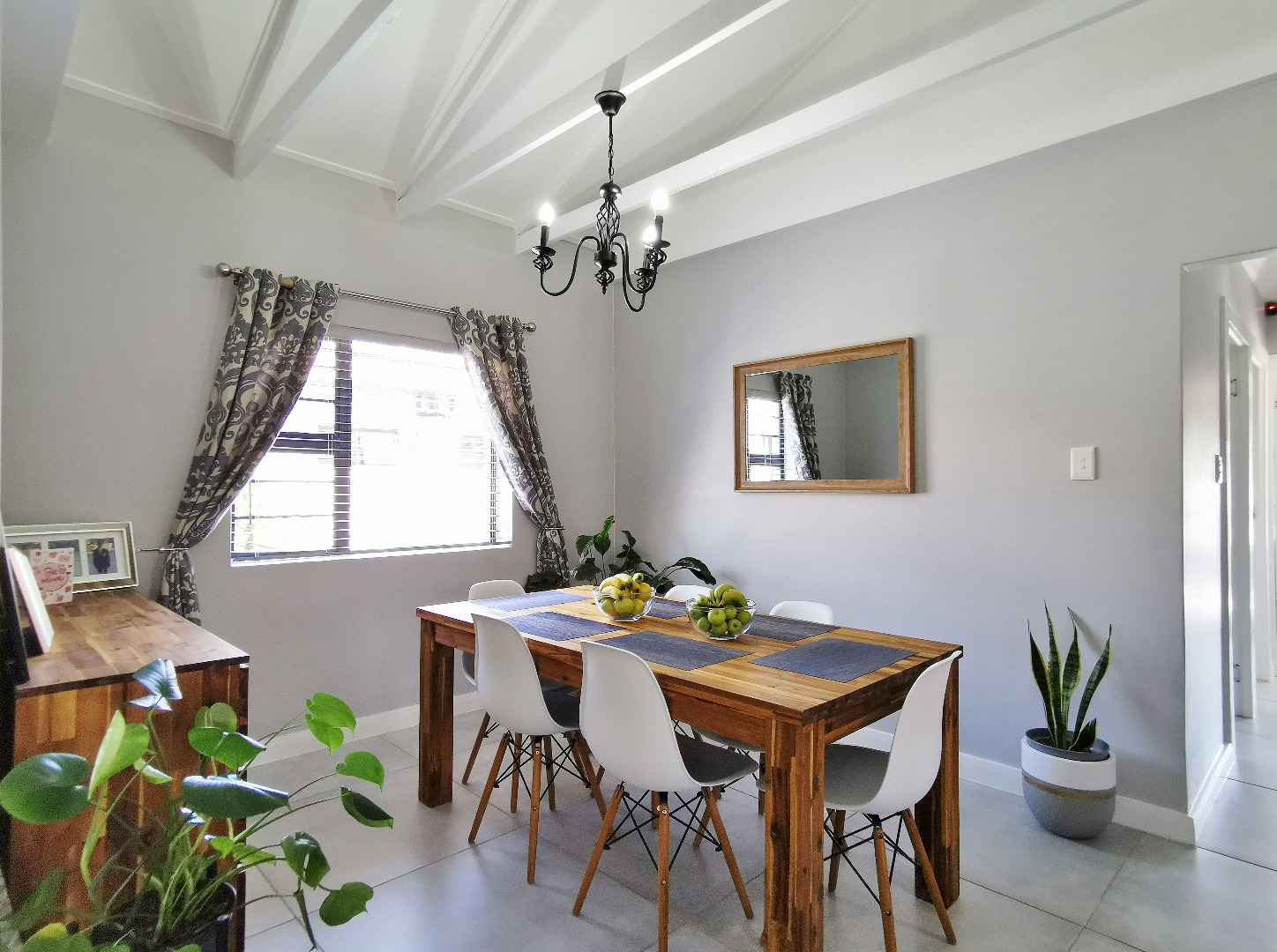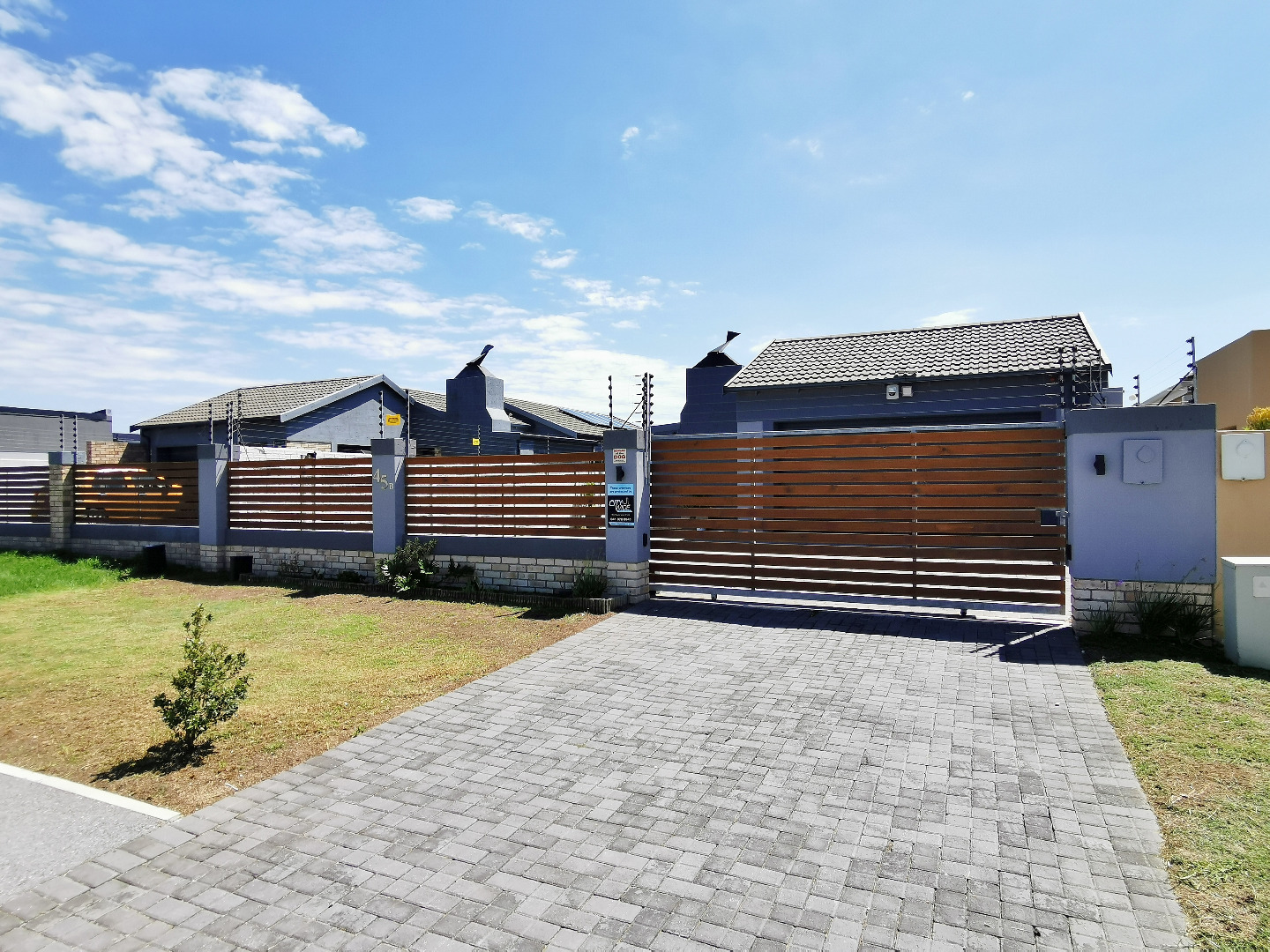 The home features three spacious bedrooms and two bathrooms (main en-suite accessed through a walk-in dressing area). Tiled throughout, the property presents a clean, contemporary feel with low-maintenance finishes.