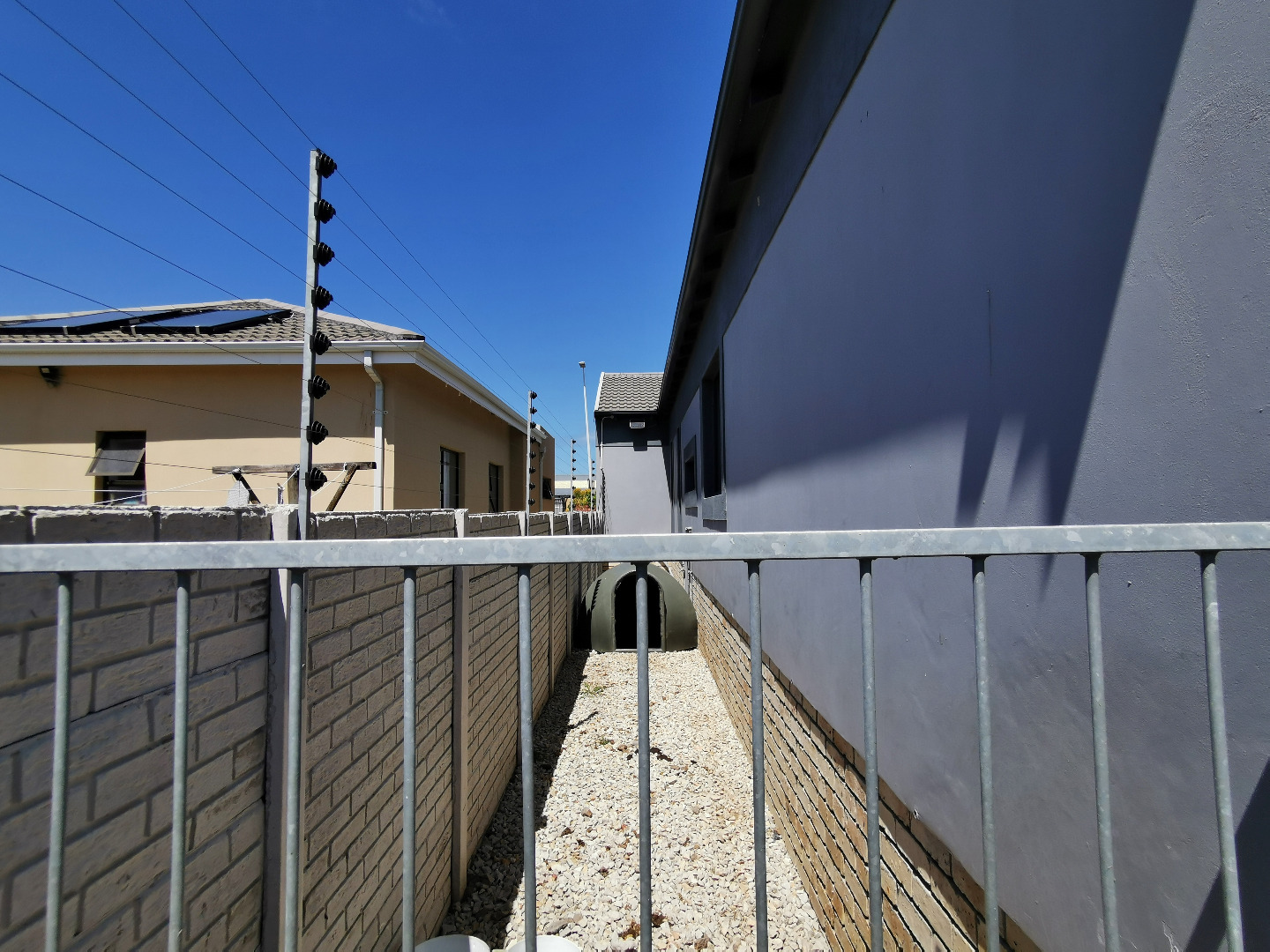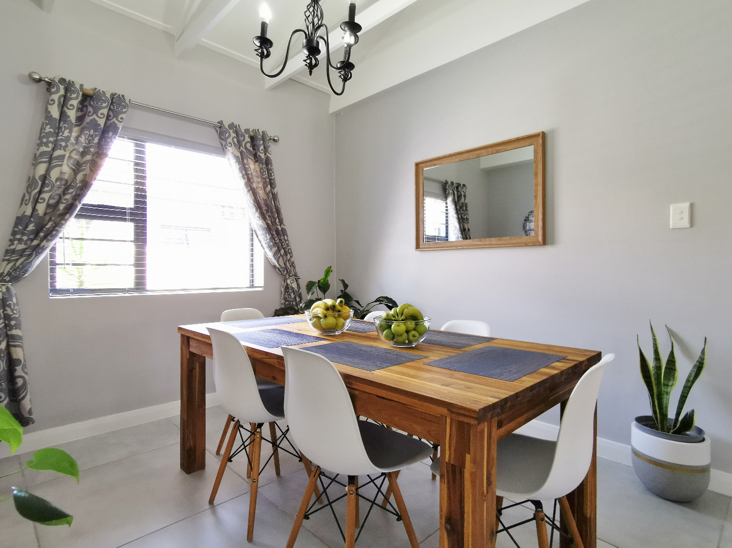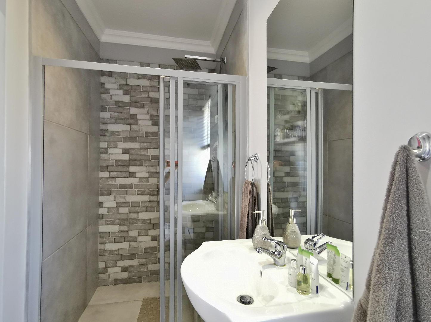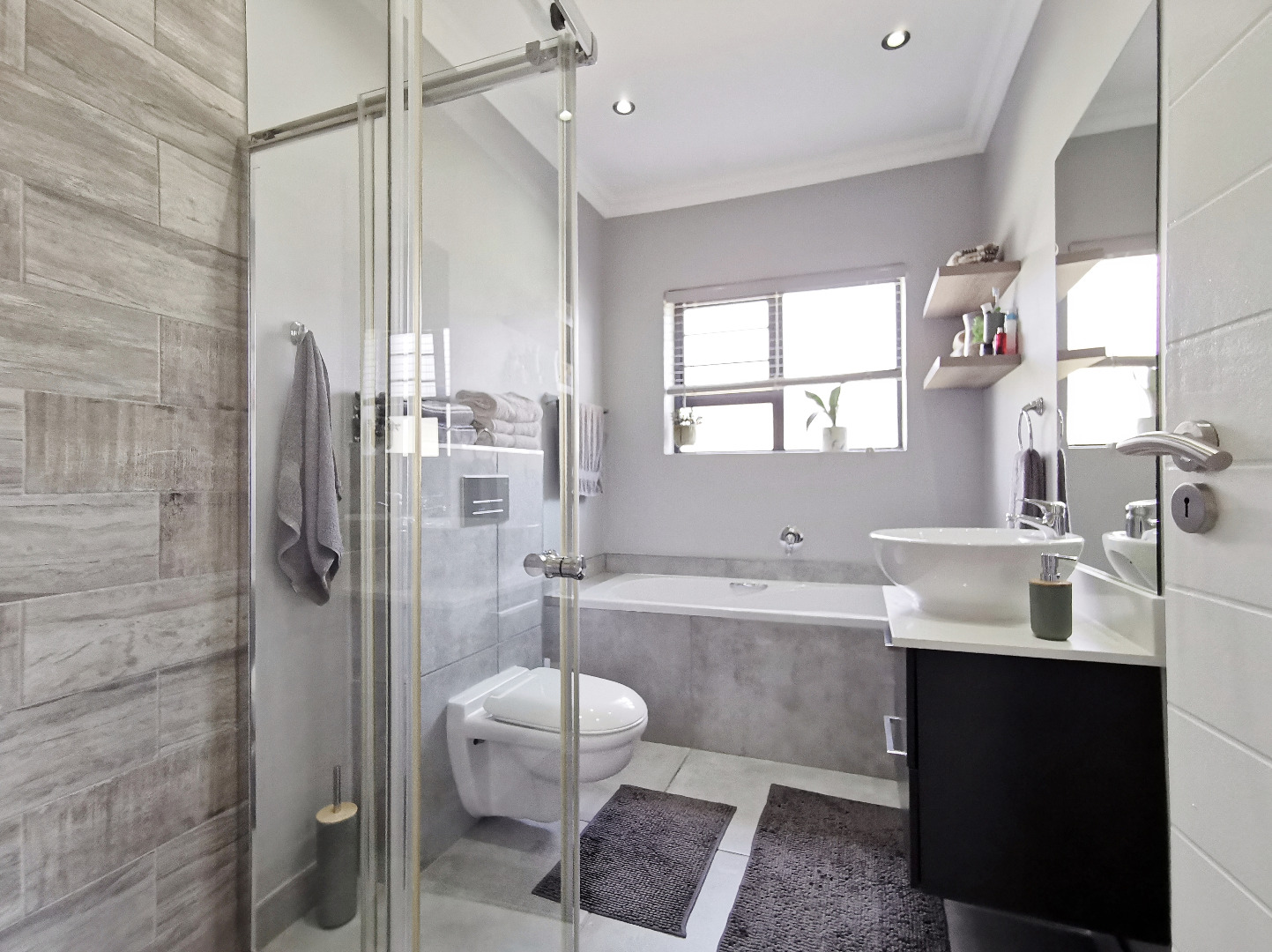 The home features three spacious bedrooms and two bathrooms (main en-suite accessed through a walk-in dressing area). Tiled throughout, the property presents a clean, contemporary feel with low-maintenance finishes.