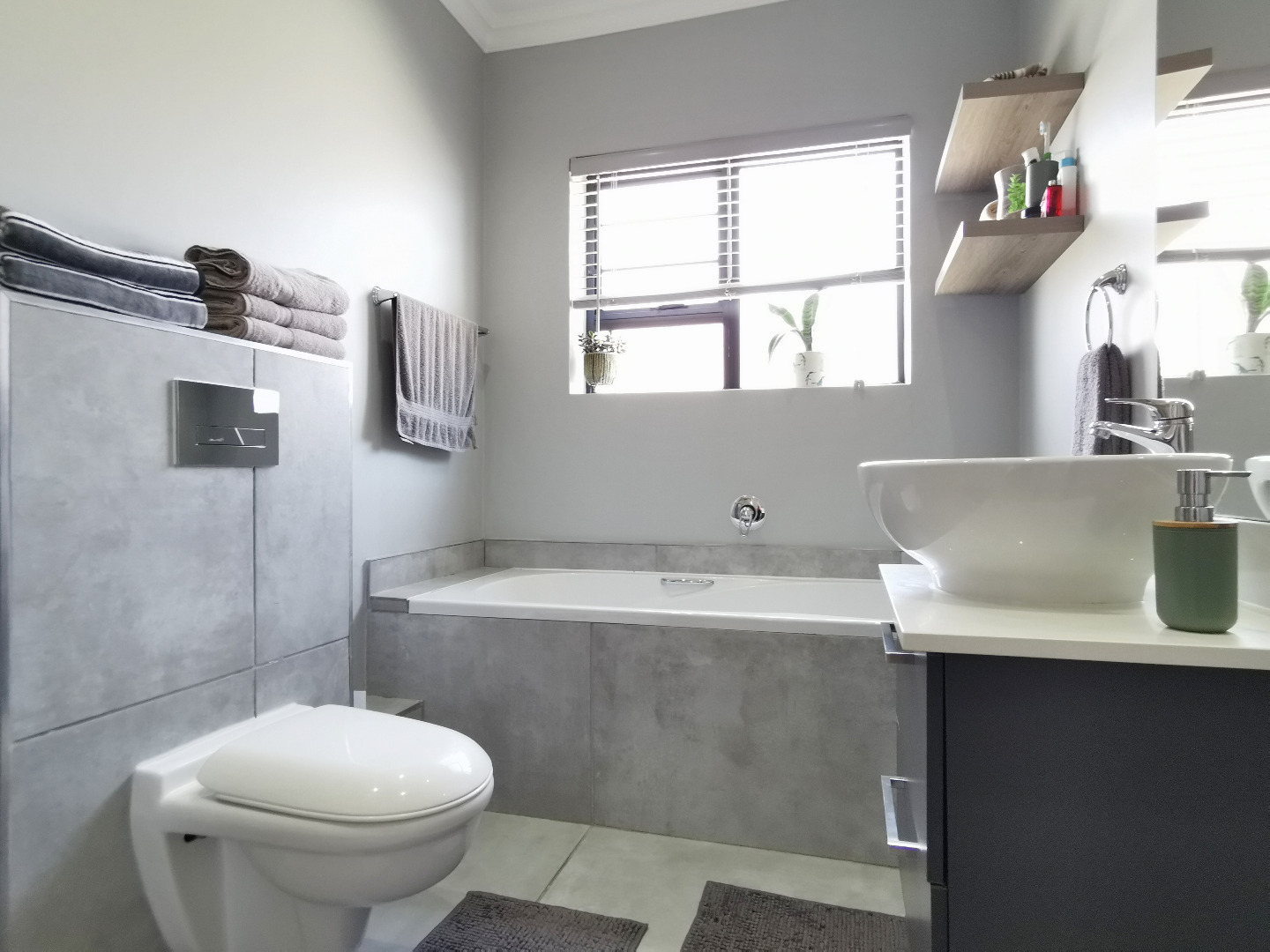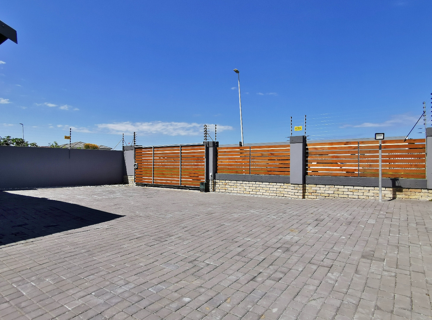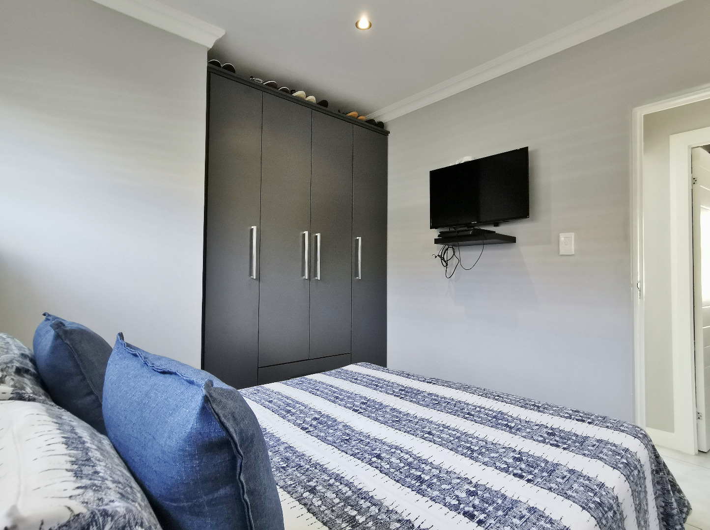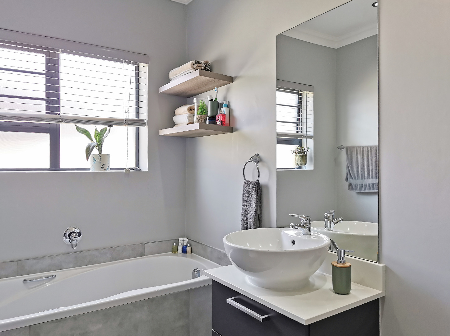 The home features three spacious bedrooms and two bathrooms (main en-suite accessed through a walk-in dressing area). Tiled throughout, the property presents a clean, contemporary feel with low-maintenance finishes.