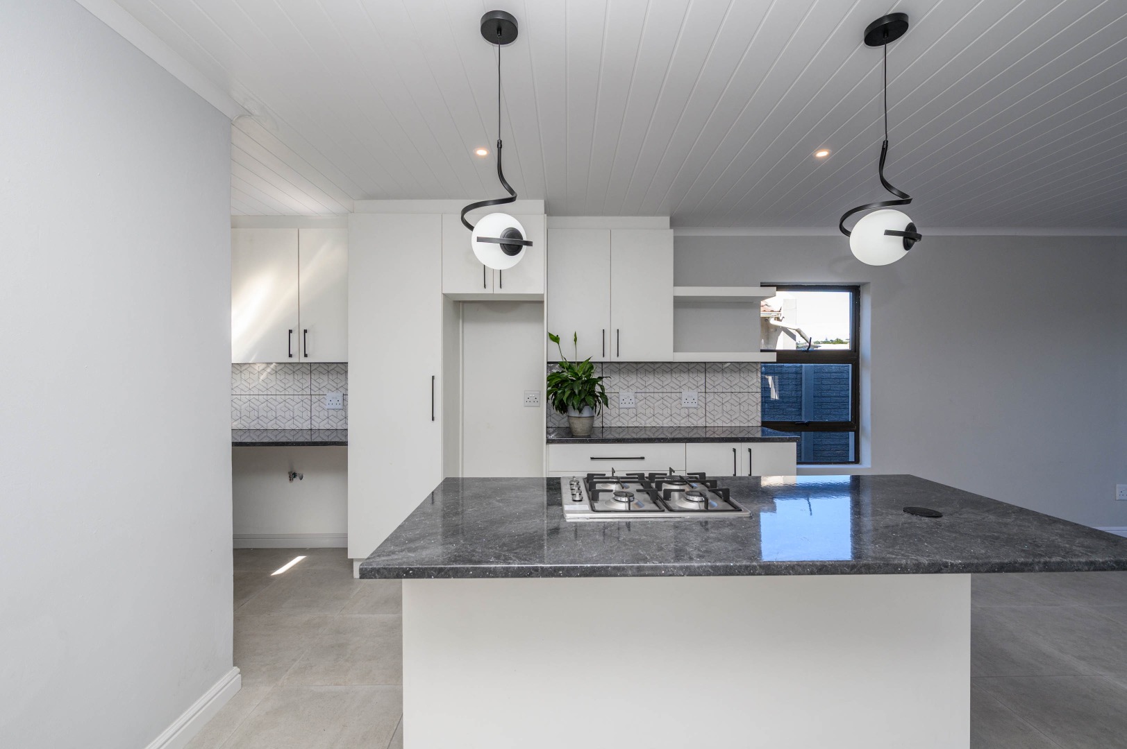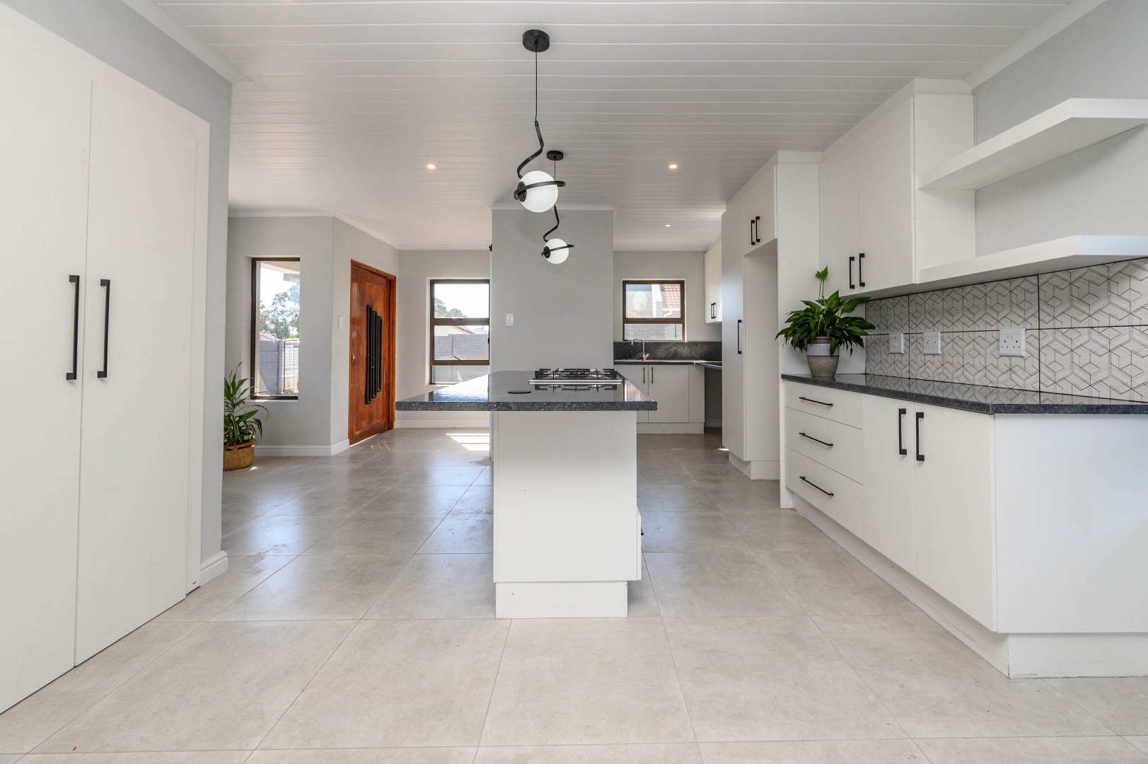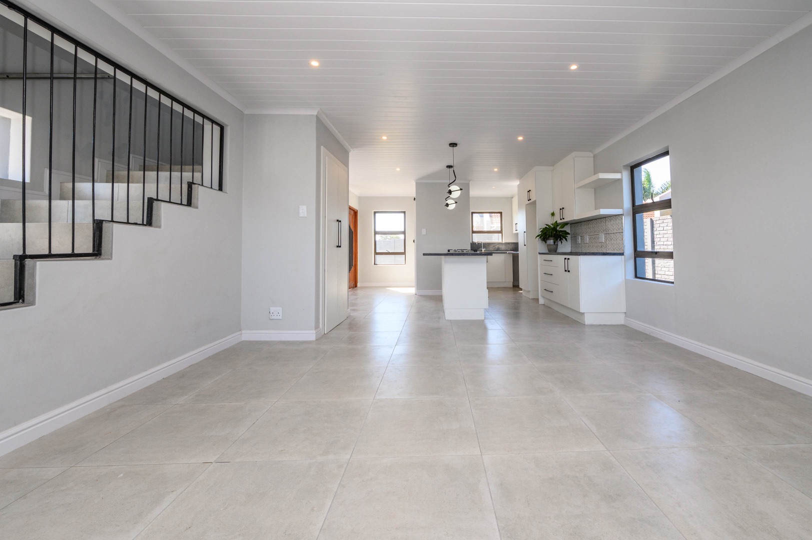 The interior boasts an inviting open-plan layout, seamlessly connecting the living areas with a modern kitchen. The kitchen is a highlight, featuring sleek white cabinetry, dark speckled countertops, and a stylish geometric backsplash. A central island with an integrated gas hob, along with contemporary pendant and recessed lighting, creates a functional and appealing culinary space. Light-colored tiled flooring extends throughout, enhancing the bright and airy feel, while a modern black metal staircase railing adds a touch of sophistication.