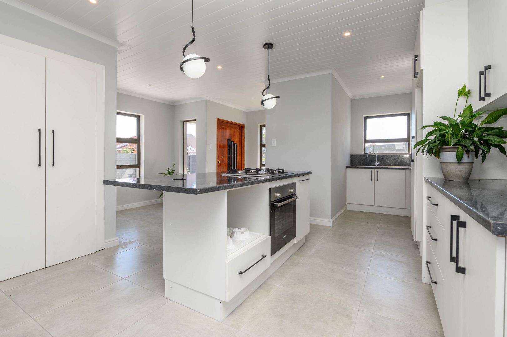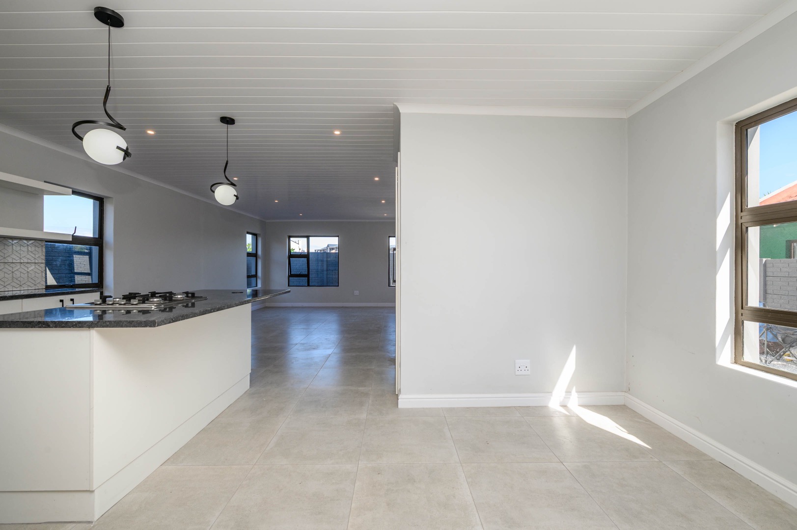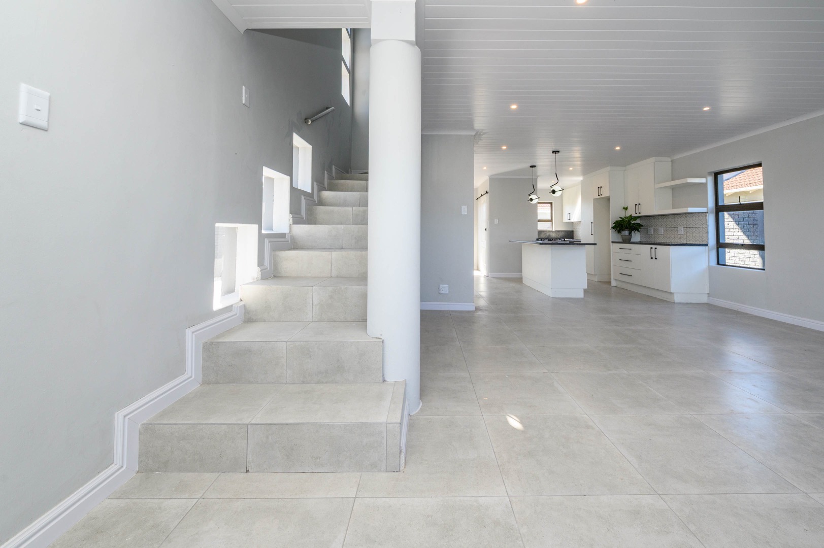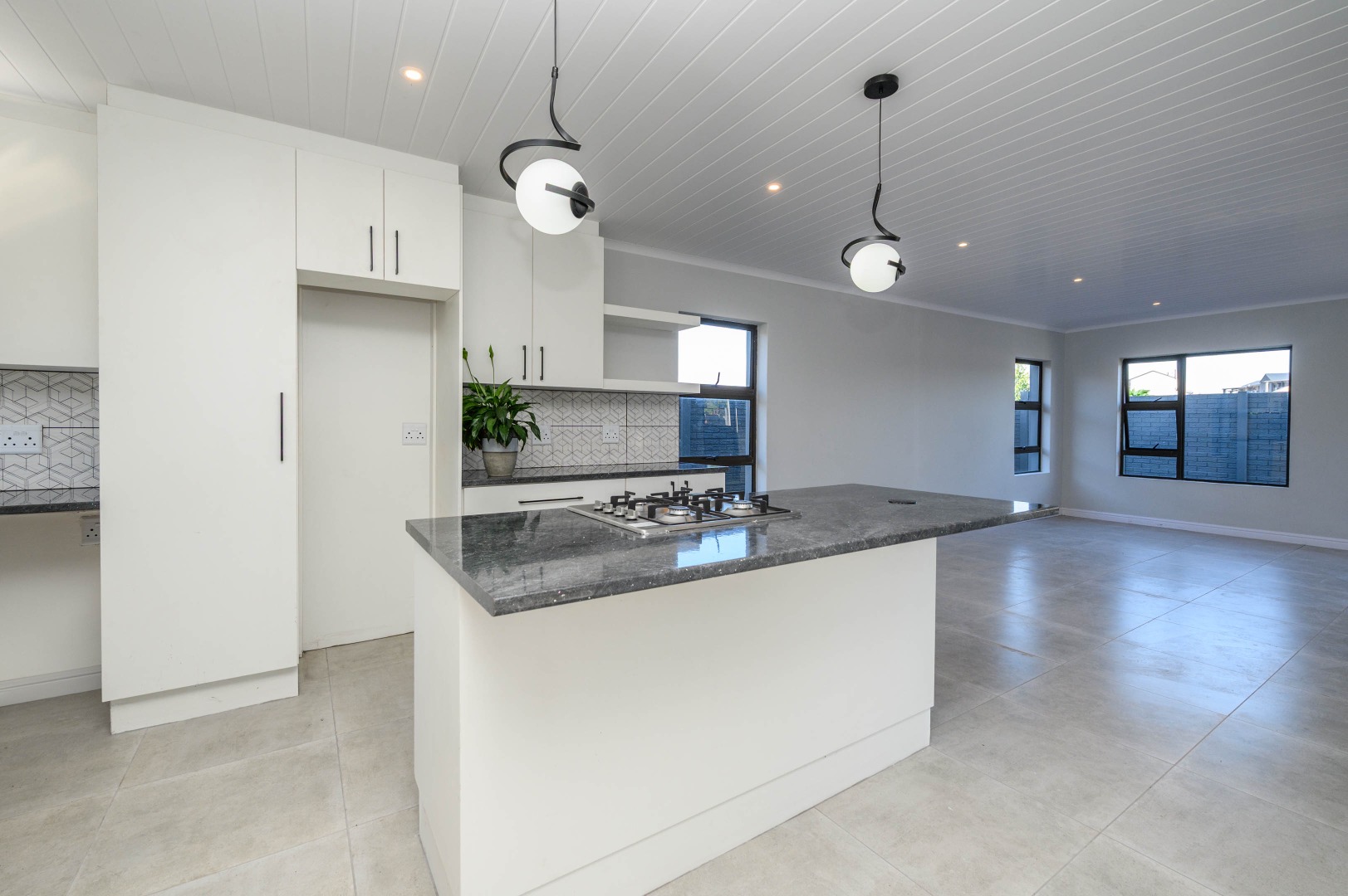 The interior boasts an inviting open-plan layout, seamlessly connecting the living areas with a modern kitchen. The kitchen is a highlight, featuring sleek white cabinetry, dark speckled countertops, and a stylish geometric backsplash. A central island with an integrated gas hob, along with contemporary pendant and recessed lighting, creates a functional and appealing culinary space. Light-colored tiled flooring extends throughout, enhancing the bright and airy feel, while a modern black metal staircase railing adds a touch of sophistication.