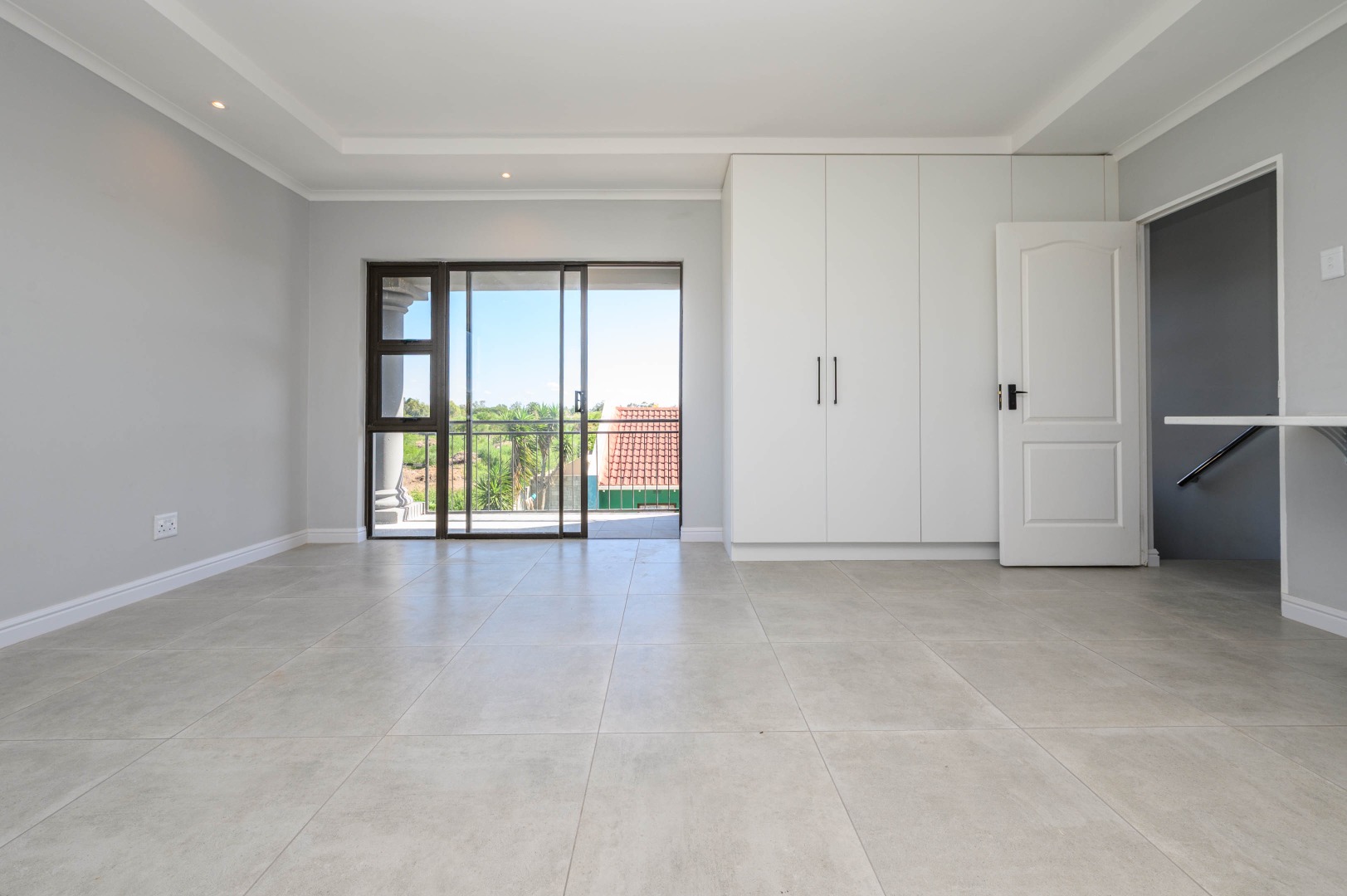 * Neutral grey walls and modern lighting