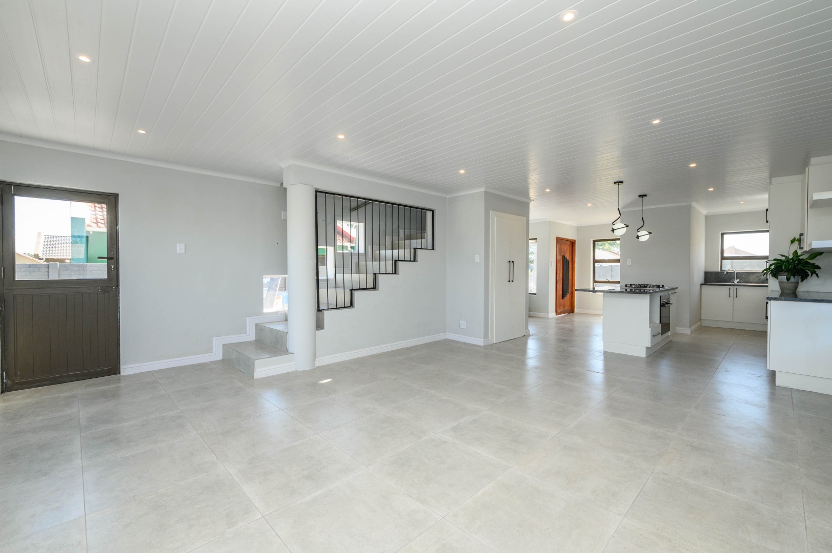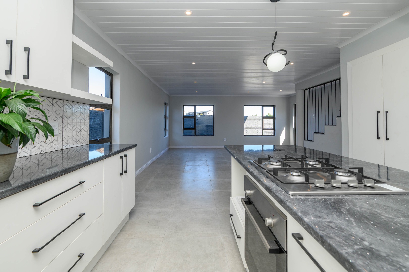The interior boasts an inviting open-plan layout, seamlessly connecting the living areas with a modern kitchen. The kitchen is a highlight, featuring sleek white cabinetry, dark speckled countertops, and a stylish geometric backsplash. A central island with an integrated gas hob, along with contemporary pendant and recessed lighting, creates a functional and appealing culinary space. Light-colored tiled flooring extends throughout, enhancing the bright and airy feel, while a modern black metal staircase railing adds a touch of sophistication.