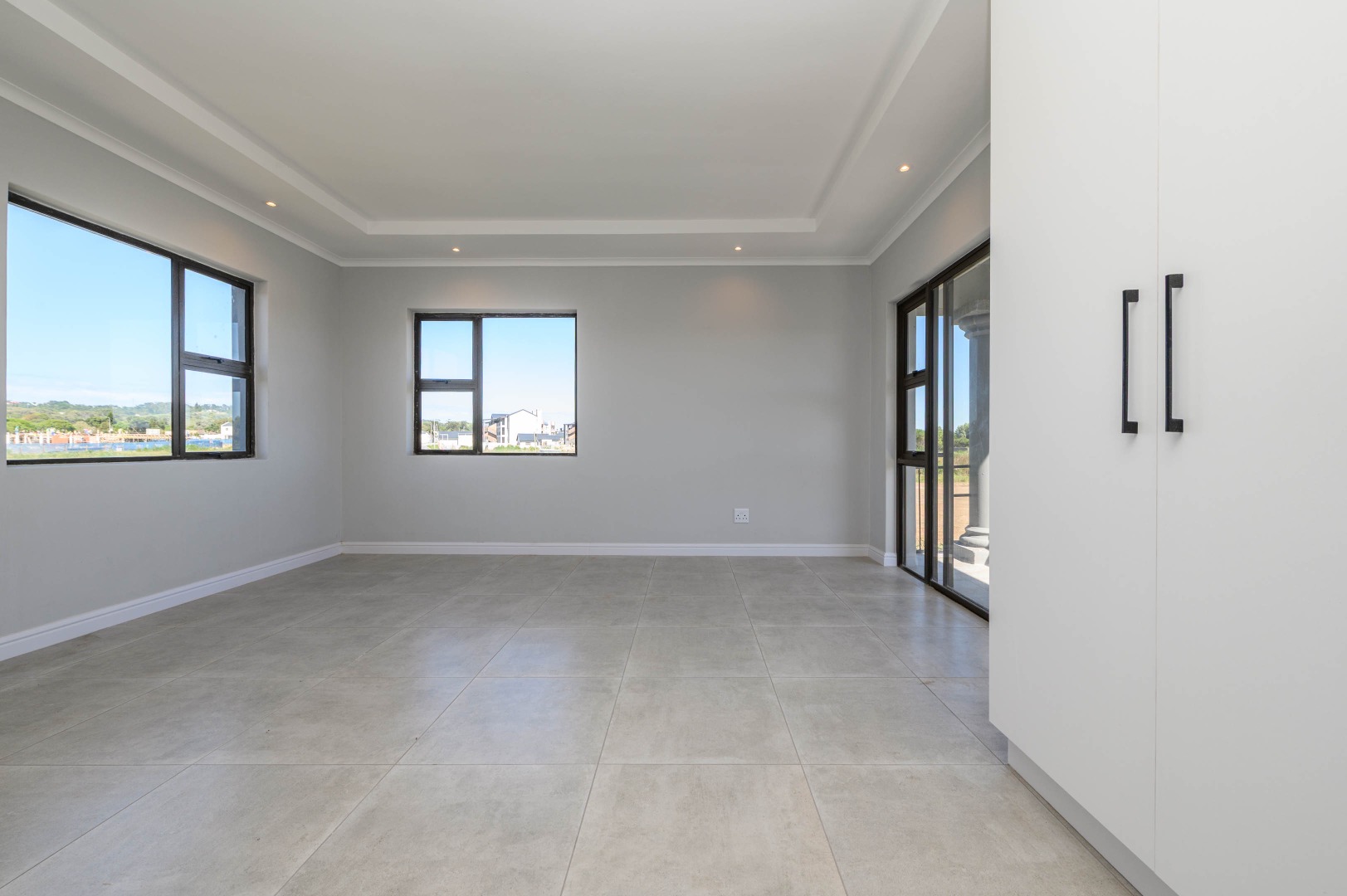 * Neutral grey walls and modern lighting