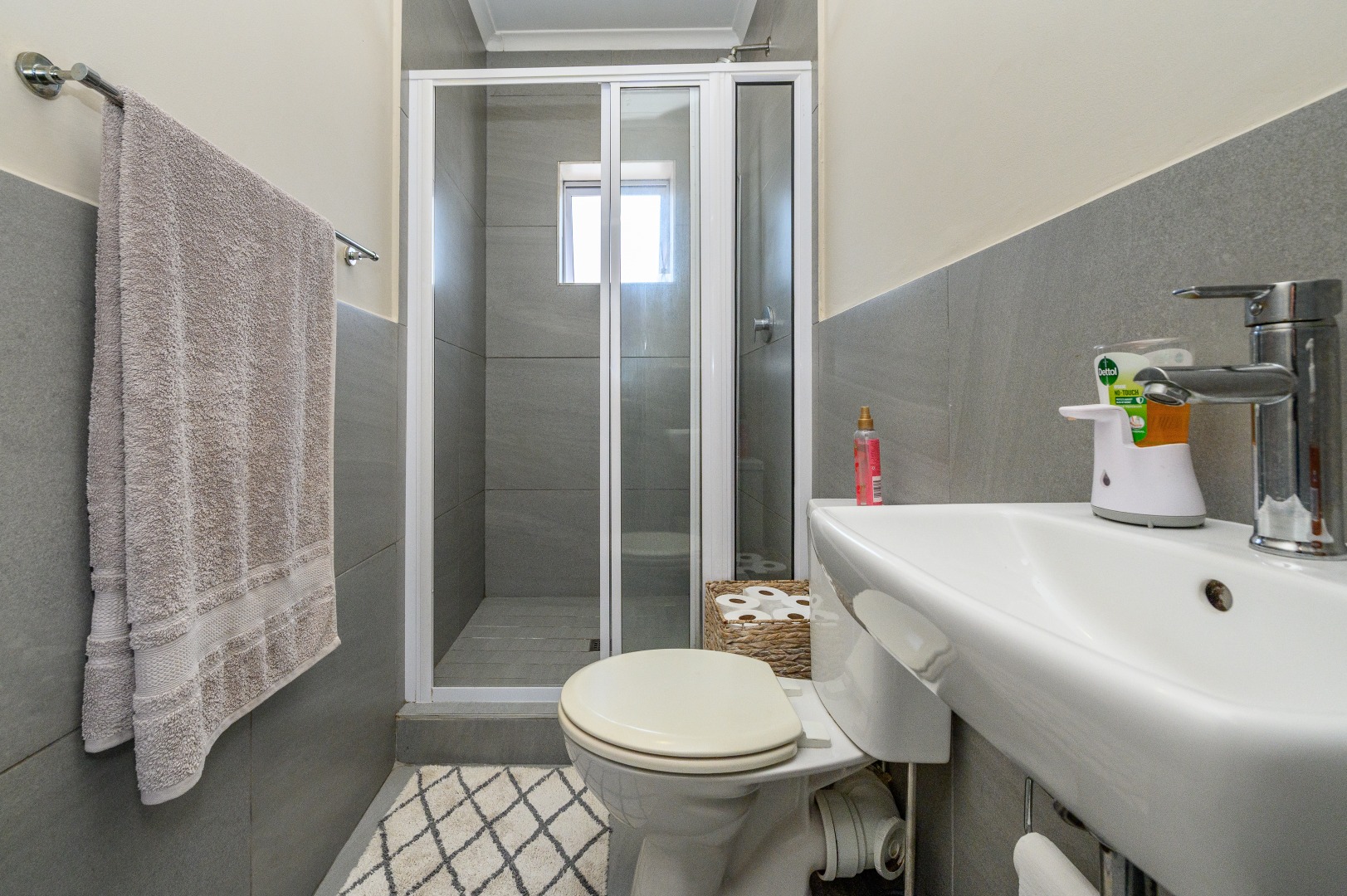 Two well-sized bedrooms share a full bathroom with bath and overhead shower