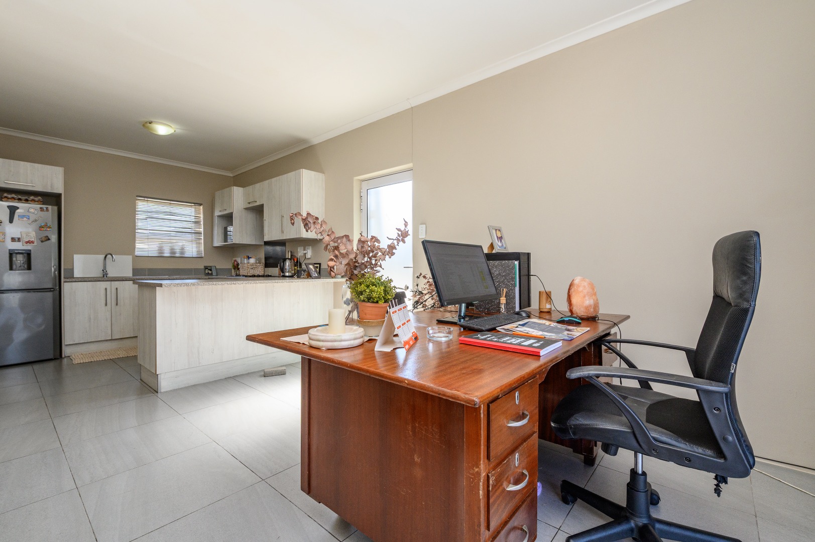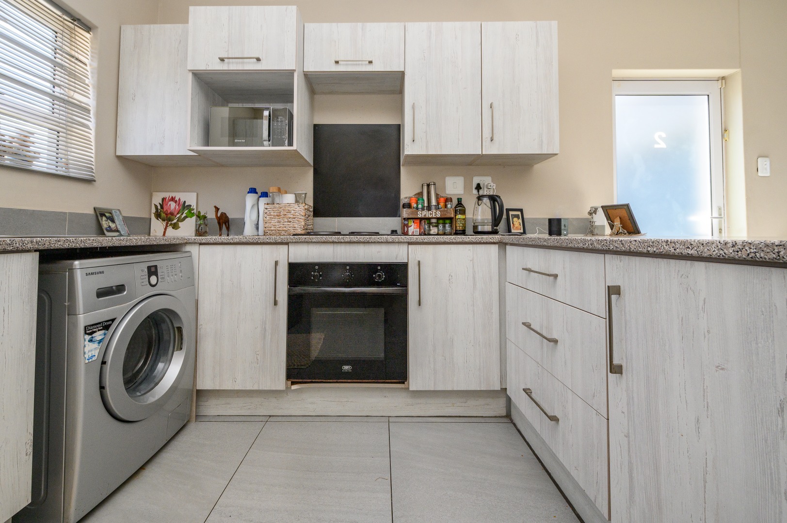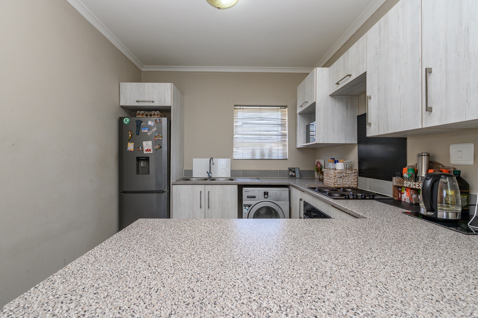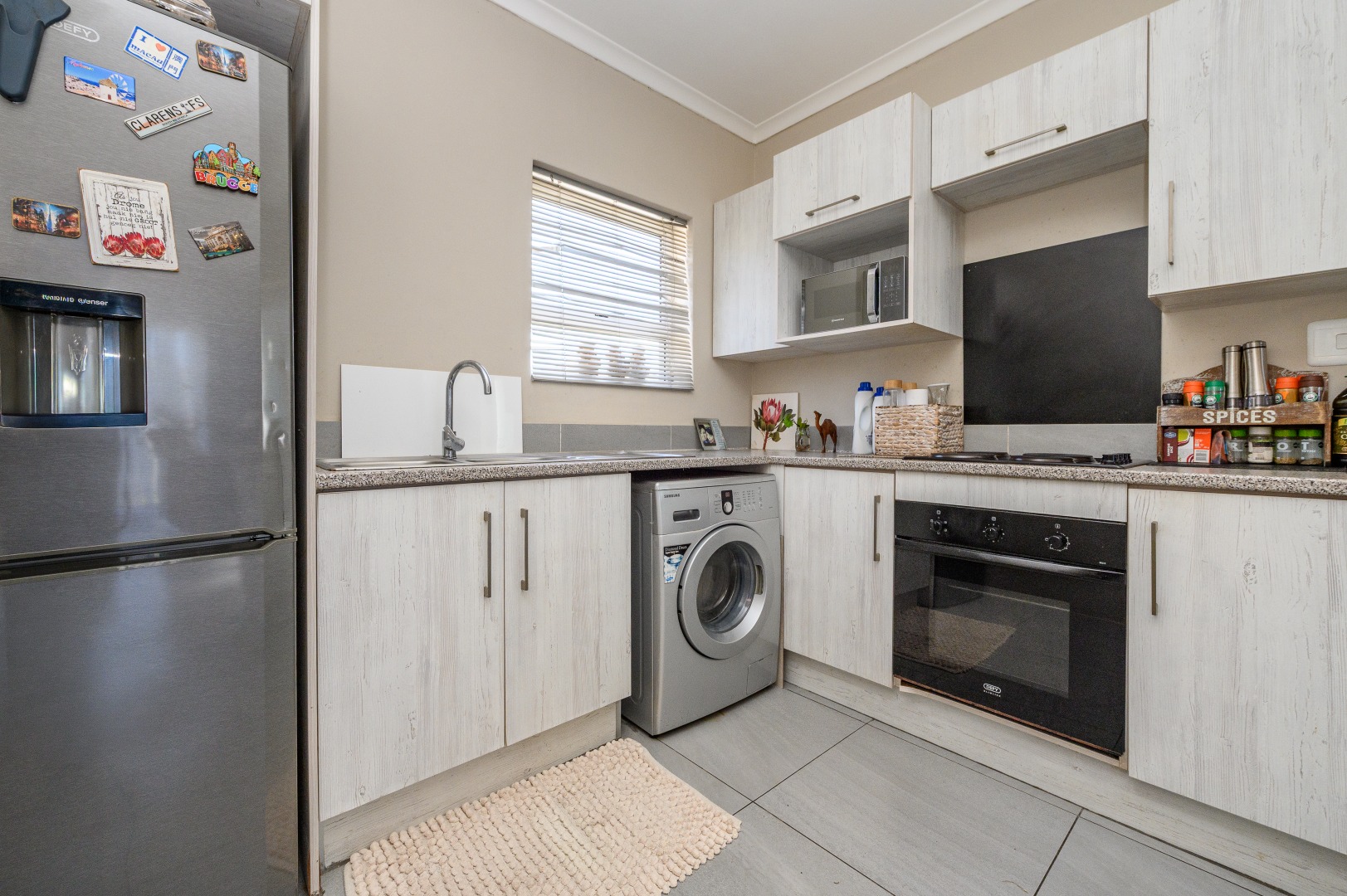 Step inside through a security front door into a light-filled open-plan lounge and kitchen. The kitchen is neatly finished and features an electric stove with undercounter oven and a large basin, perfect for everyday convenience.