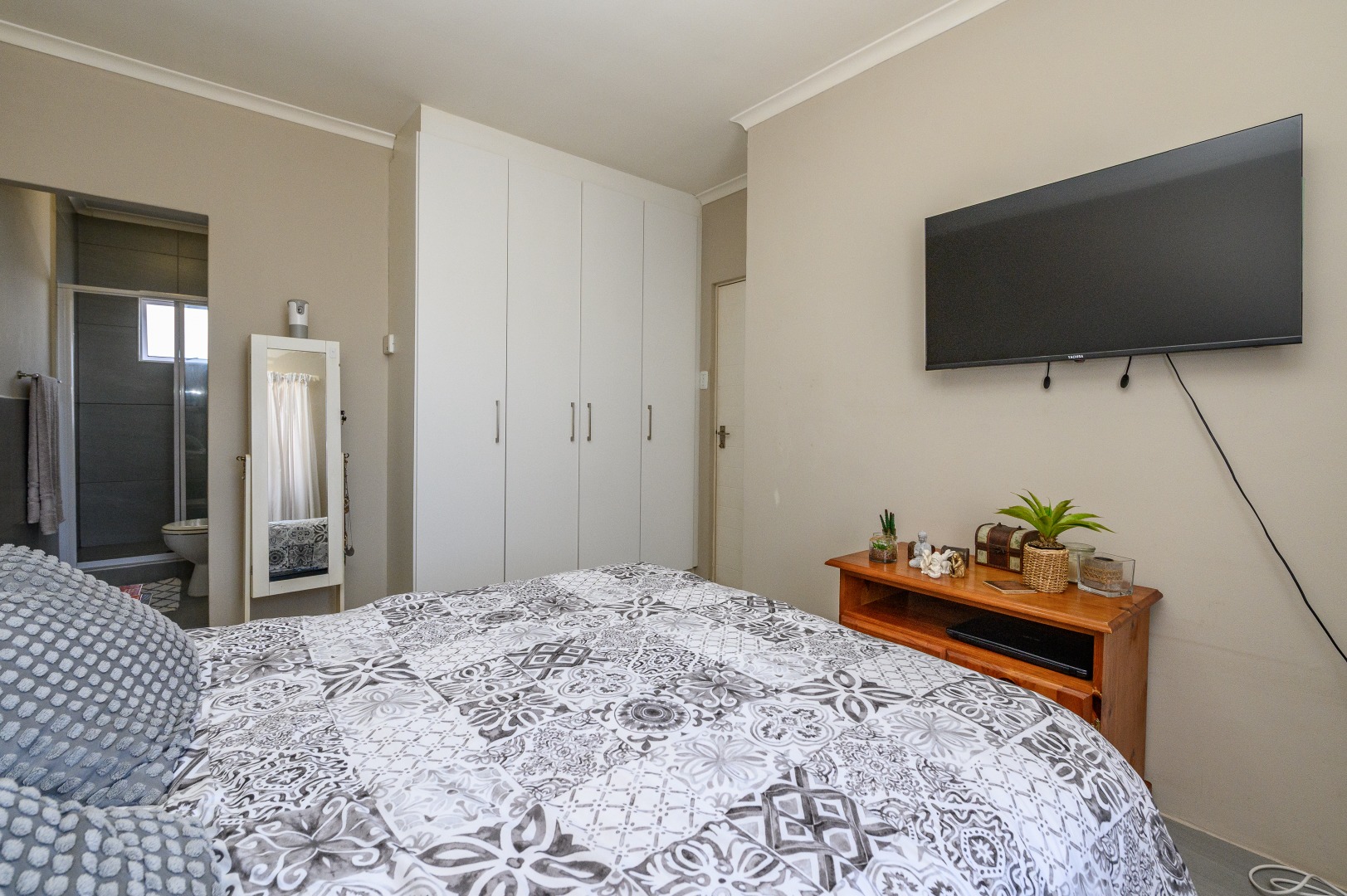 The main bedroom is spacious and includes its own en-suite bathroom with a shower