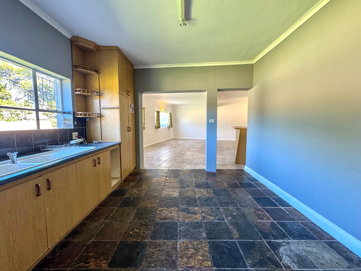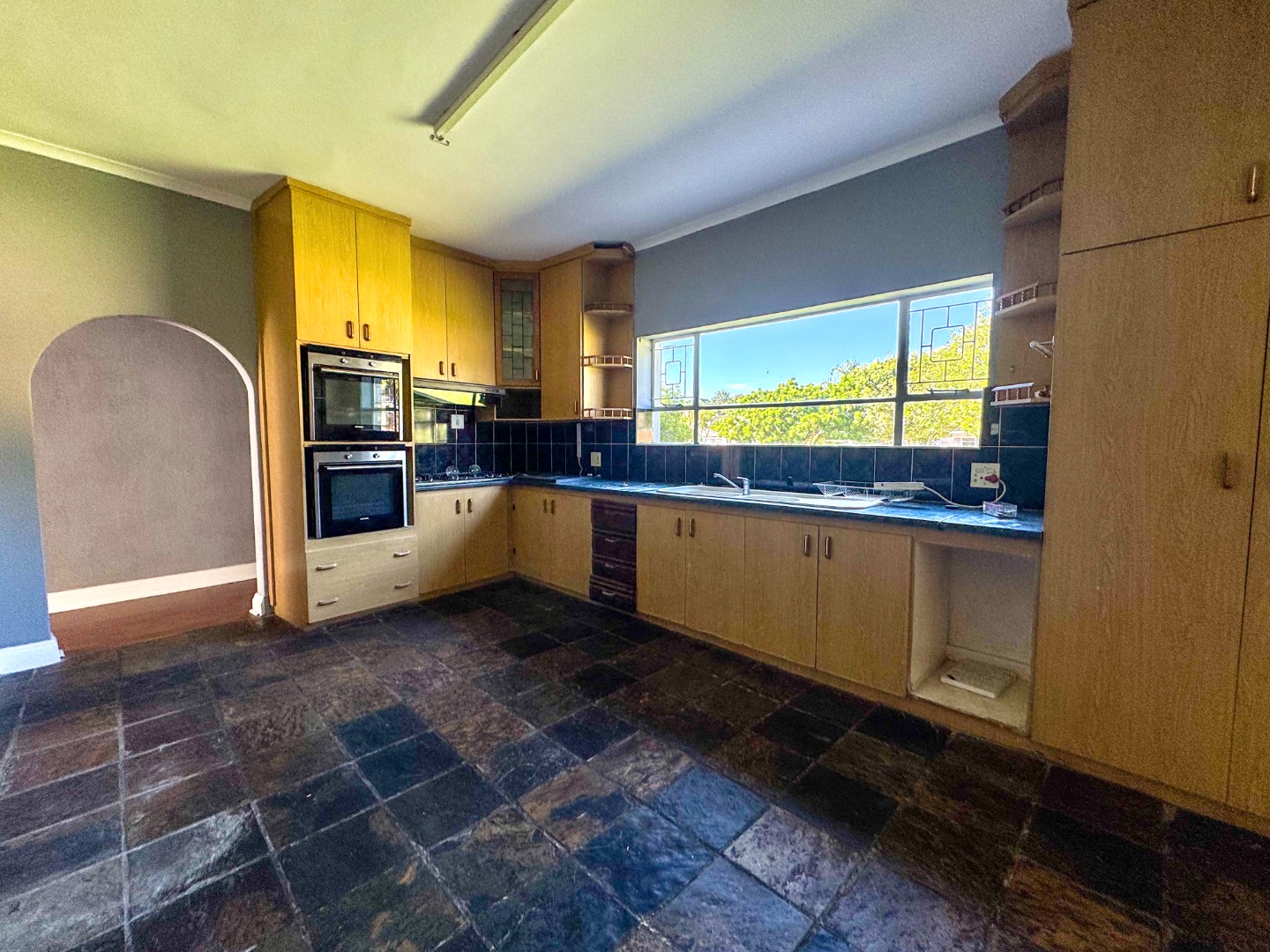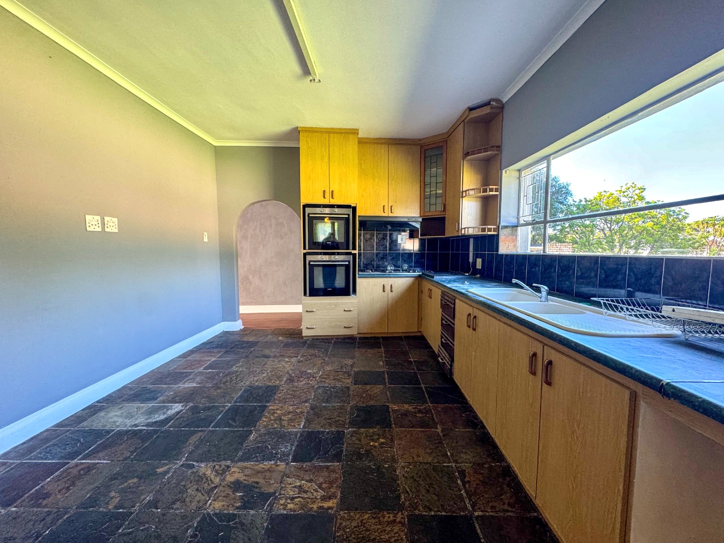 The kitchen is well-appointed with ample cabinetry, extensive counter space, a double built-in oven, and a double sink, all illuminated by a large window. Its unique slate-like floor tiles add character. The home comprises three well-proportioned bedrooms and three bathrooms, including a private ensuite, ensuring comfort and convenience for all residents. A guest toilet and laundry facility further enhance functionality.