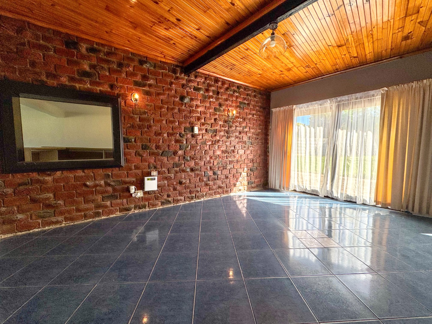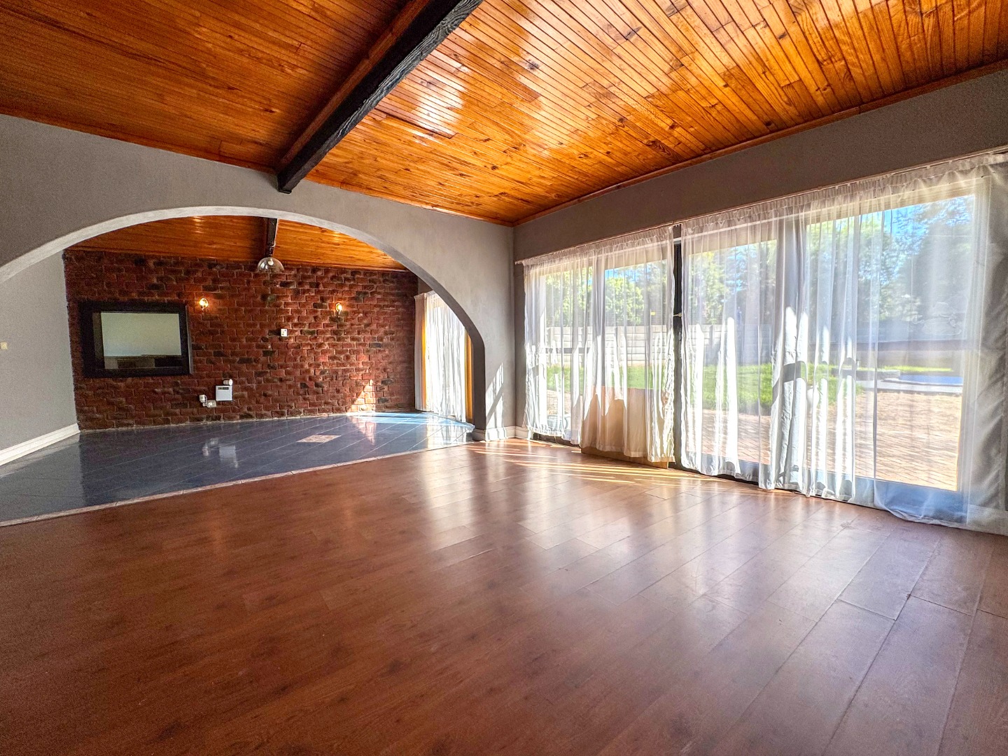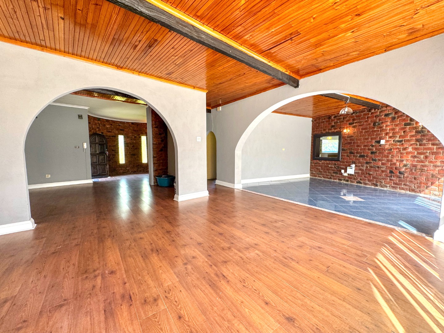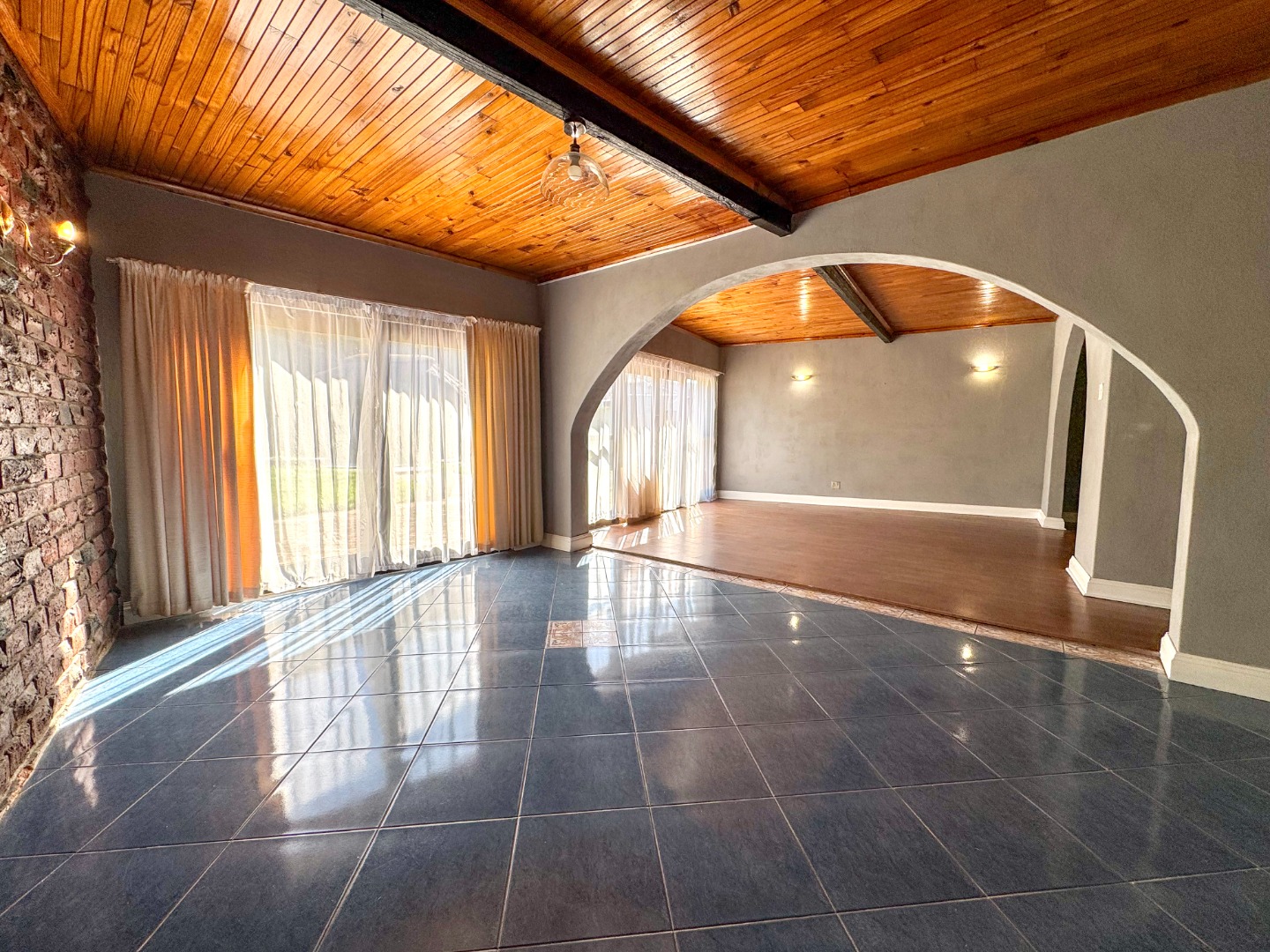 Step inside to discover an expansive 355 sqm floor plan characterized by an open-plan design and striking architectural elements. Multiple arched doorways create an inviting flow between spaces, complemented by exposed brick accent walls and captivating vaulted wooden plank ceilings with dark beams. The interior features two generous lounges, a dedicated dining room, and a comfortable family TV room, alongside a practical study, offering versatile living options for any family.