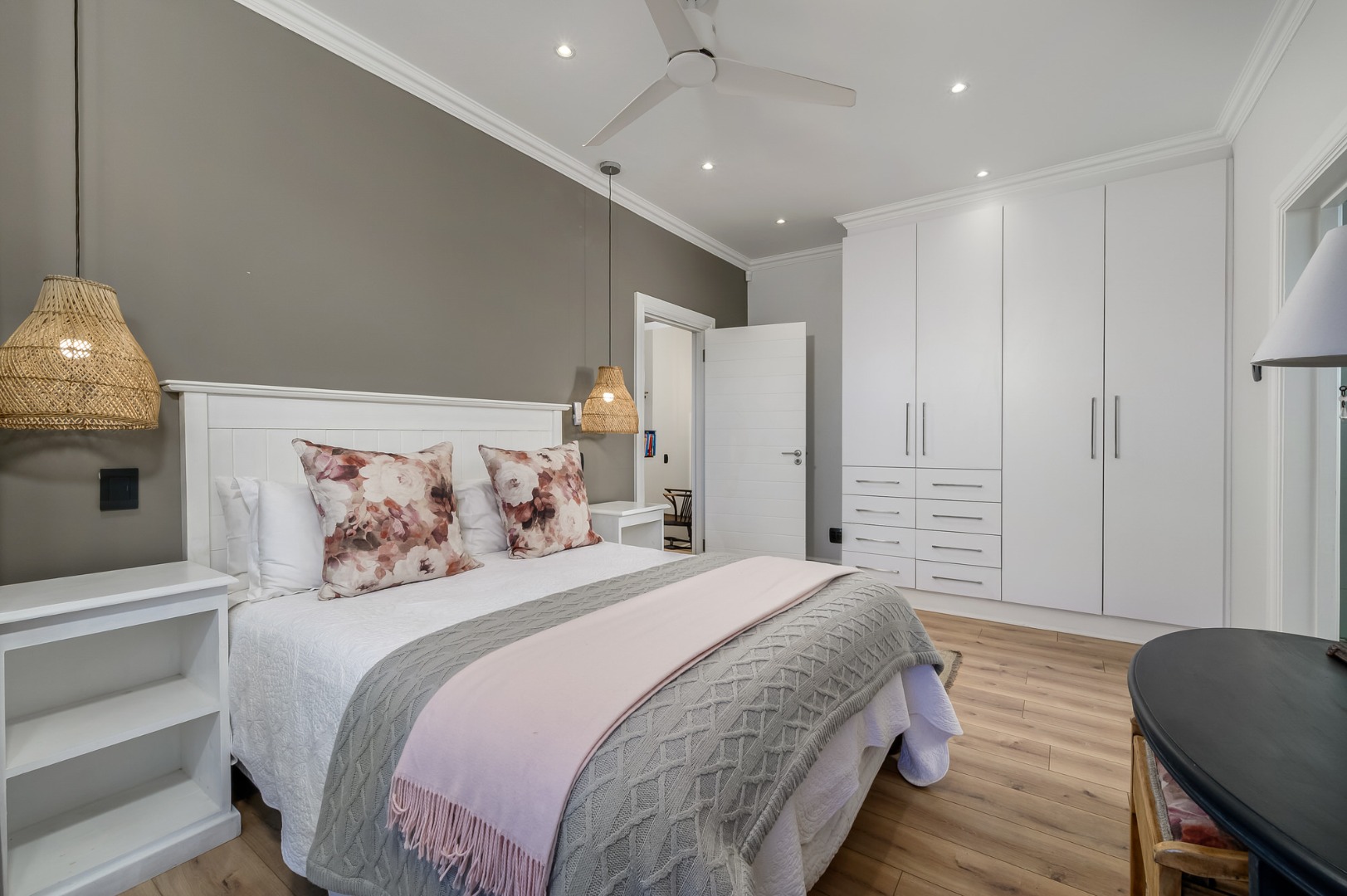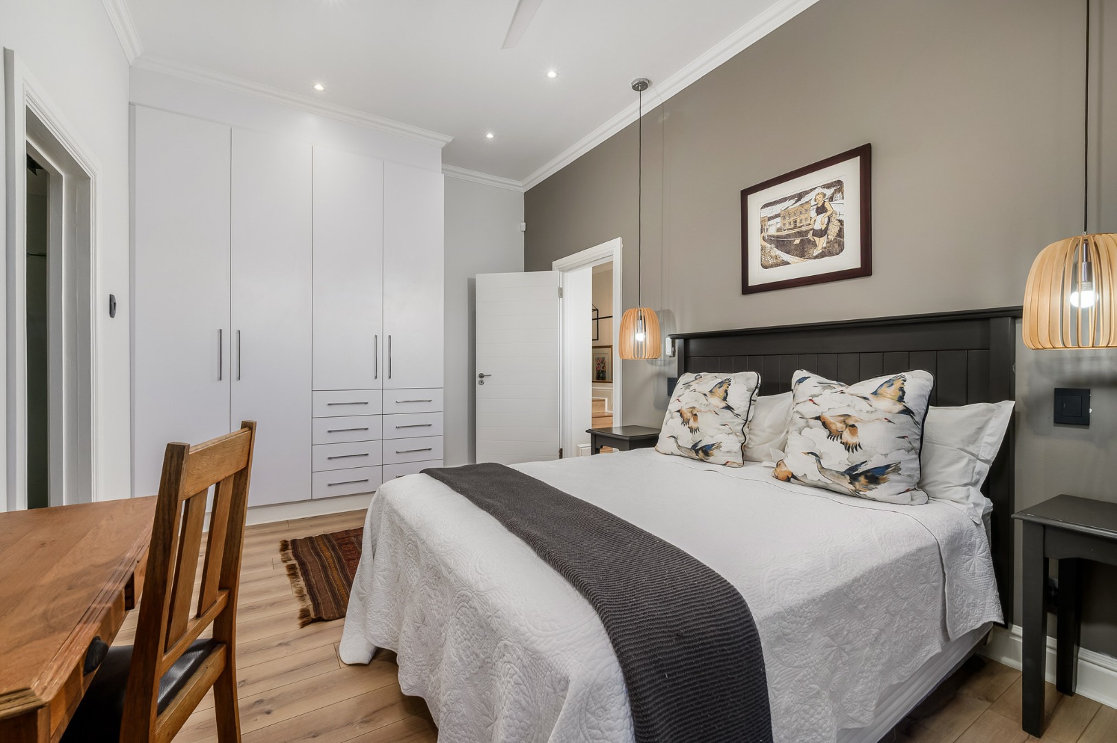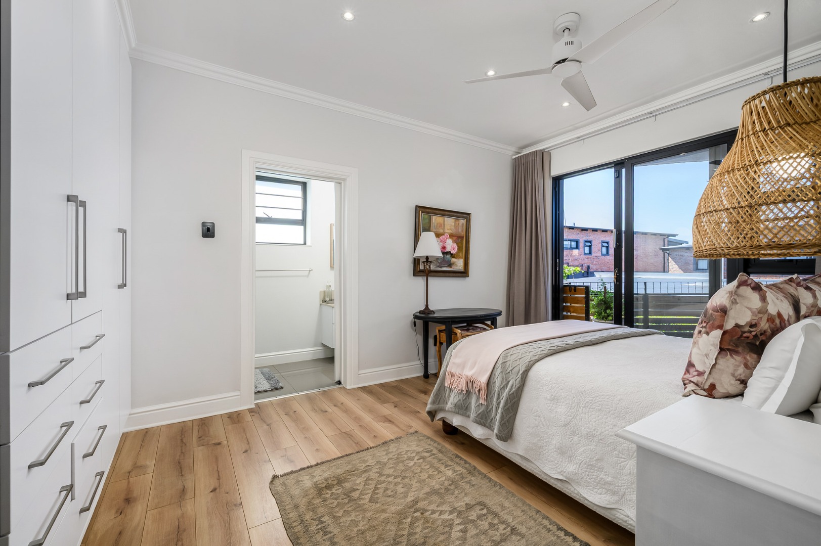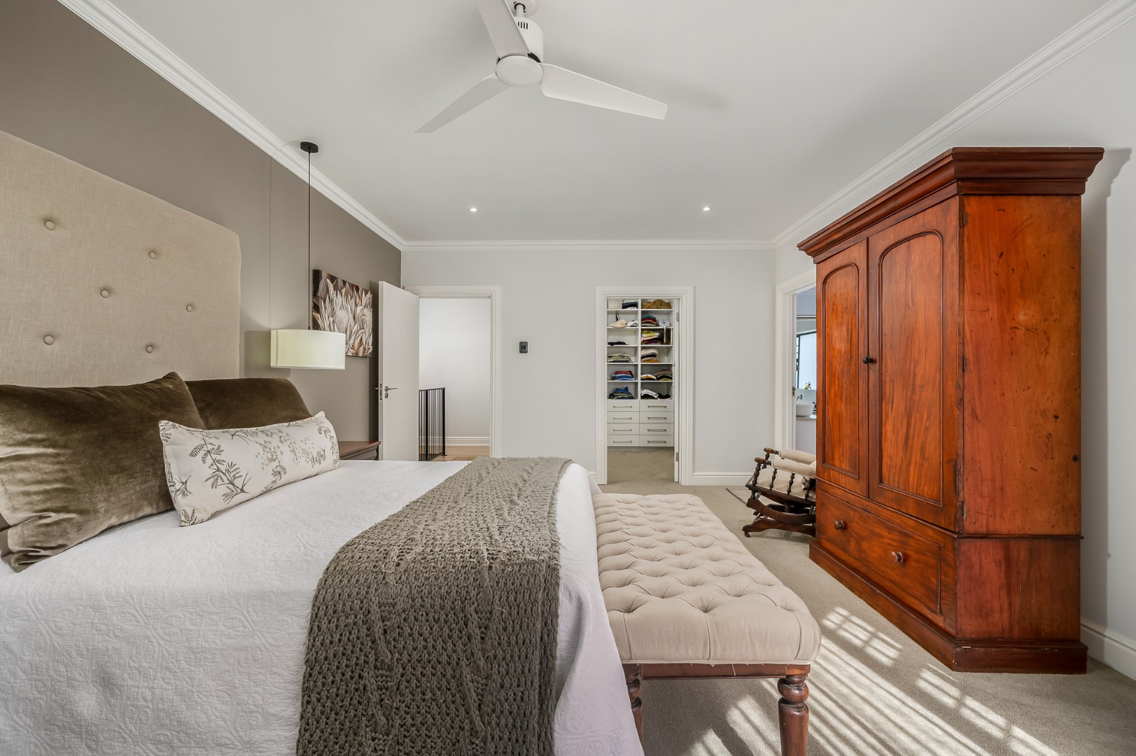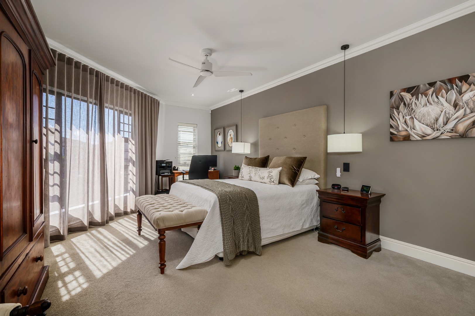 The main bedroom is also located on this level and enjoys abundant natural light, a dressing room, and a full en-suite bathroom. Flooring throughout the home is a tasteful combination of premium wooden laminated flooring, carpets, and tiles in the bathrooms, with ceiling fans installed in most rooms*. An alarm system adds further peace of mind.