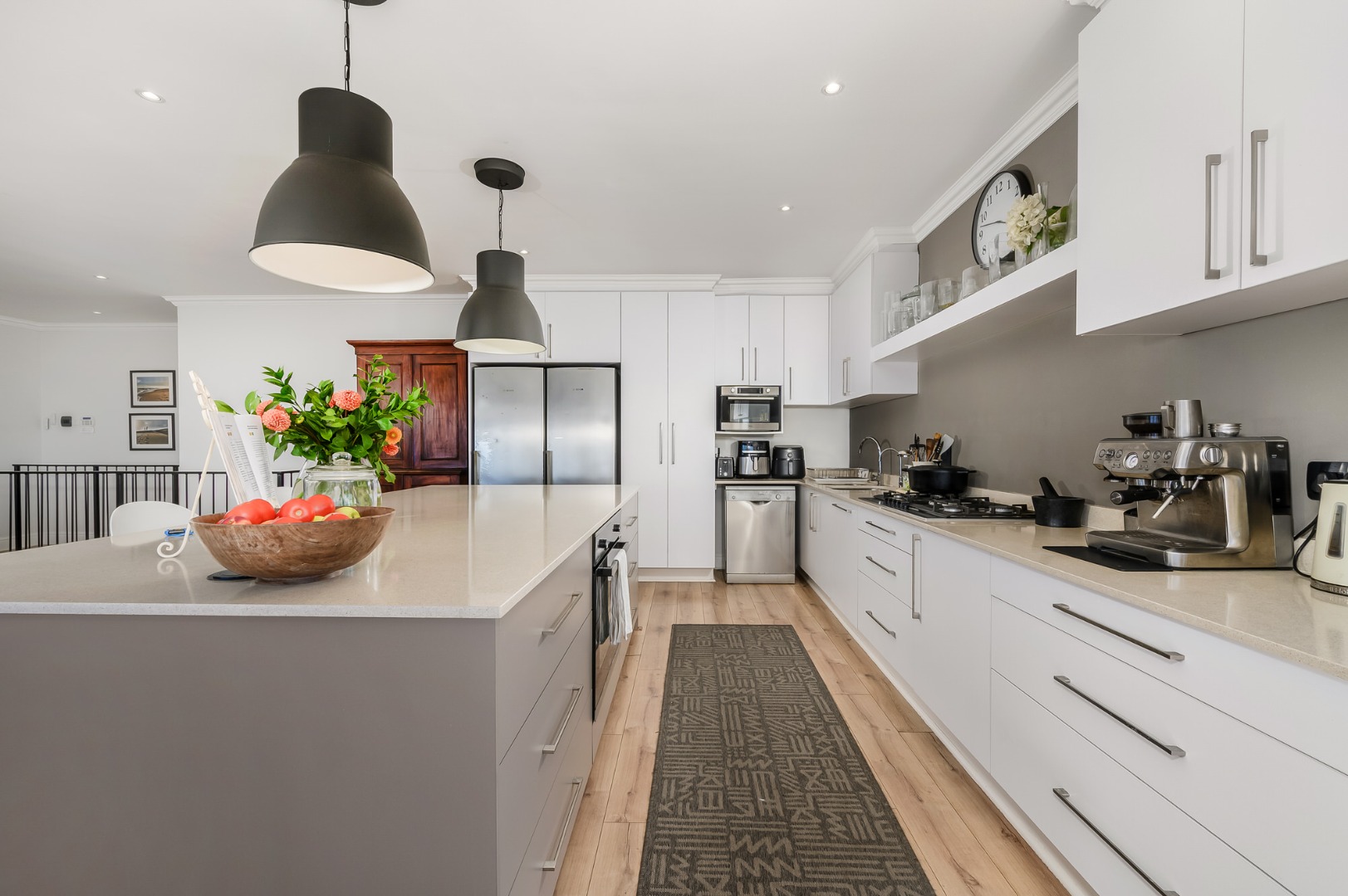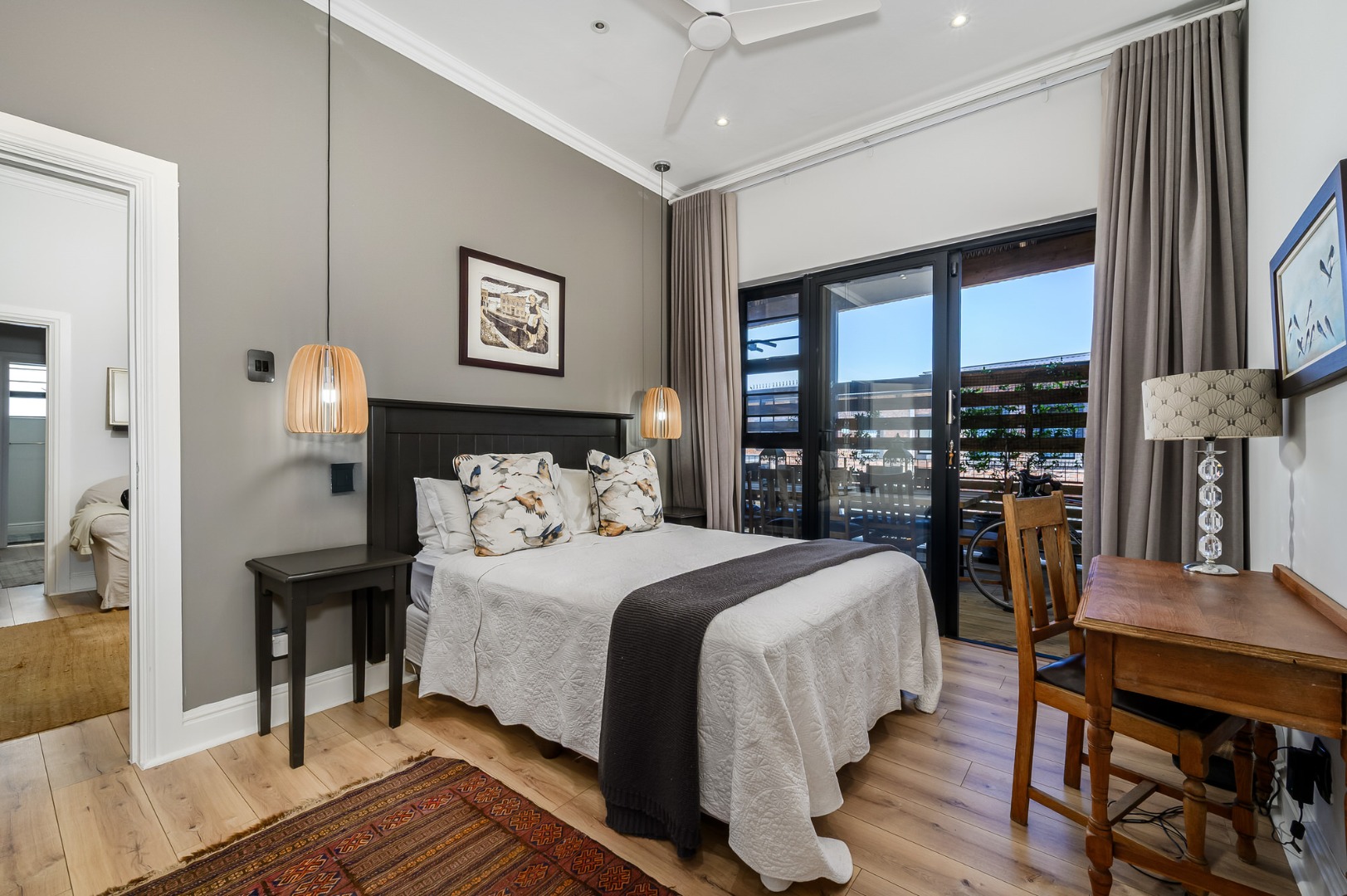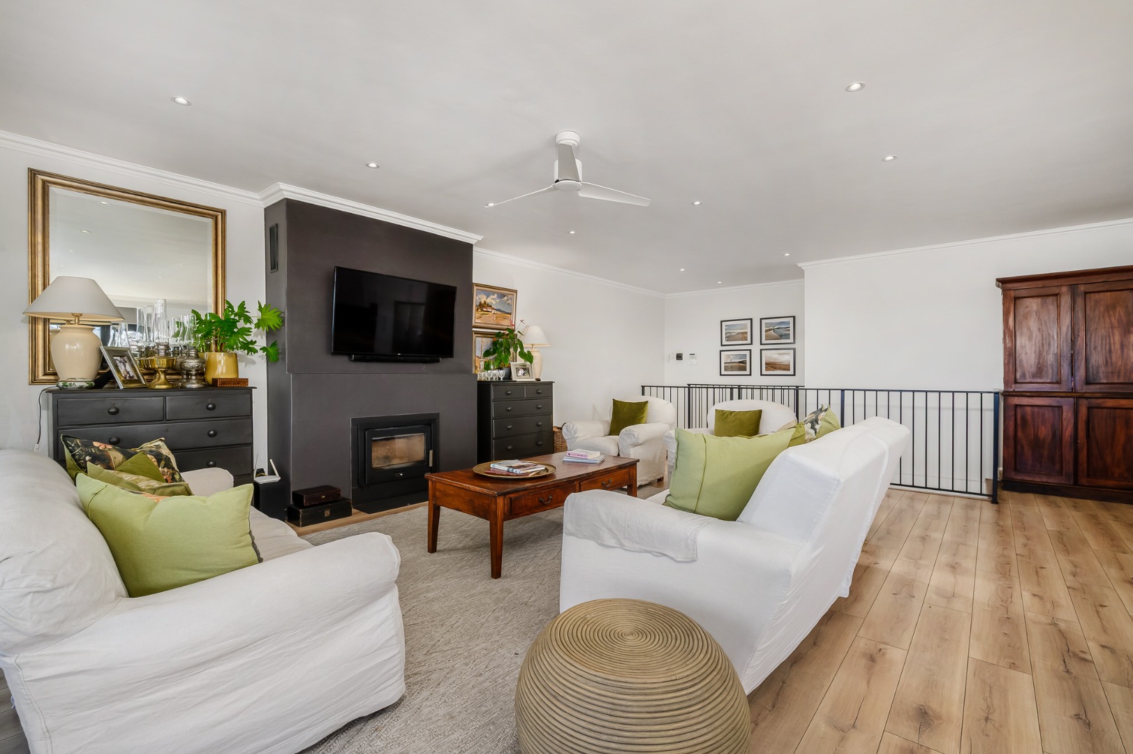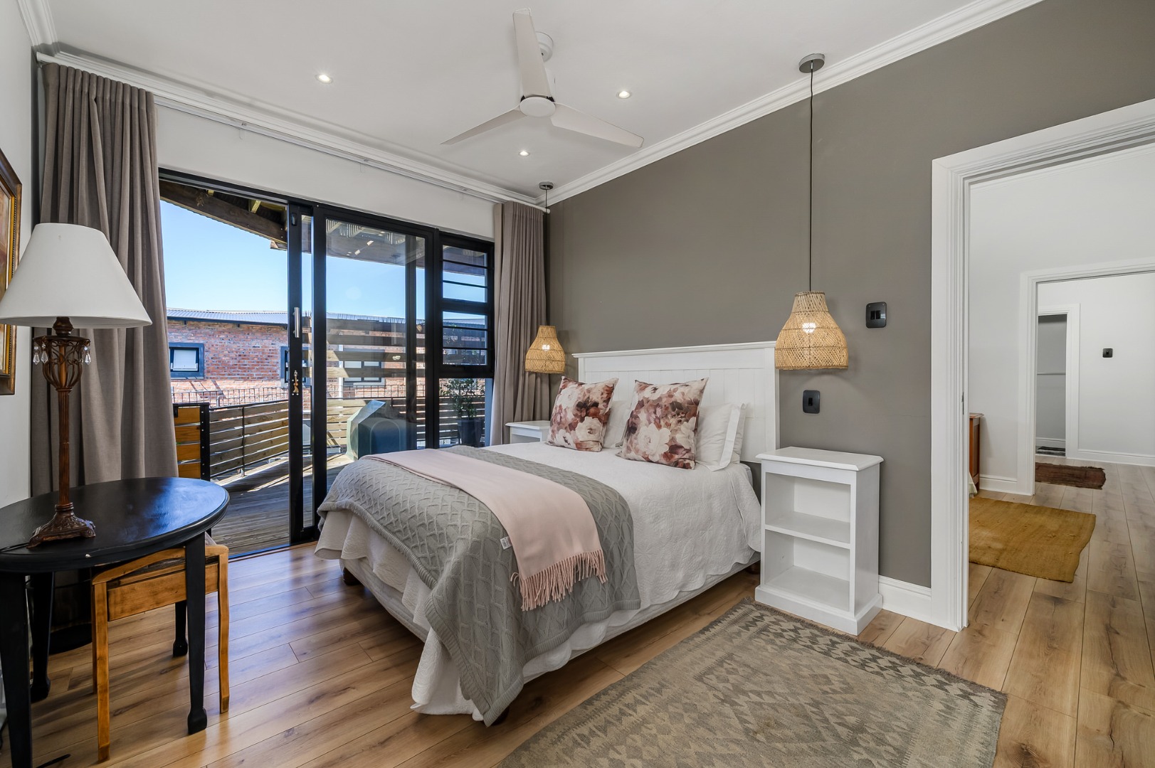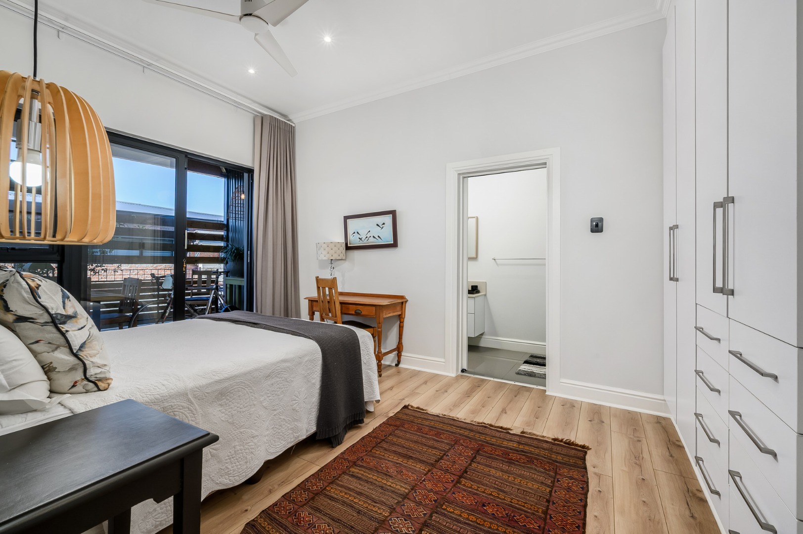 The main bedroom is also located on this level and enjoys abundant natural light, a dressing room, and a full en-suite bathroom. Flooring throughout the home is a tasteful combination of premium wooden laminated flooring, carpets, and tiles in the bathrooms, with ceiling fans installed in most rooms*. An alarm system adds further peace of mind.