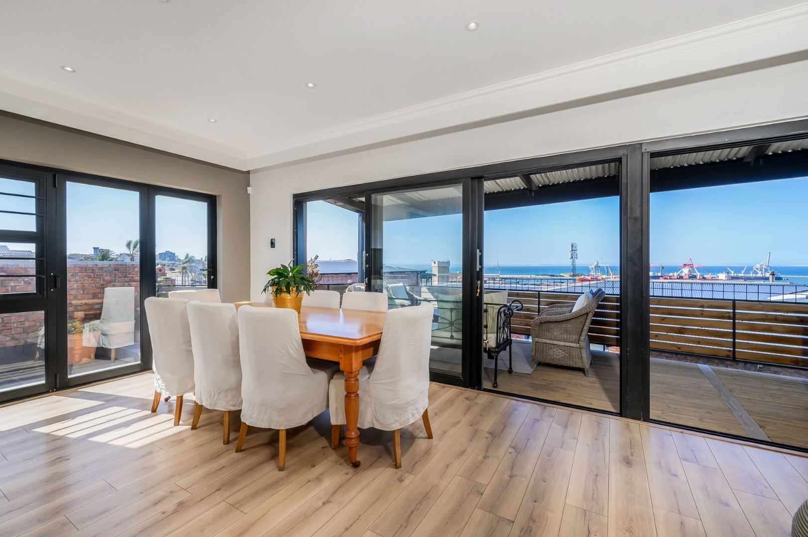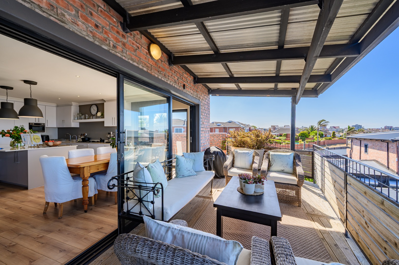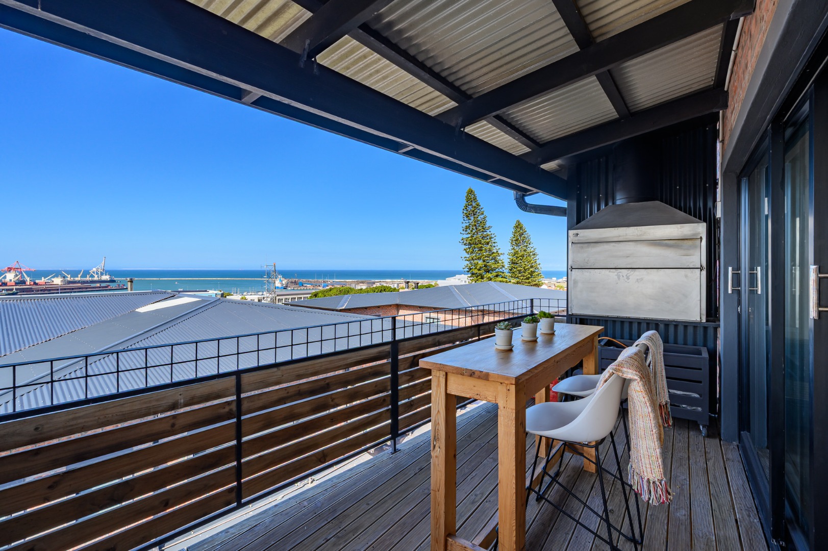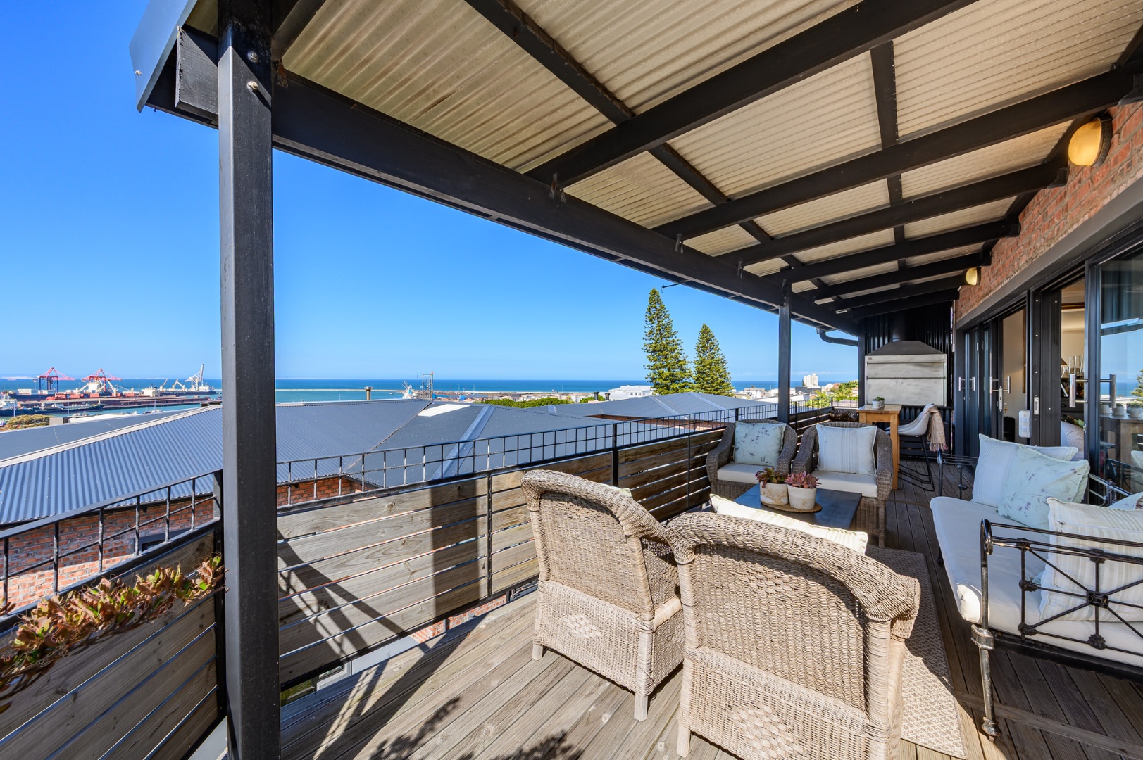 Upstairs, secured with a remote roll-down security door, the home opens into a sun-drenched open-plan living space featuring a lounge with fireplace, dining area, and a modern, well-appointed kitchen. The standout balcony, complete with a built-in Jetmaster braai, delivers what may be the best views in town, stretching across the historic central area, harbour, and all the way to Summerstrand.