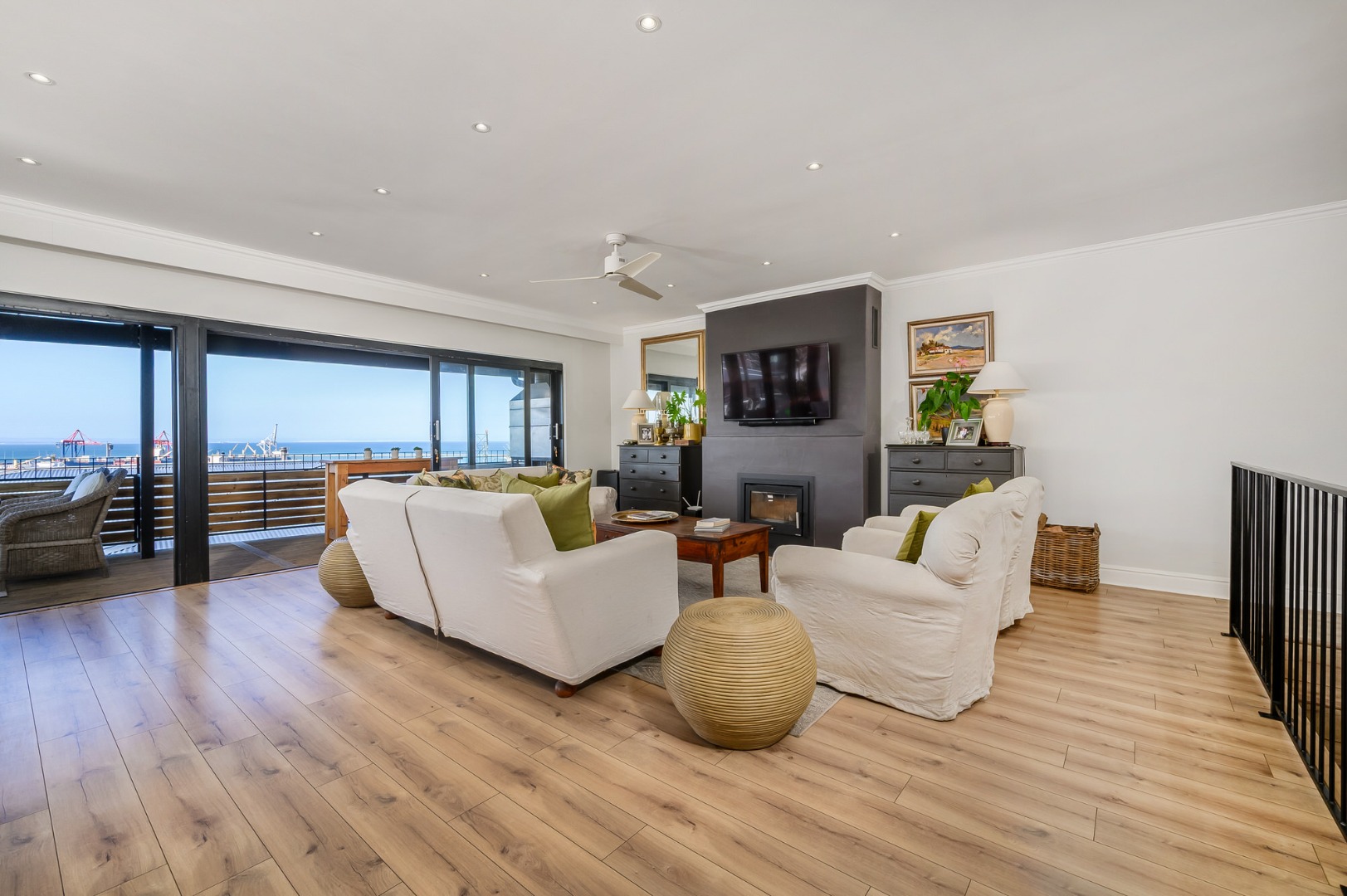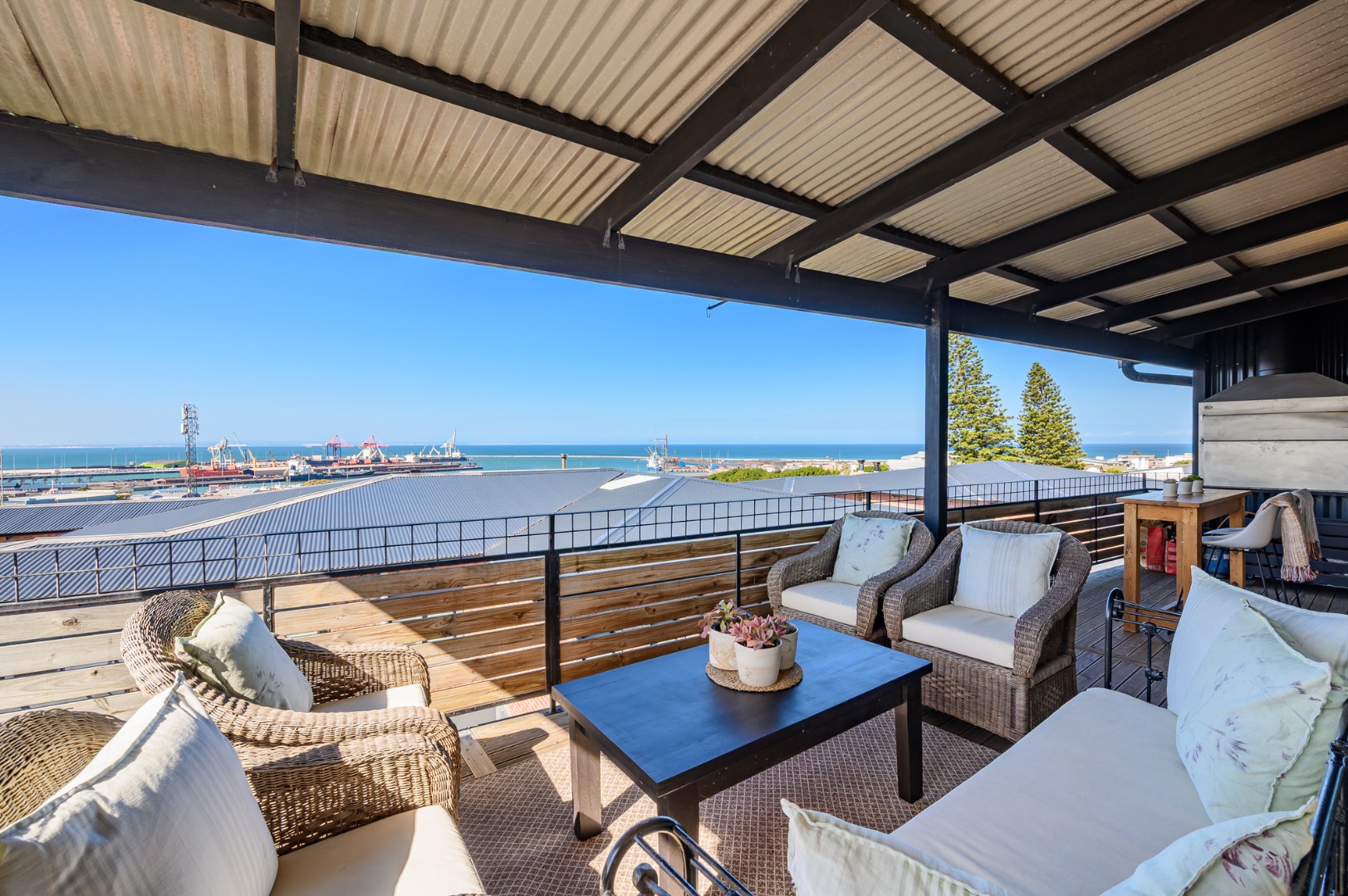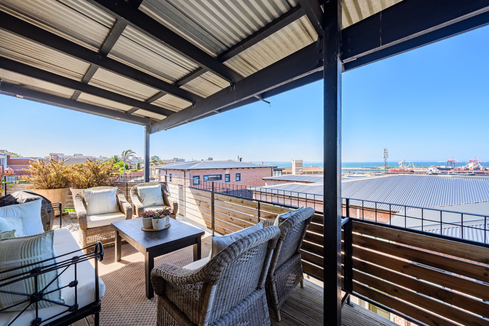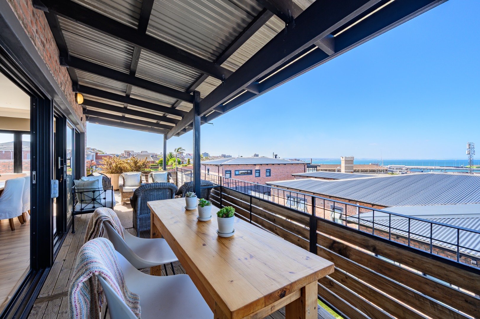 Upstairs, secured with a remote roll-down security door, the home opens into a sun-drenched open-plan living space featuring a lounge with fireplace, dining area, and a modern, well-appointed kitchen. The standout balcony, complete with a built-in Jetmaster braai, delivers what may be the best views in town, stretching across the historic central area, harbour, and all the way to Summerstrand.