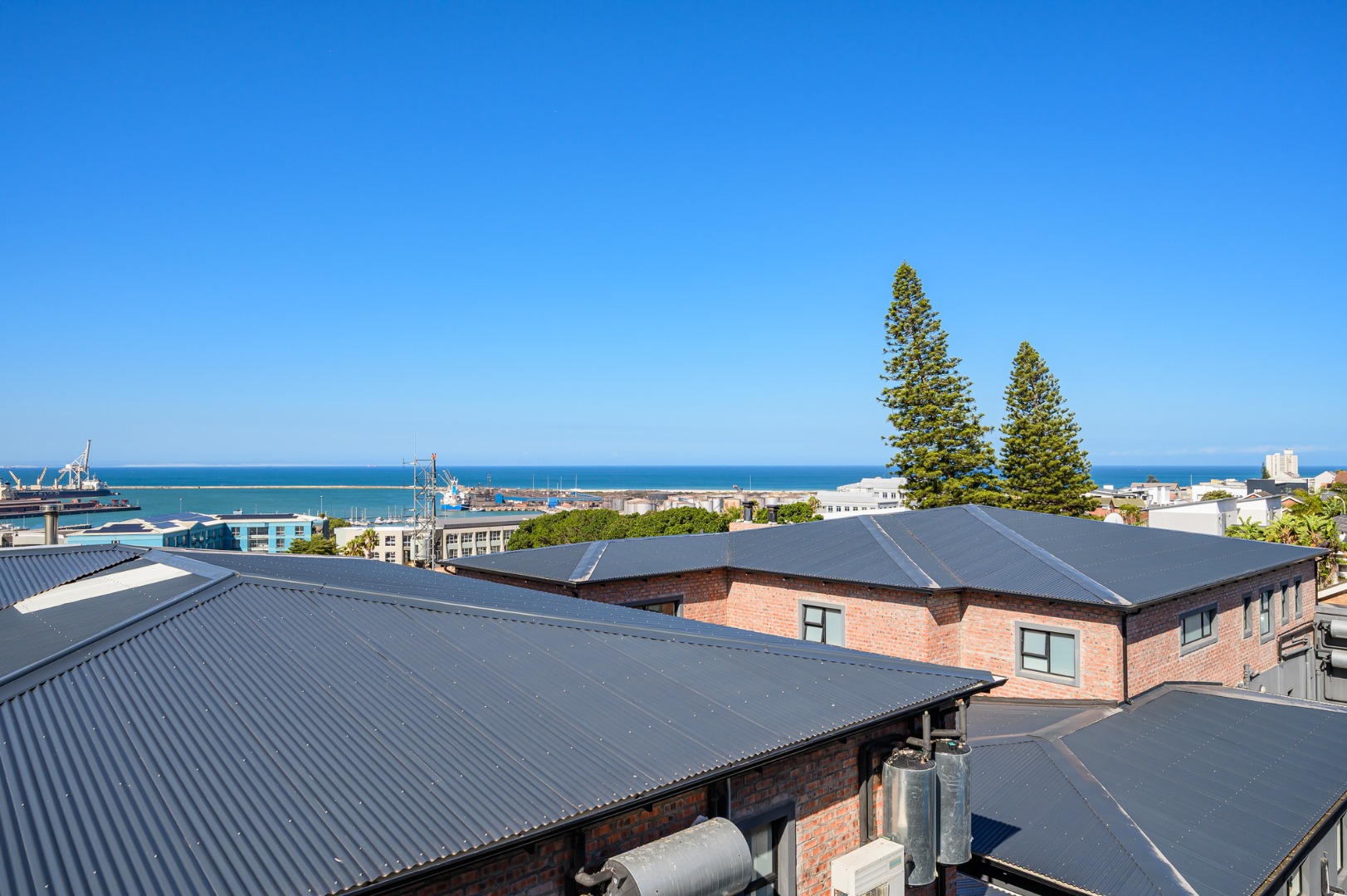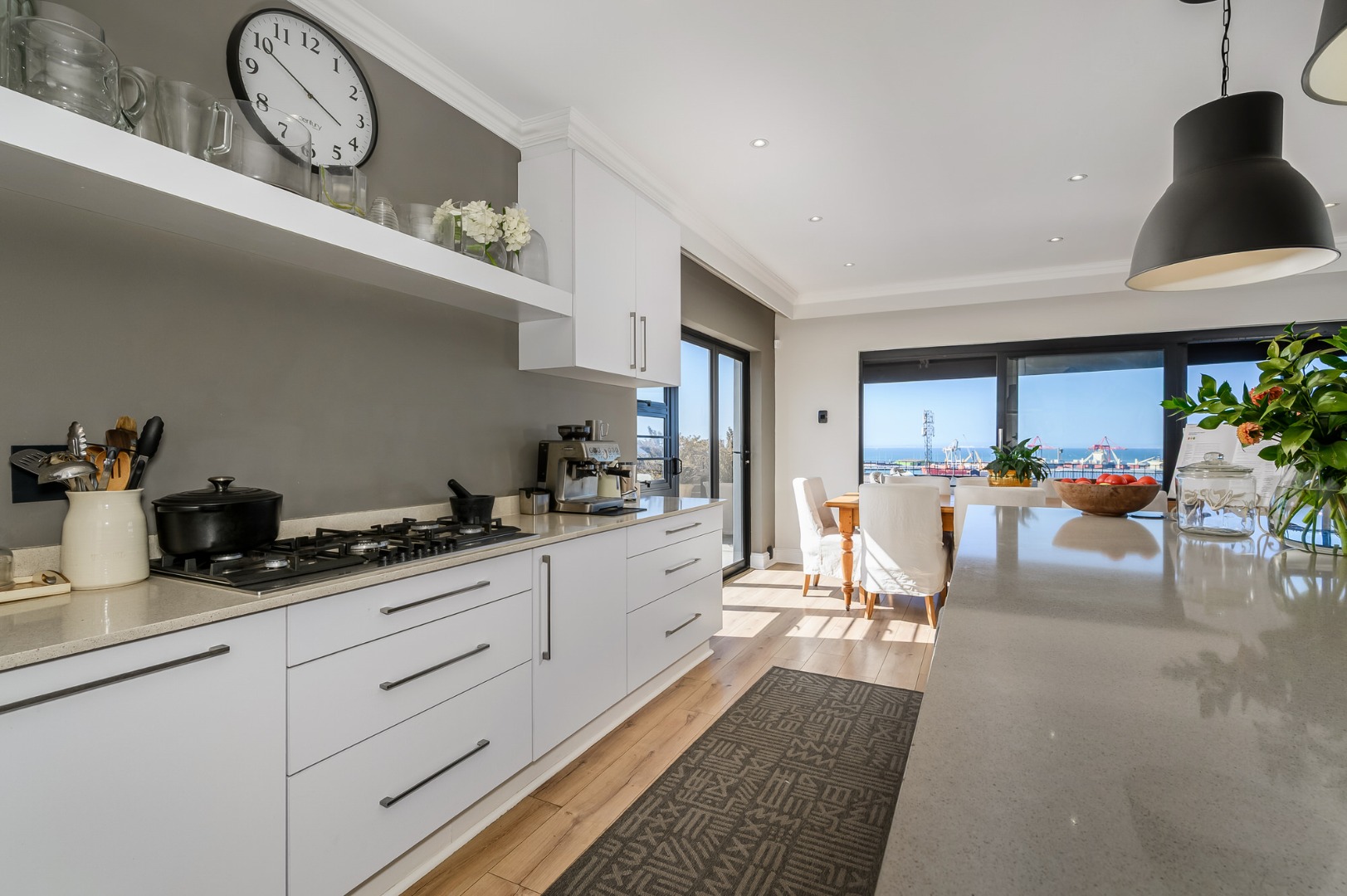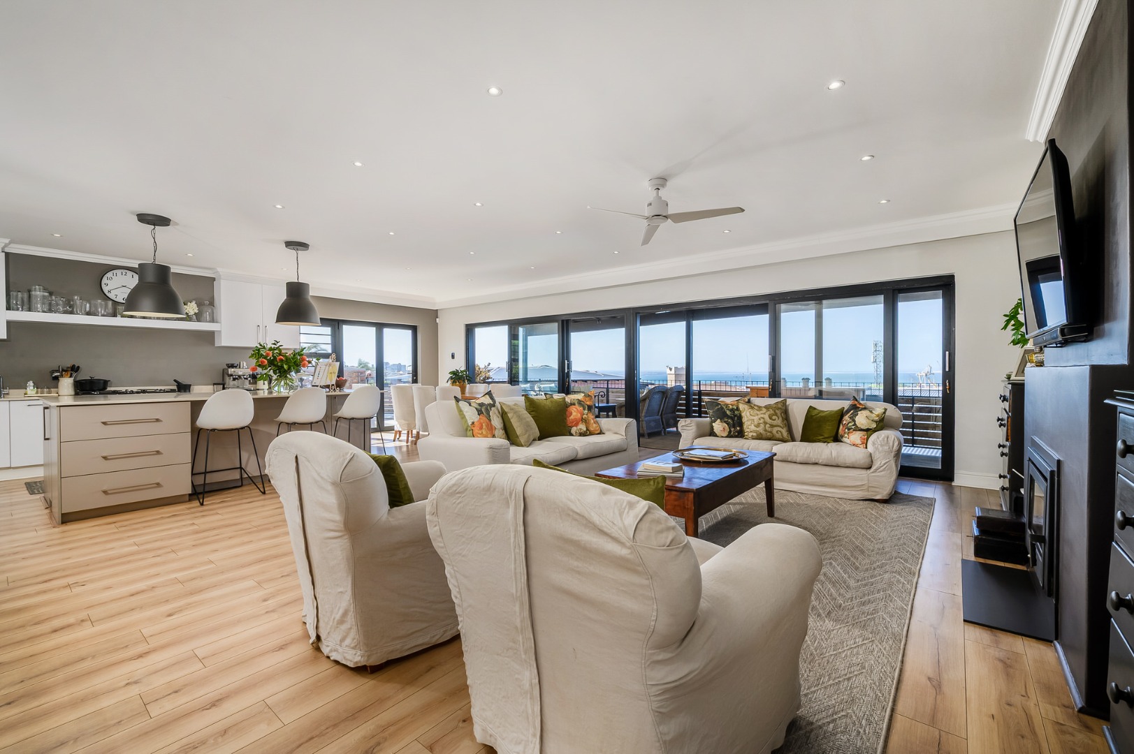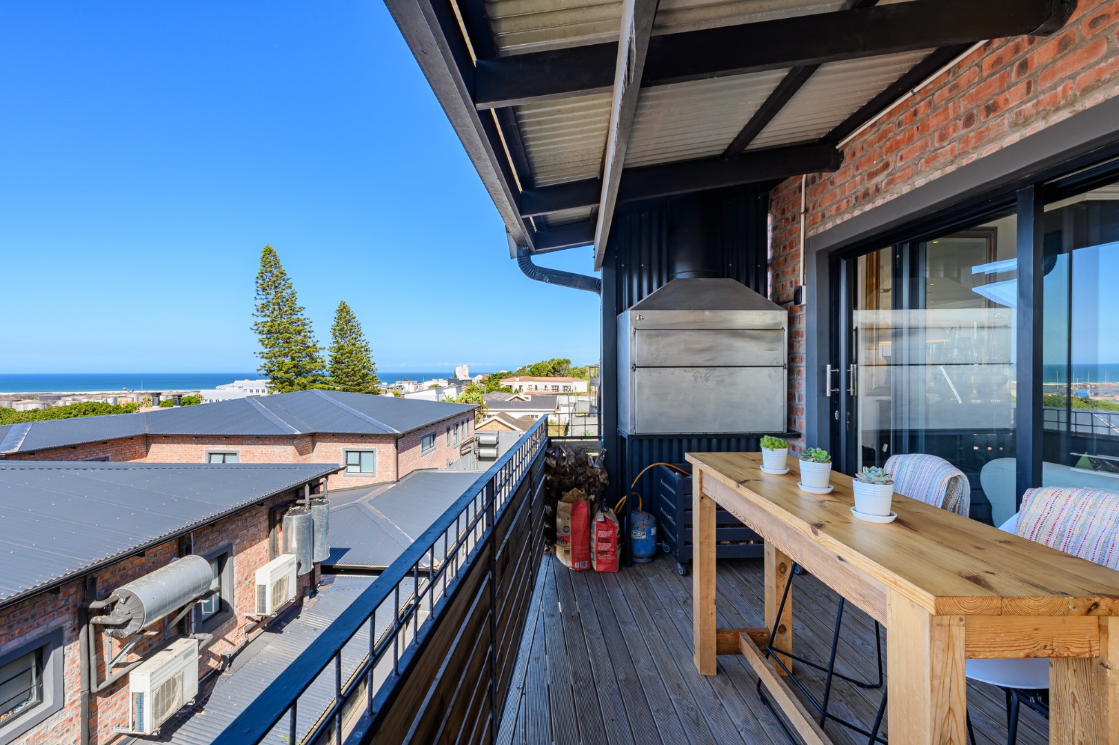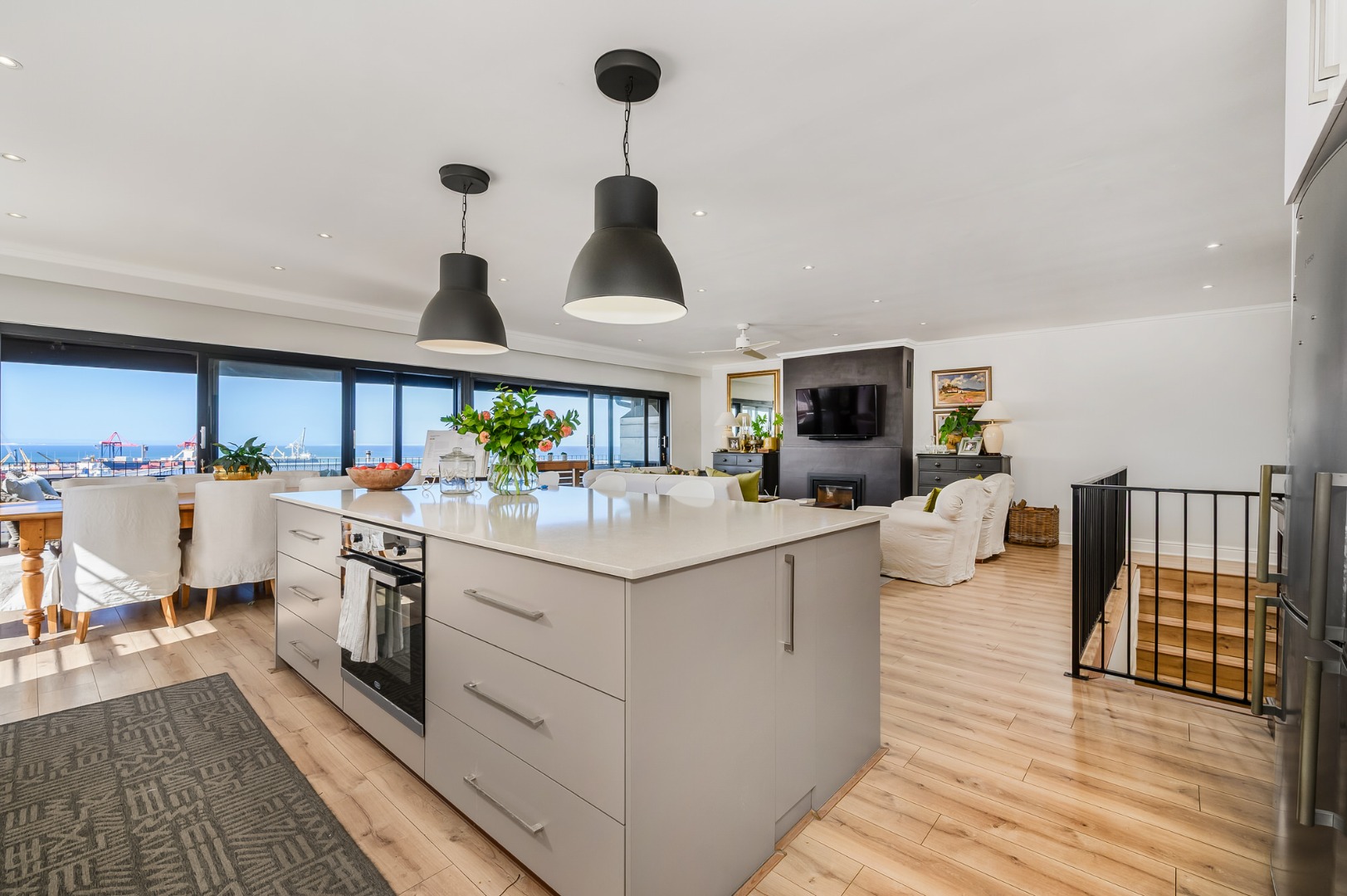 Upstairs, secured with a remote roll-down security door, the home opens into a sun-drenched open-plan living space featuring a lounge with fireplace, dining area, and a modern, well-appointed kitchen. The standout balcony, complete with a built-in Jetmaster braai, delivers what may be the best views in town, stretching across the historic central area, harbour, and all the way to Summerstrand.