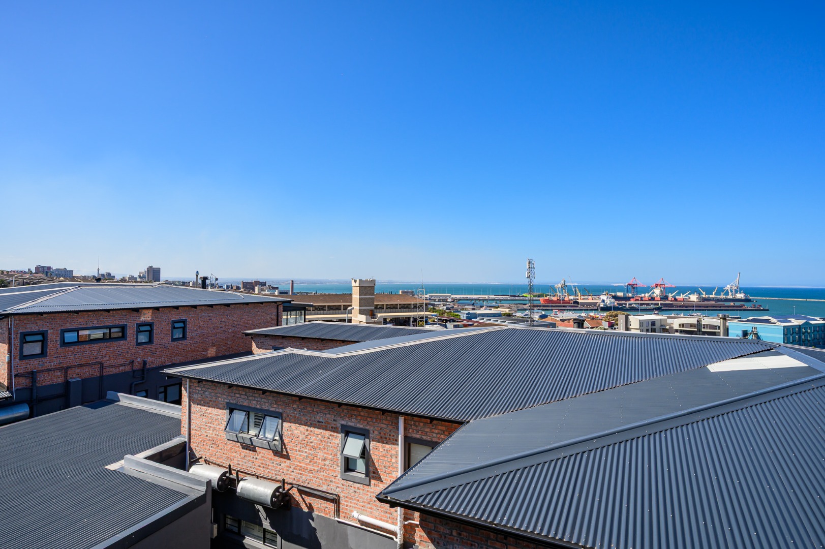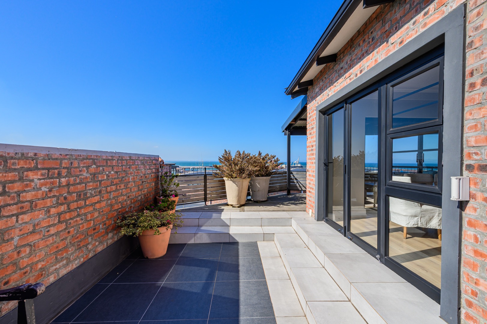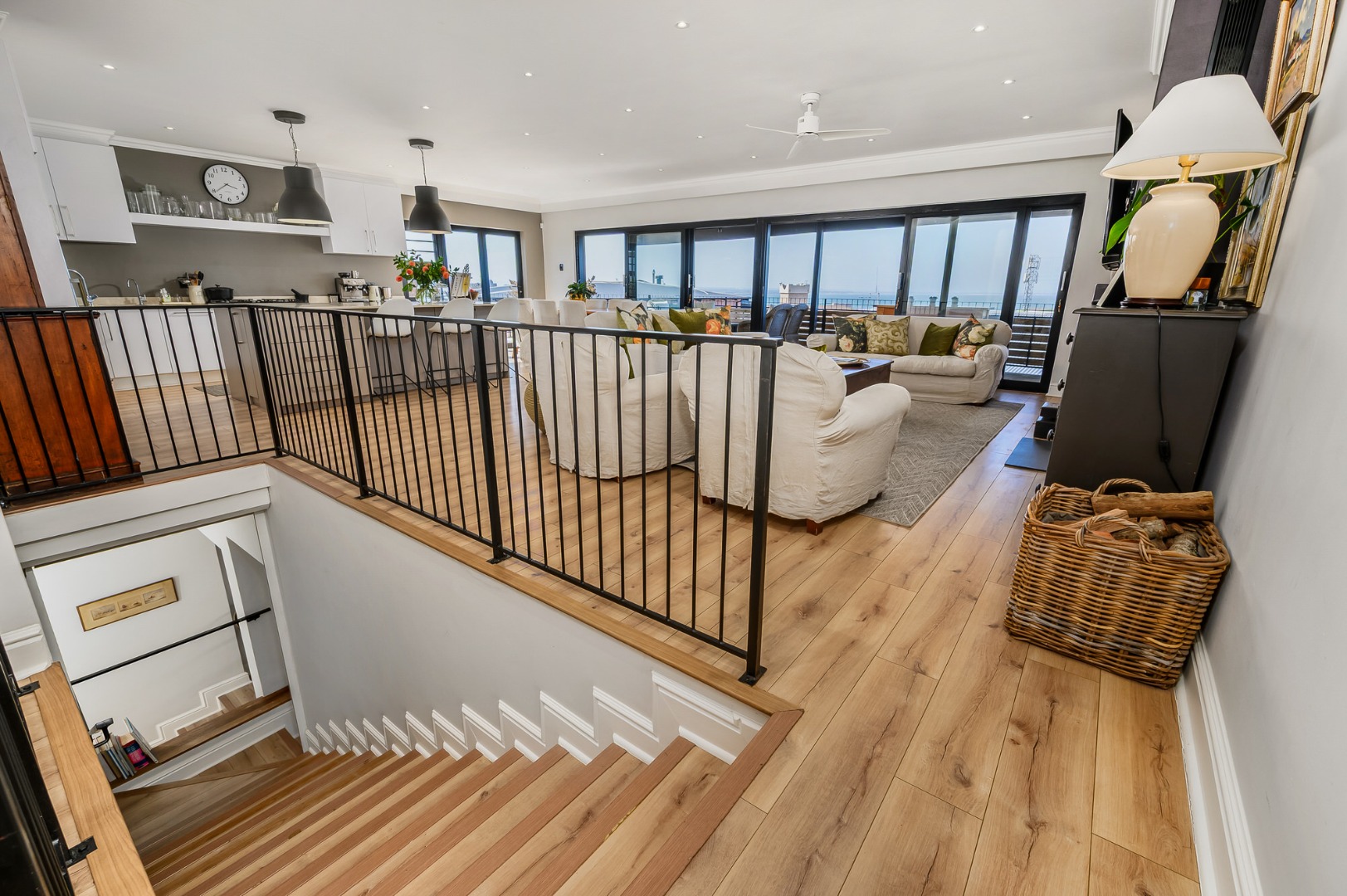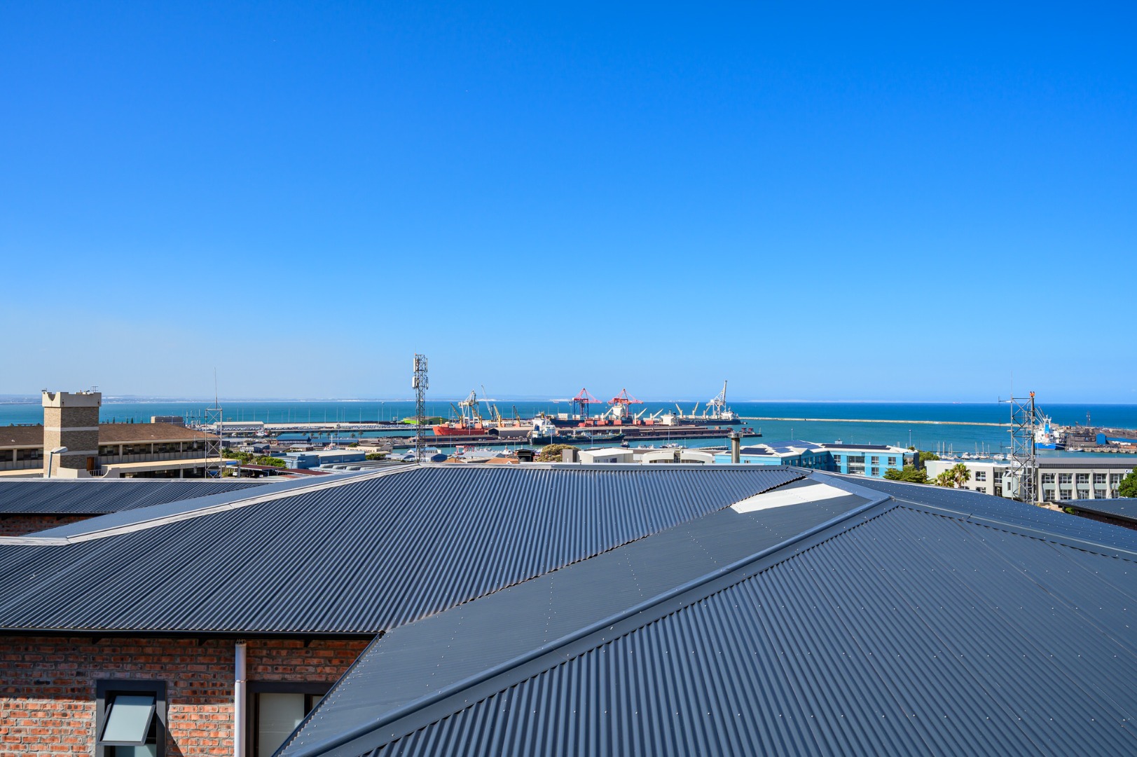 Upstairs, secured with a remote roll-down security door, the home opens into a sun-drenched open-plan living space featuring a lounge with fireplace, dining area, and a modern, well-appointed kitchen. The standout balcony, complete with a built-in Jetmaster braai, delivers what may be the best views in town, stretching across the historic central area, harbour, and all the way to Summerstrand.