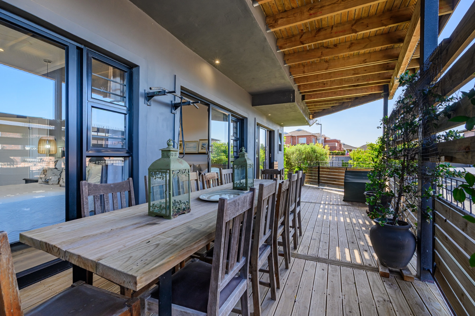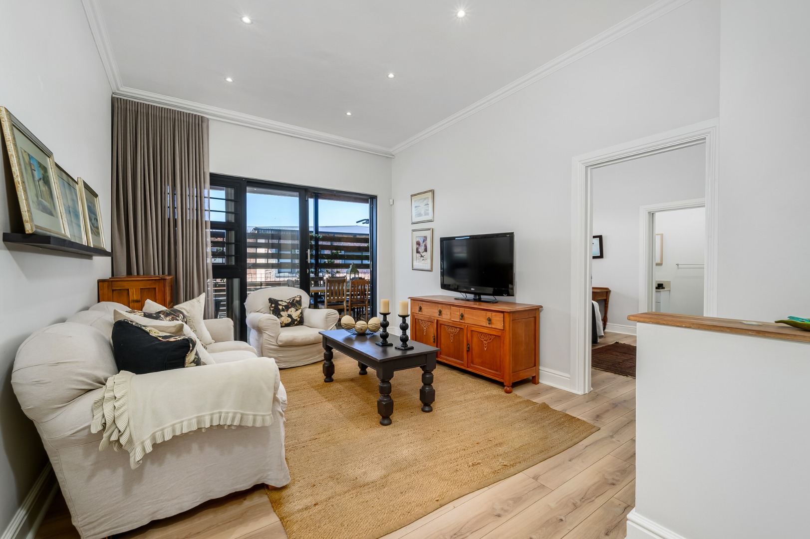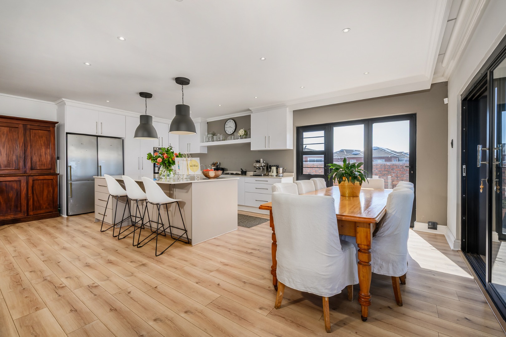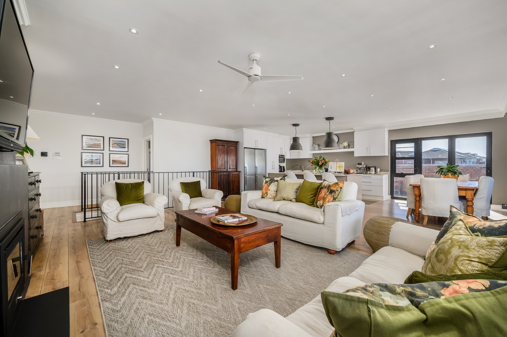 Upstairs, secured with a remote roll-down security door, the home opens into a sun-drenched open-plan living space featuring a lounge with fireplace, dining area, and a modern, well-appointed kitchen. The standout balcony, complete with a built-in Jetmaster braai, delivers what may be the best views in town, stretching across the historic central area, harbour, and all the way to Summerstrand.