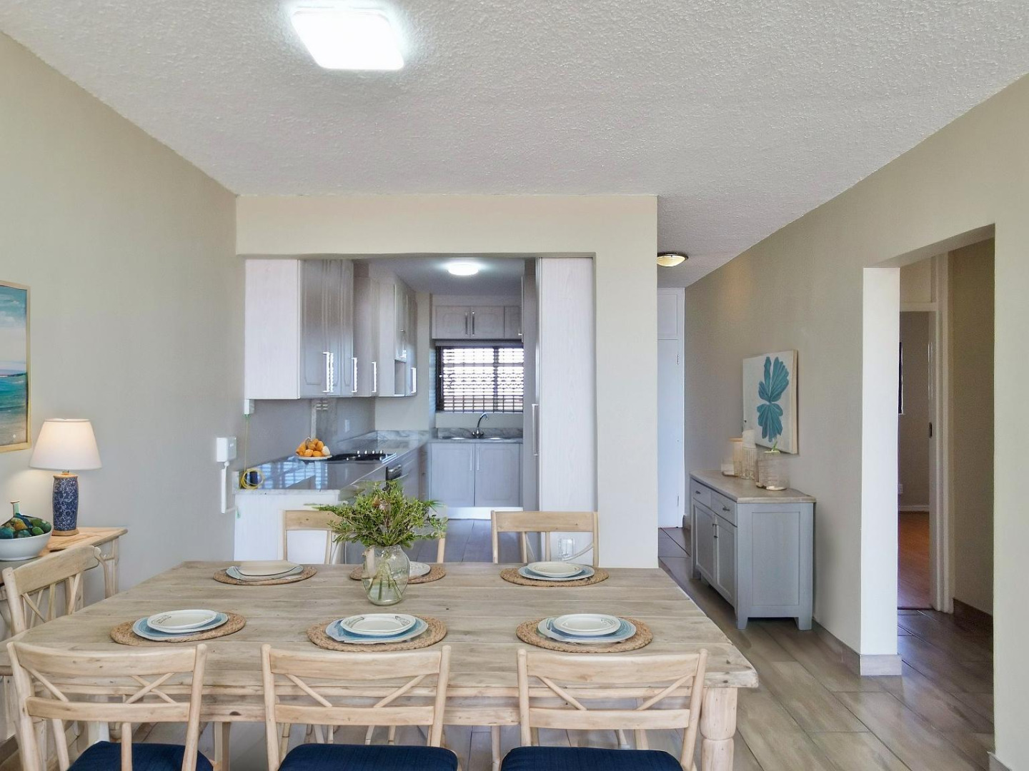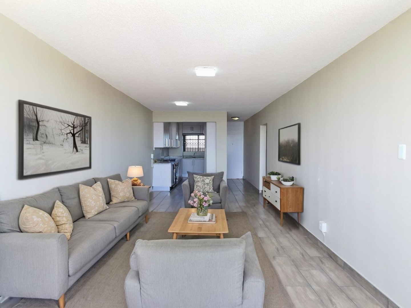 Step into a light-filled, open-plan living space that blends a sleek kitchen, dining, and lounge area, leading to a sunny seating nook, perfect for soaking in the scenery. The apartment is tiled throughout the living areas barring the bedrooms, that features laminate flooring and designed for low-maintenance living.