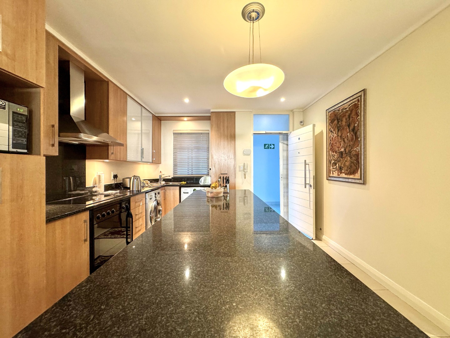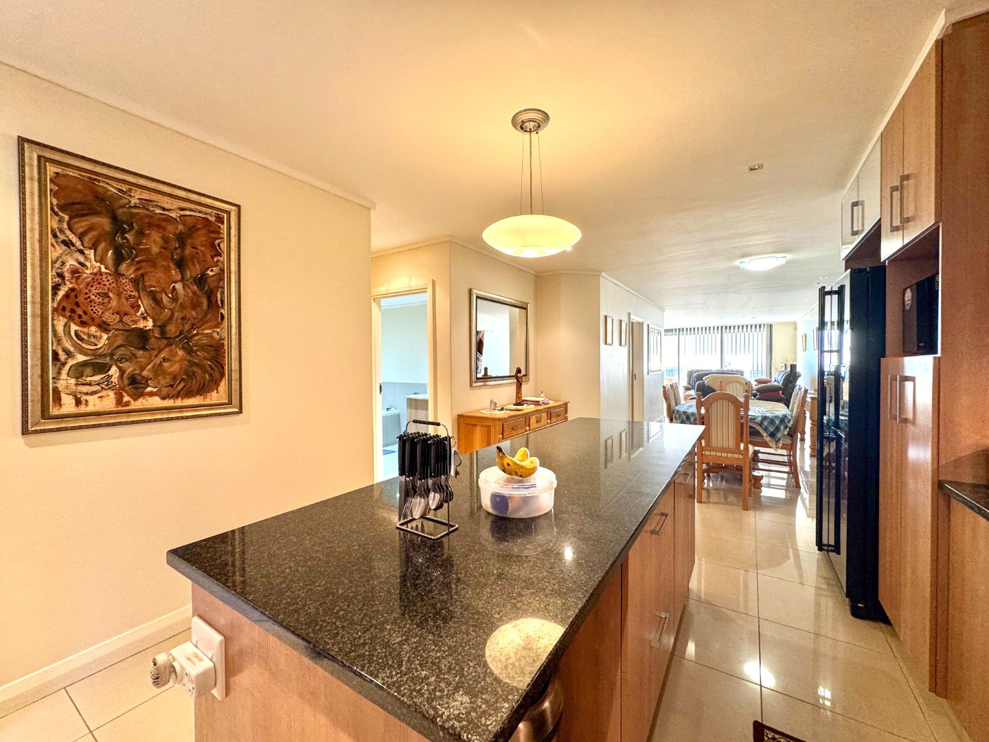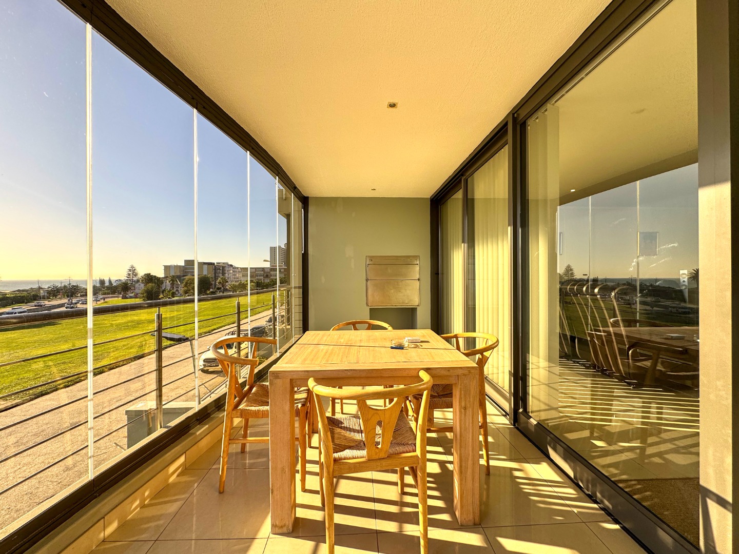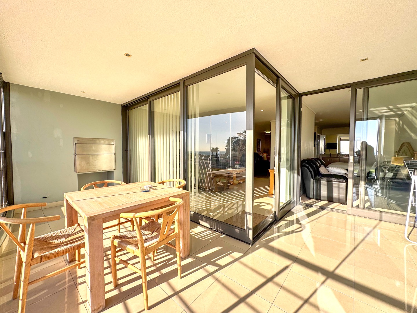 The Open plan design provides for perfect entertainment flow from Kitchen, to dining area and lounge. The modern kitchen is well fitted with a breakfast bar as well as space for washing machine and tumble-dryer or dishwasher. Backup power is provided for by an inverter with LI battery. The lounge opens to a generous balcony featuring quality frameless stack windows and offers plenty of space for dining and appreciation of the ocean view in any weather. The balcony also has a fitted stainless-steel braai. The ample sized Main bedroom with ensuite also has direct access to the balcony. The second bedroom is spacious and has access to the guest bathroom. Living areas are fitted with up market floor tiling and the two bedrooms have plush carpeting.