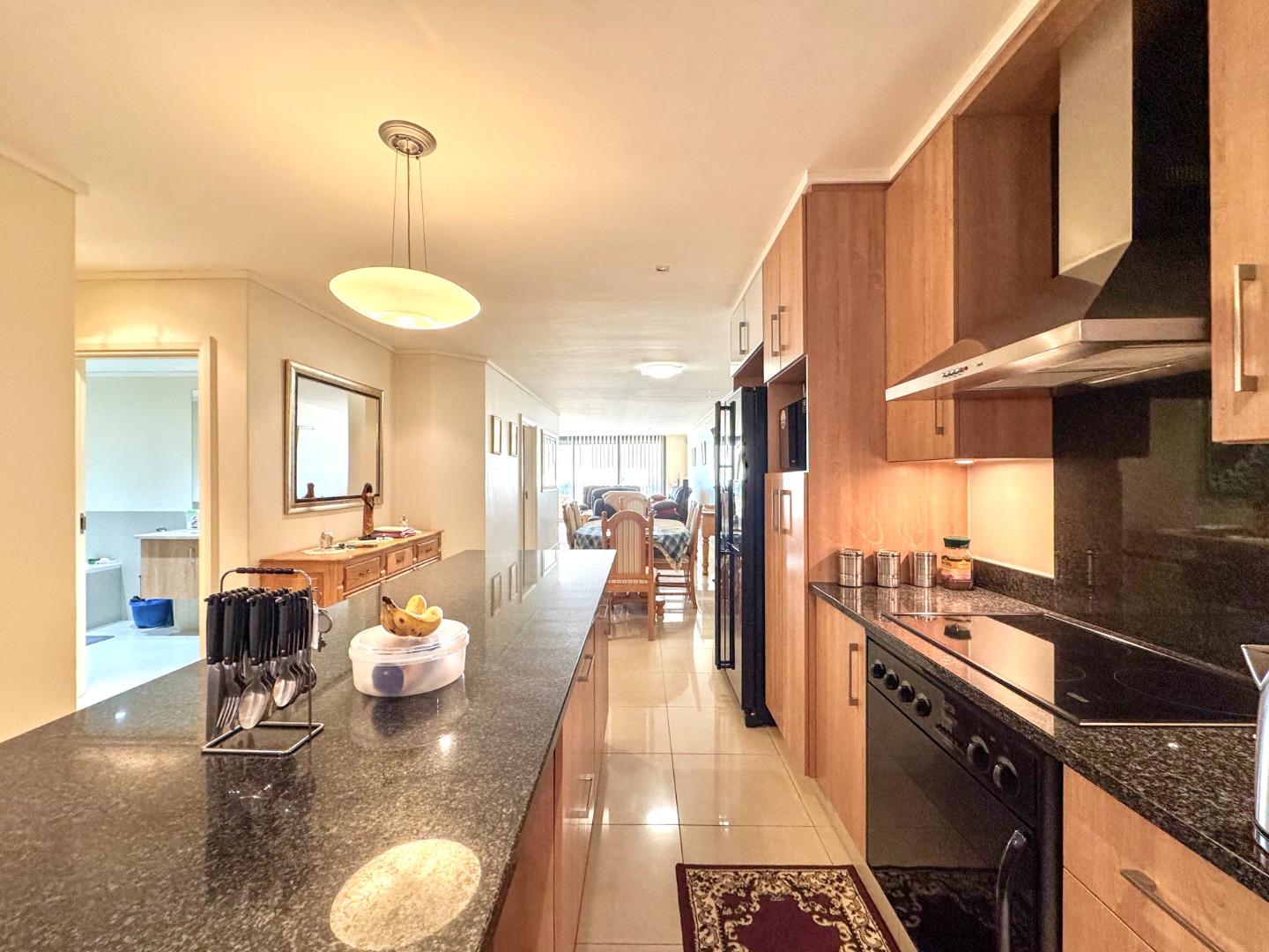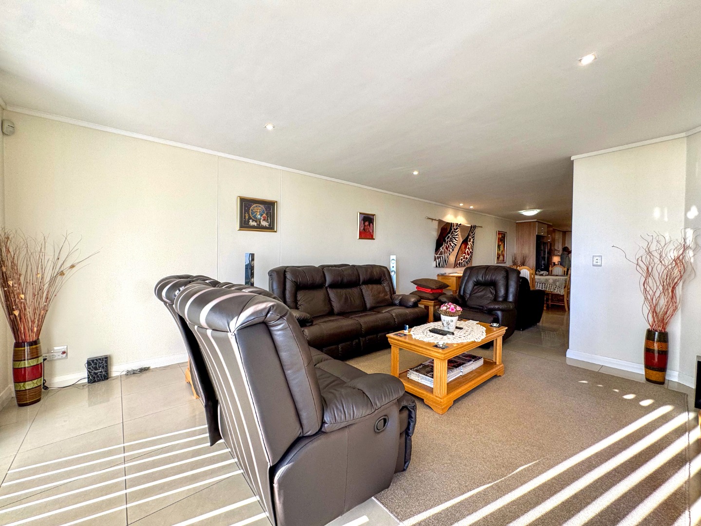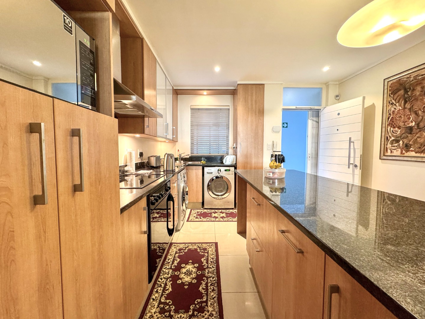 The Open plan design provides for perfect entertainment flow from Kitchen, to dining area and lounge. The modern kitchen is well fitted with a breakfast bar as well as space for washing machine and tumble-dryer or dishwasher. Backup power is provided for by an inverter with LI battery. The lounge opens to a generous balcony featuring quality frameless stack windows and offers plenty of space for dining and appreciation of the ocean view in any weather. The balcony also has a fitted stainless-steel braai. The ample sized Main bedroom with ensuite also has direct access to the balcony. The second bedroom is spacious and has access to the guest bathroom. Living areas are fitted with up market floor tiling and the two bedrooms have plush carpeting.