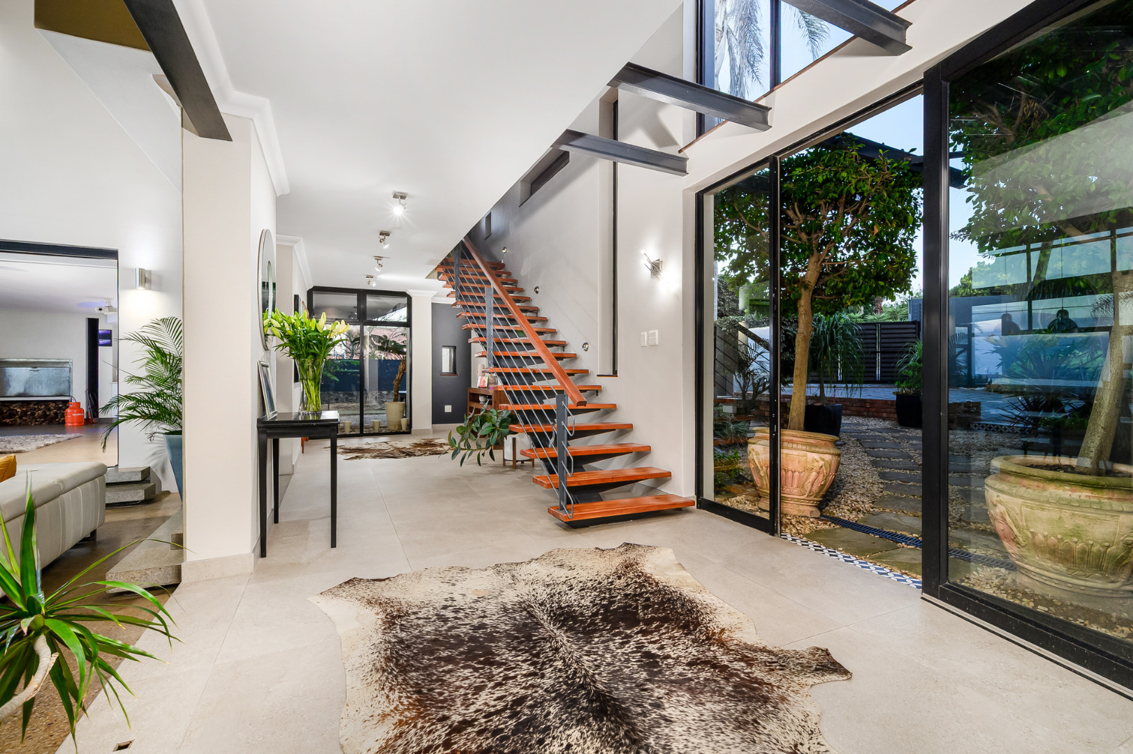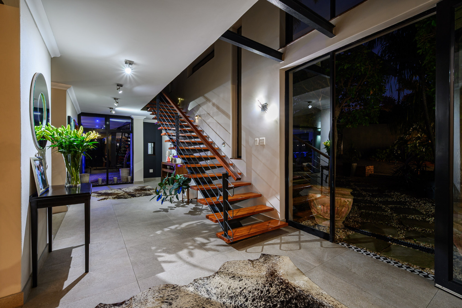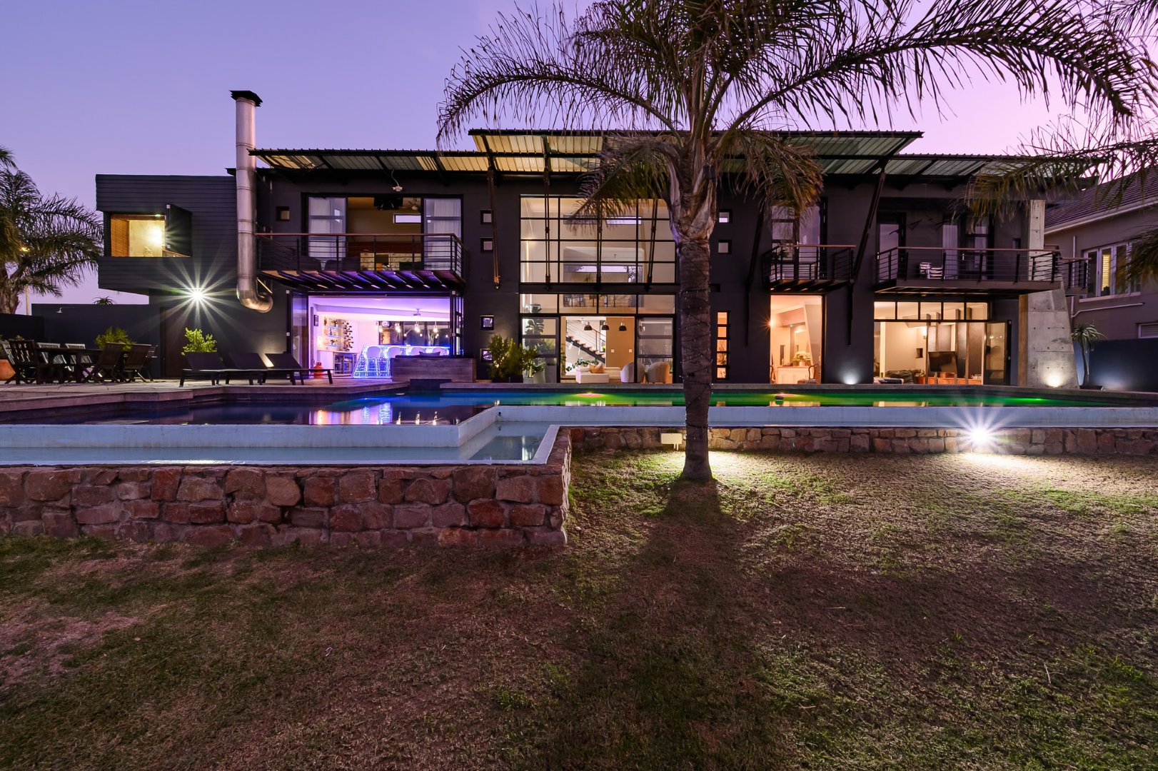 Additional highlights include a self-contained flatlet with separate entrance, perfect for extended stays or passive income, plus a domestic suite, private gym and dedicated office area. Sustainability meets innovation with a 10kVA inverter system, 10 solar panels and two 5,000L rainwater tanks, all seamlessly integrated.