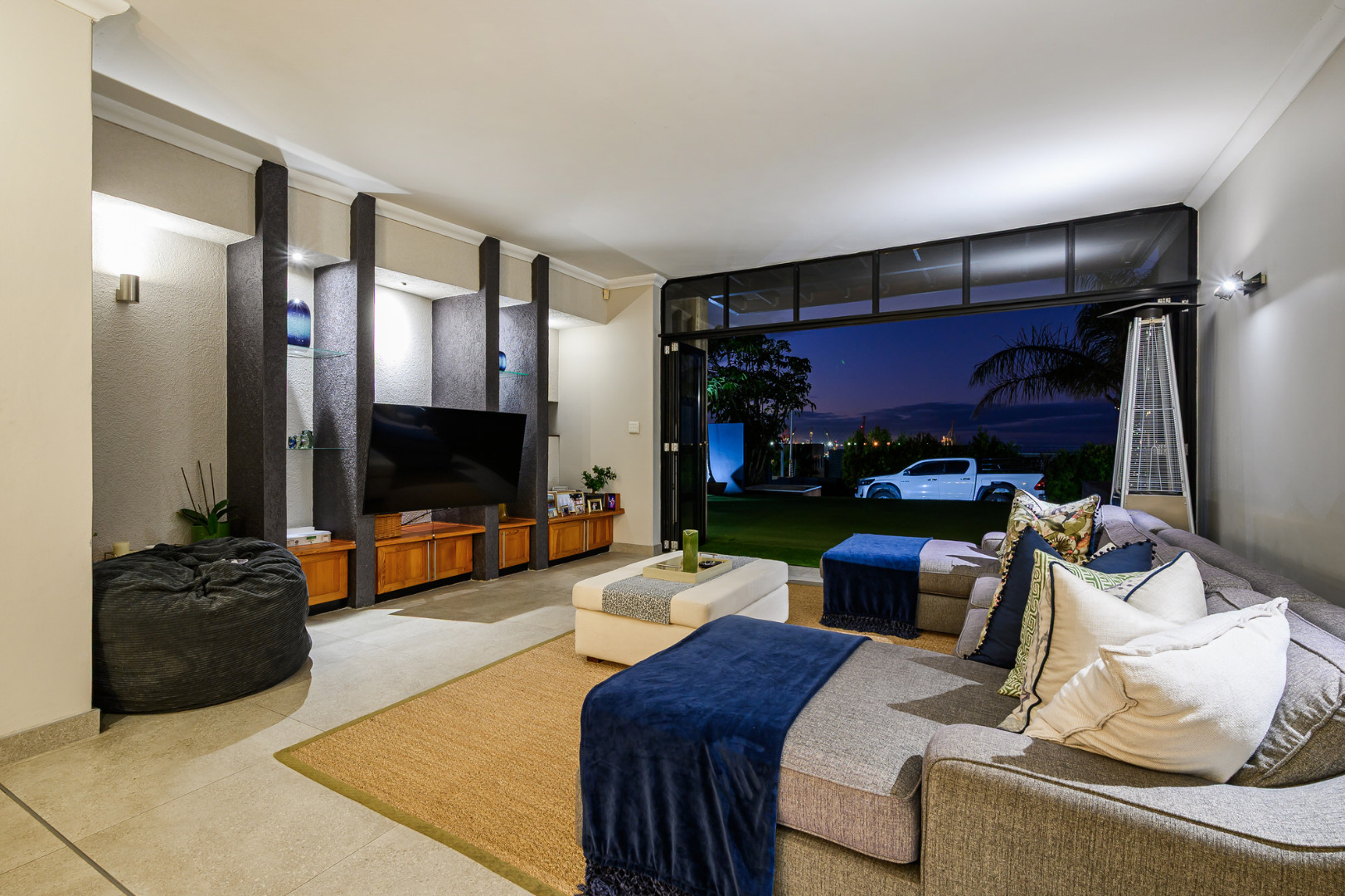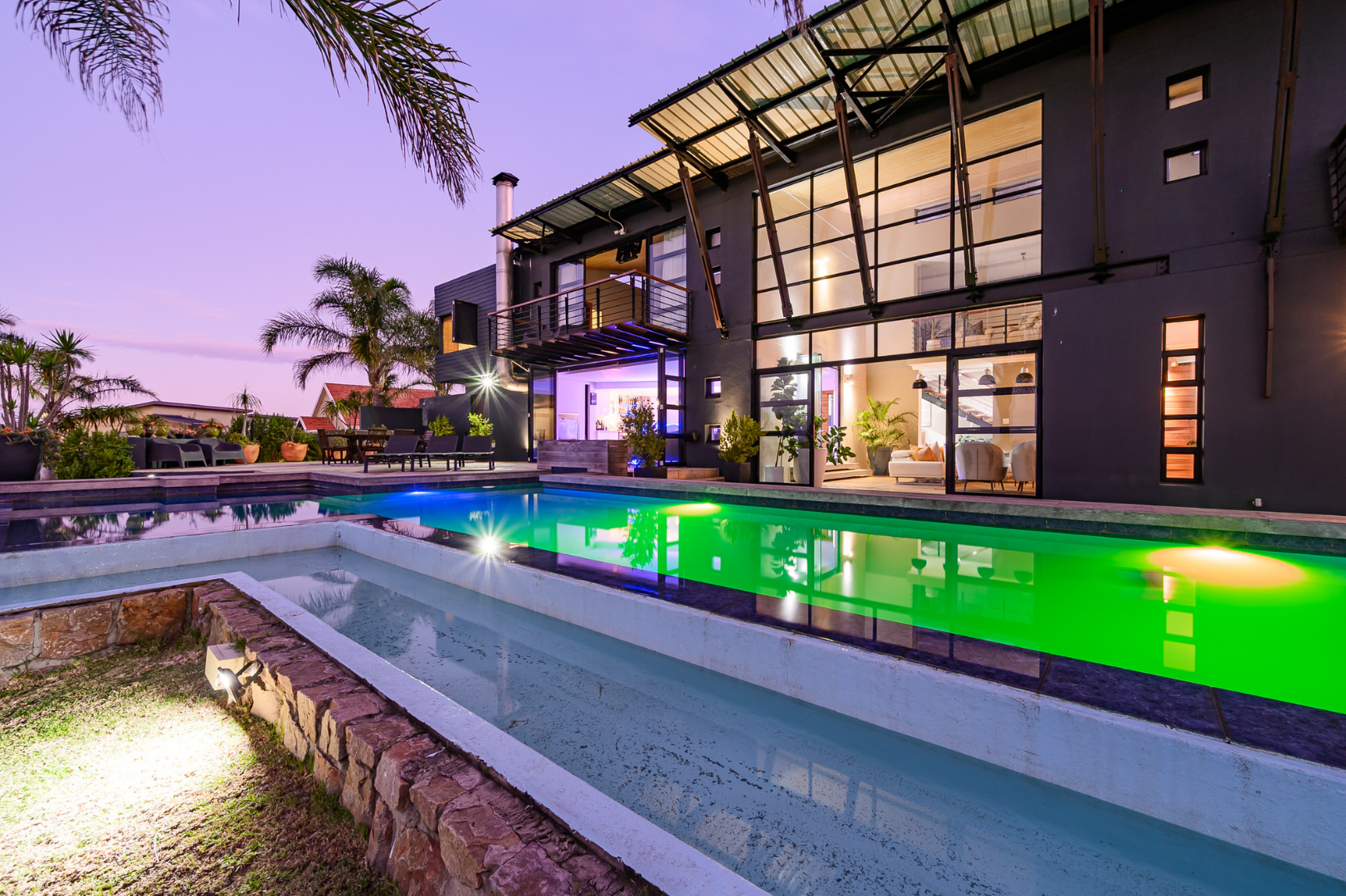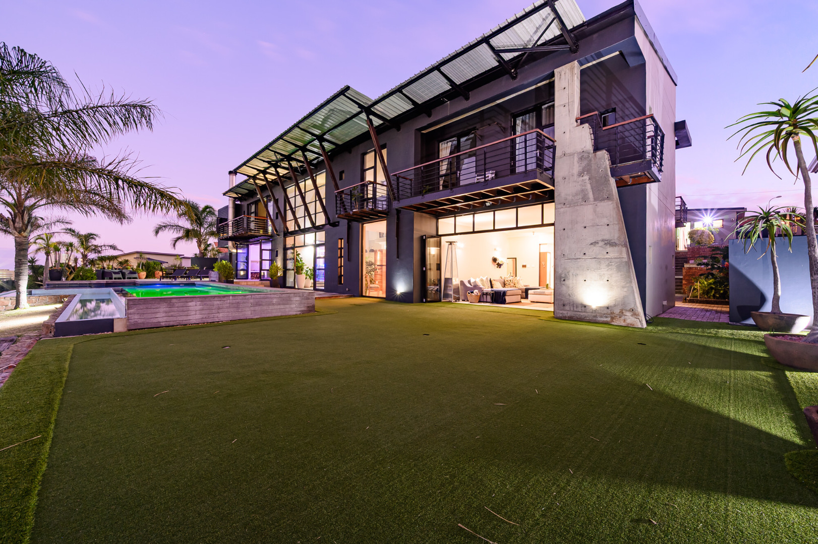 Designed to capture the beauty of its surroundings, the residence merges glass, steel, and natural finishes into a bold yet elegant form. Double-volume living areas open onto a seamless indoor-outdoor flow, with floor-to-ceiling windows, stacking doors, and North-facing perspectives that draw in warmth and light. At its heart lies a sculpted rim-flow pool, flanked by a private putting green, manicured synthetic lawn, and low-maintenance terrace ideal for alfresco entertaining.