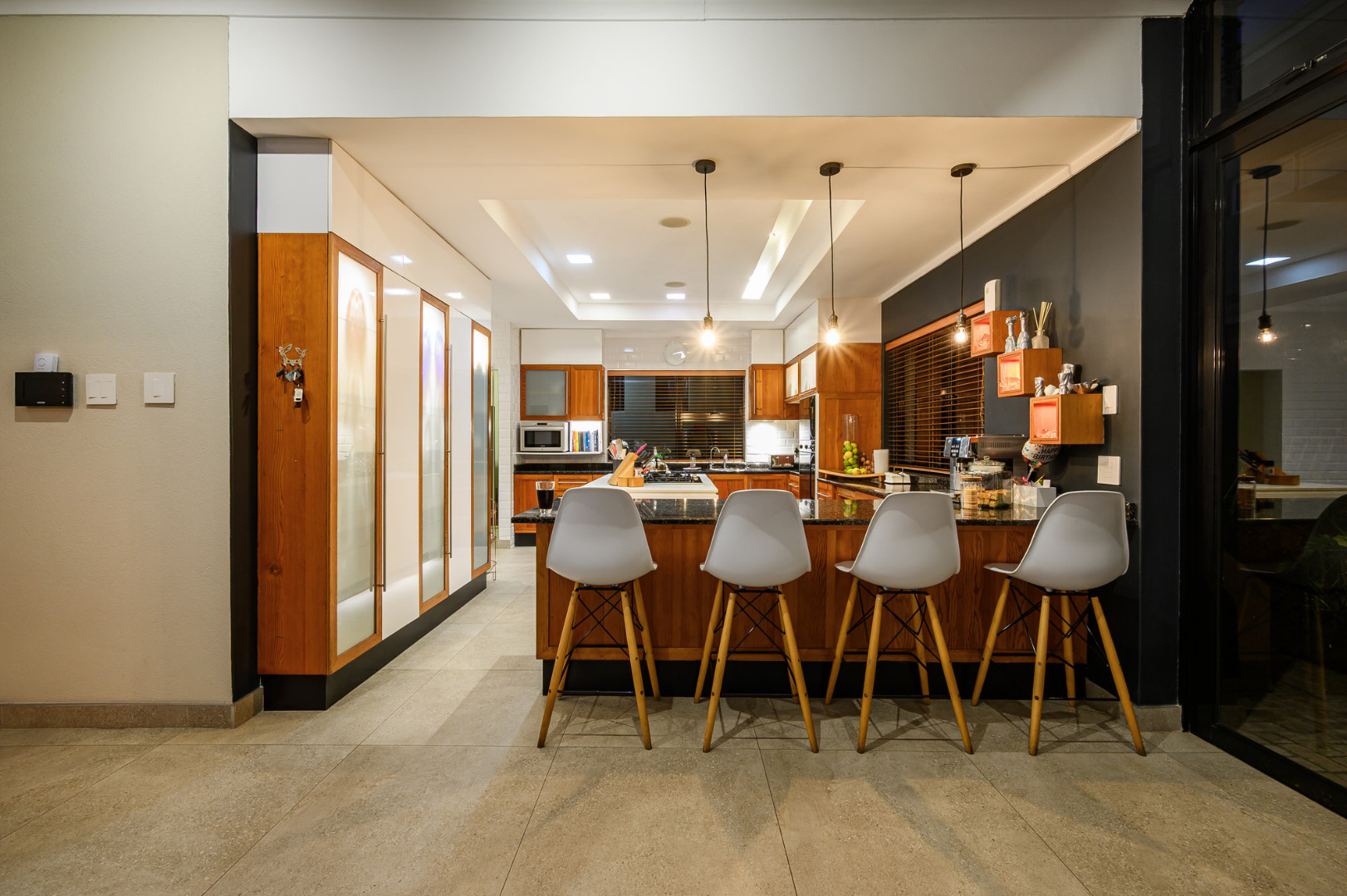 The gourmet kitchen, crafted with solid wood cabinetry and granite surfaces, features a gas hob, double eye-level oven, scullery, and laundry, complemented by a filtered water system and adjacent utility area. Entertain in effortless style from the sleek bar lounge with stainless steel built-in braai, flowing onto the pool deck and garden with cinematic views.