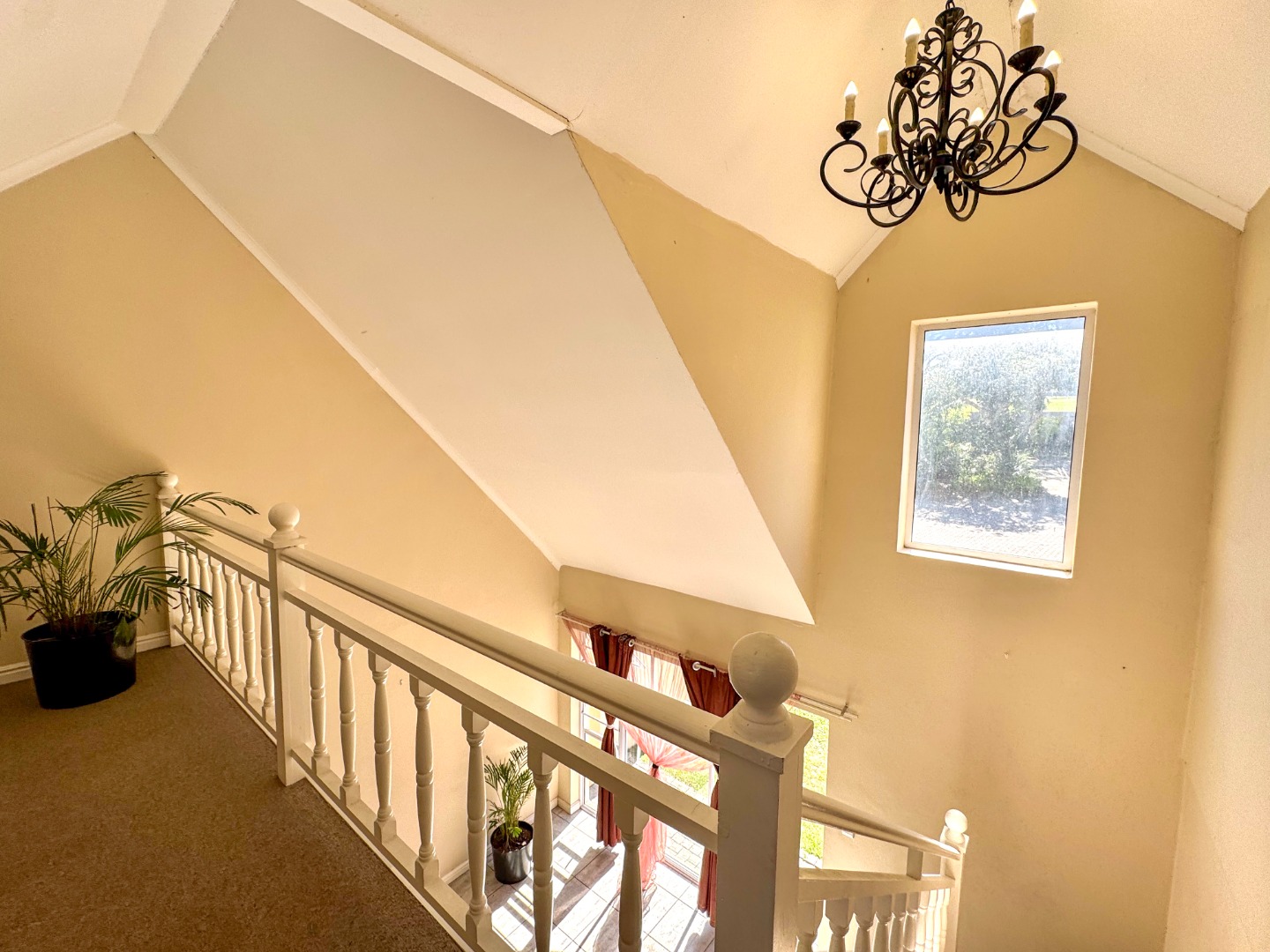 The home also features a stunning chandelier and a large window on the staircase, adding style and light.