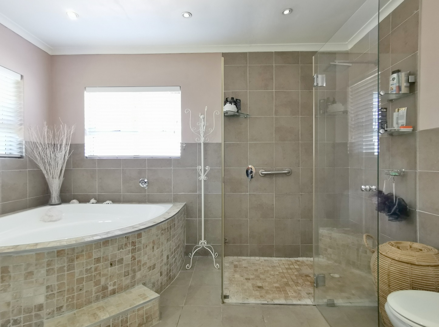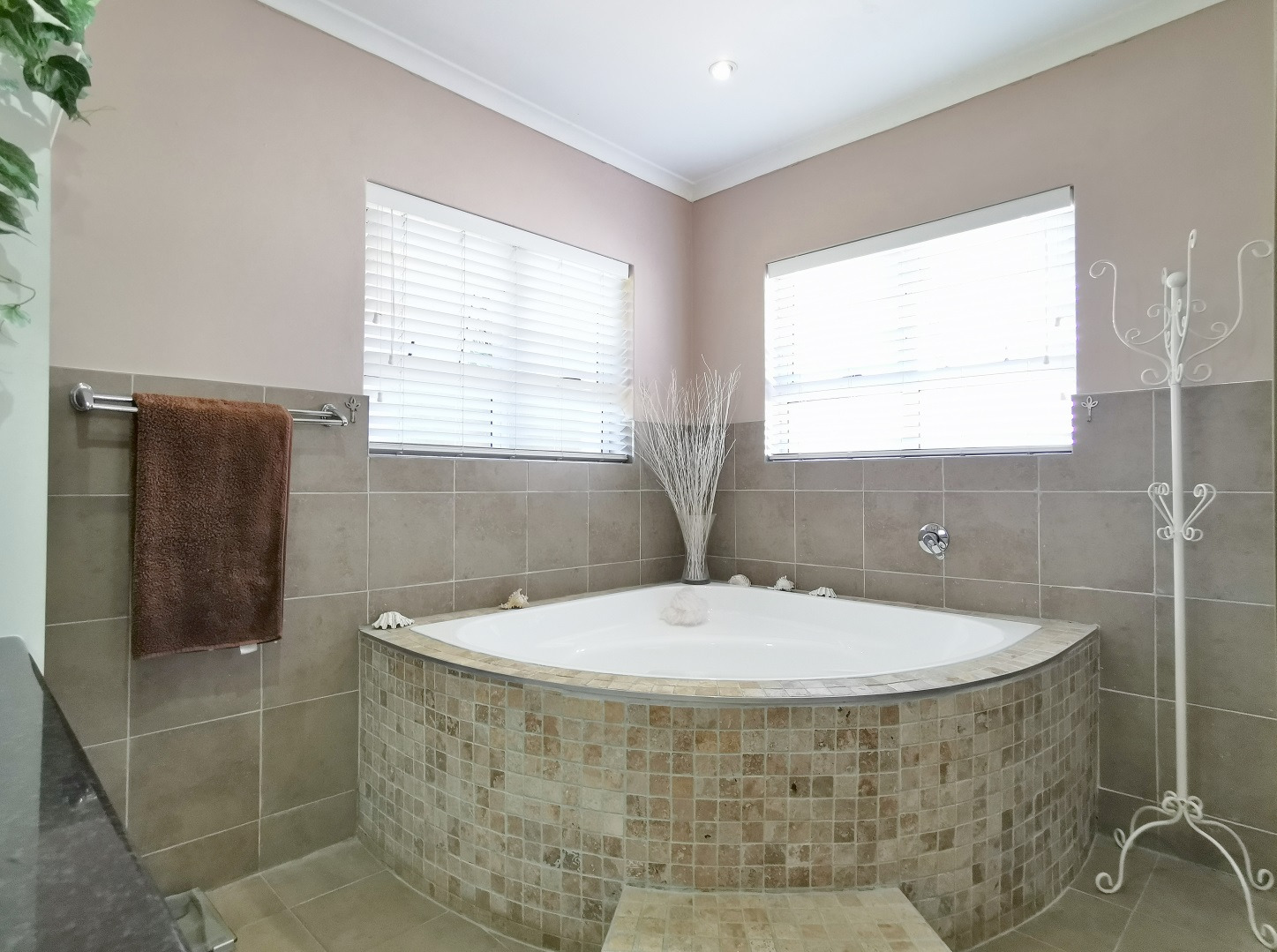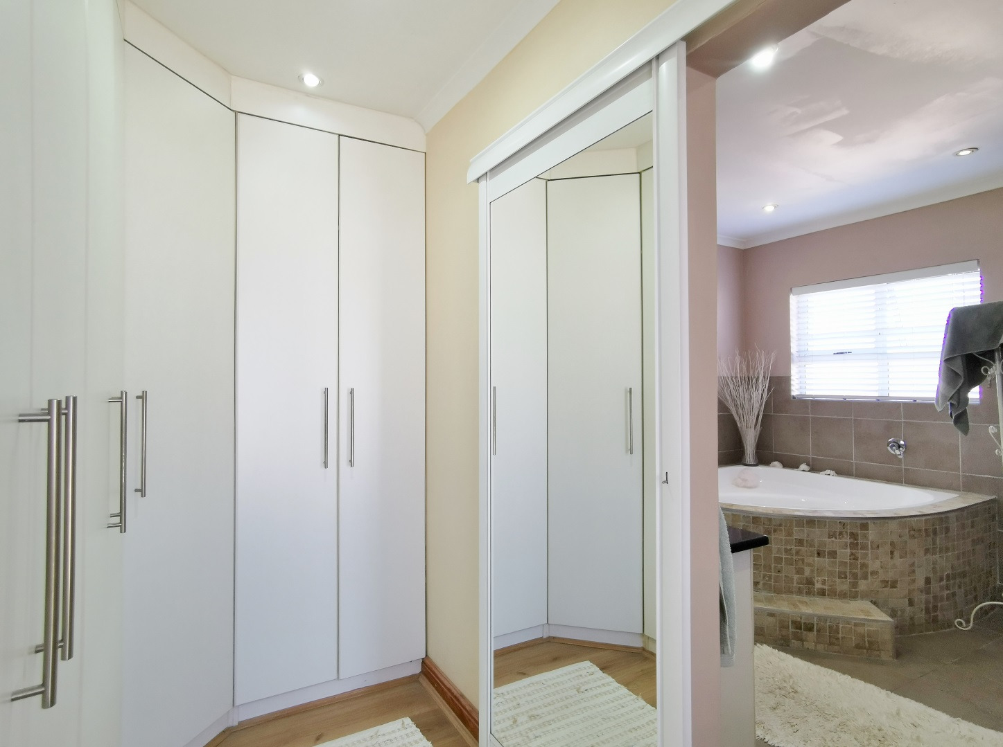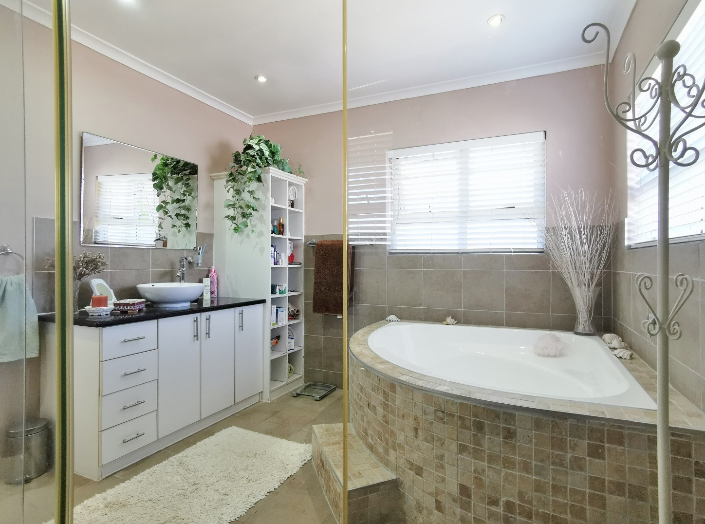 The home features three bedrooms and two bathrooms. The main bedroom includes an en-suite bathroom accessed through a walk-in wardrobe and fitted with a corner bath, shower and laundry point. The second bathroom includes a bath with shower and basin.