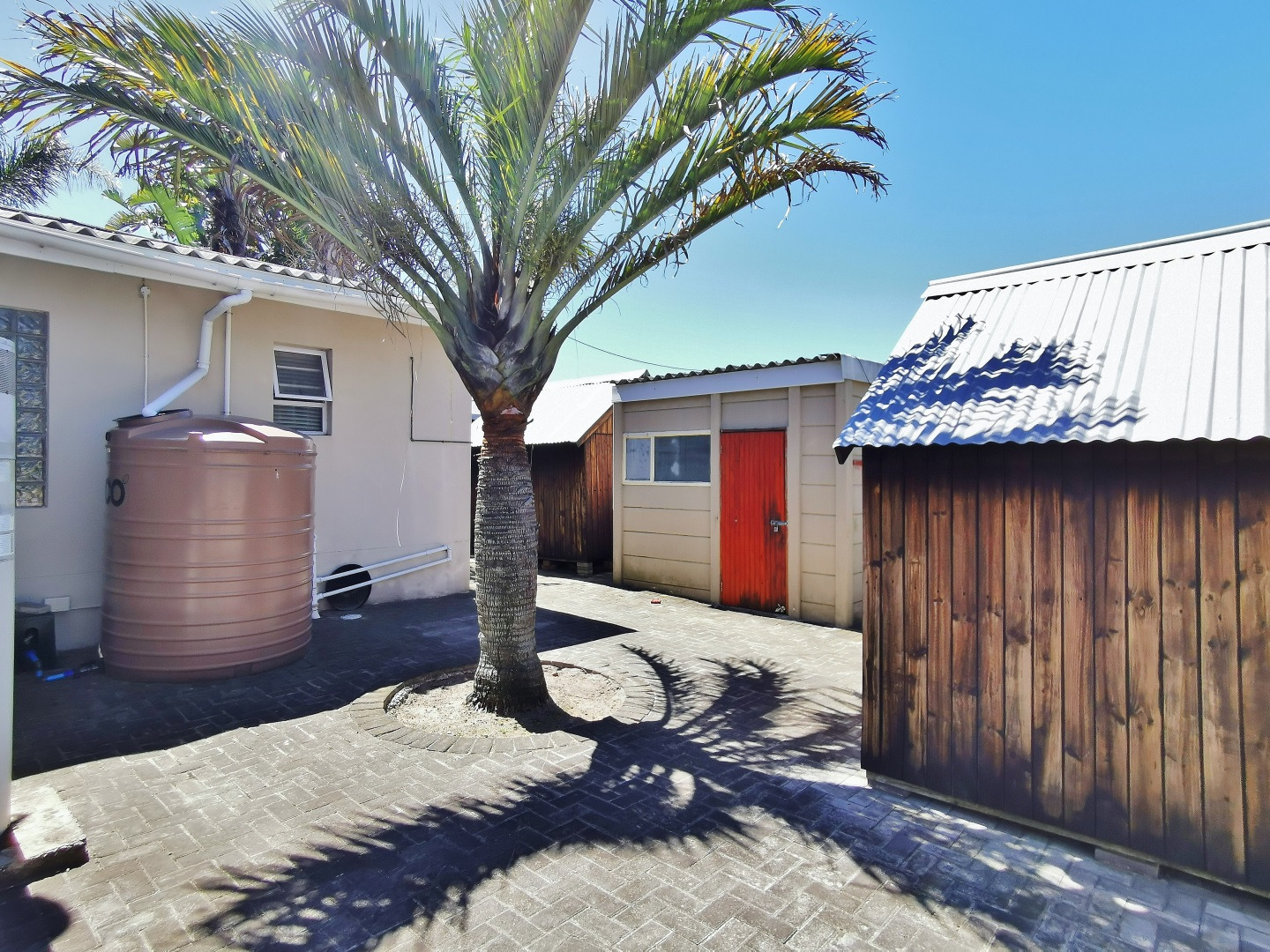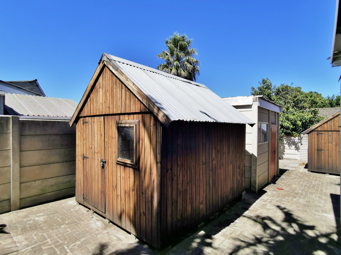 Parking is well catered for with a covered carport for three vehicles as well as a single garage. The rear section of the property is paved and includes two Wendy houses and a separate storage room. A domestic bathroom is located near the upright heat pump.