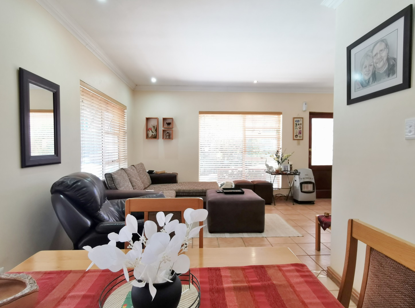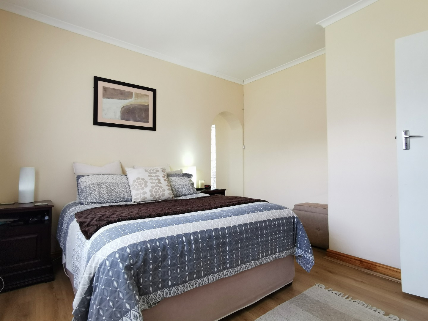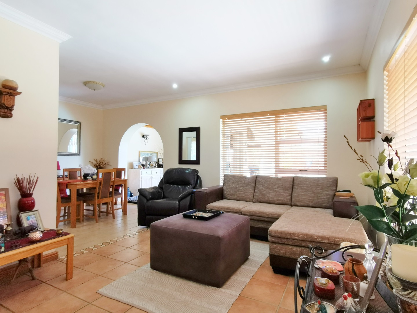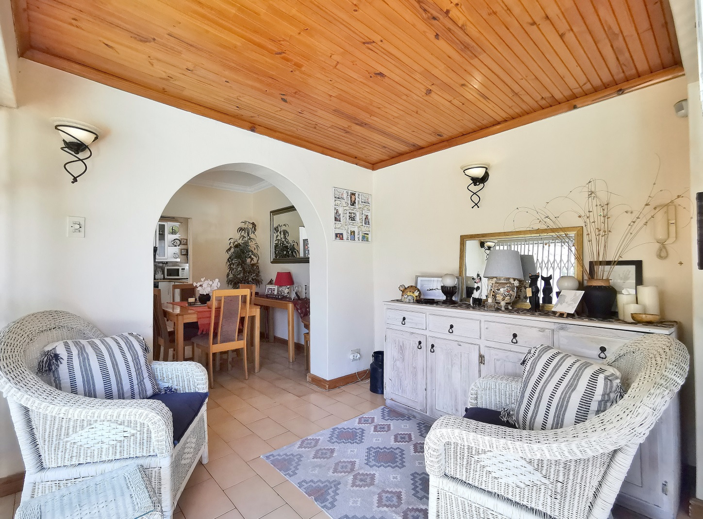 Security features include trellis security doors and burglar bars fitted throughout the home. The property is tiled throughout, with laminate flooring in the bedrooms for added comfort.