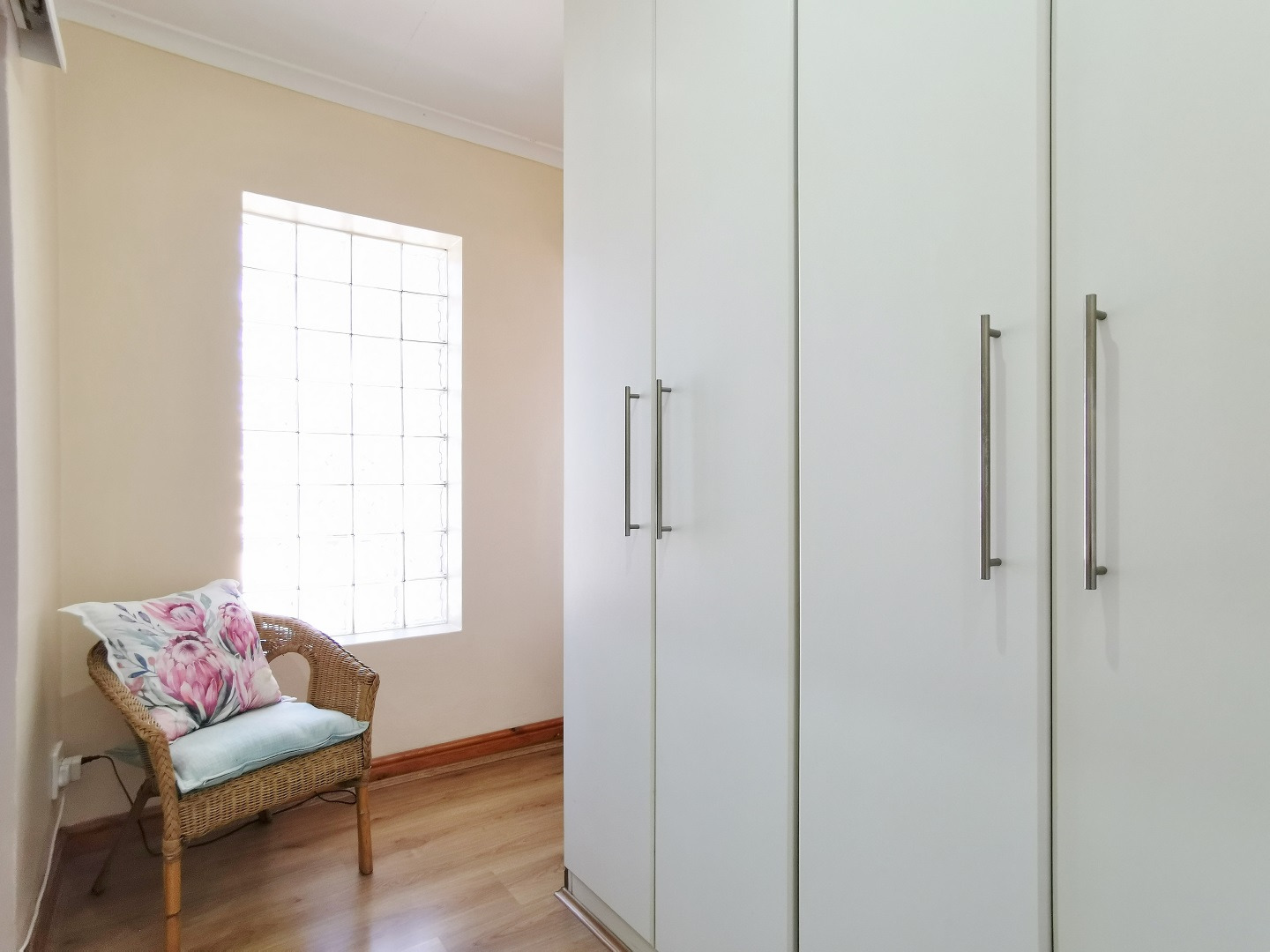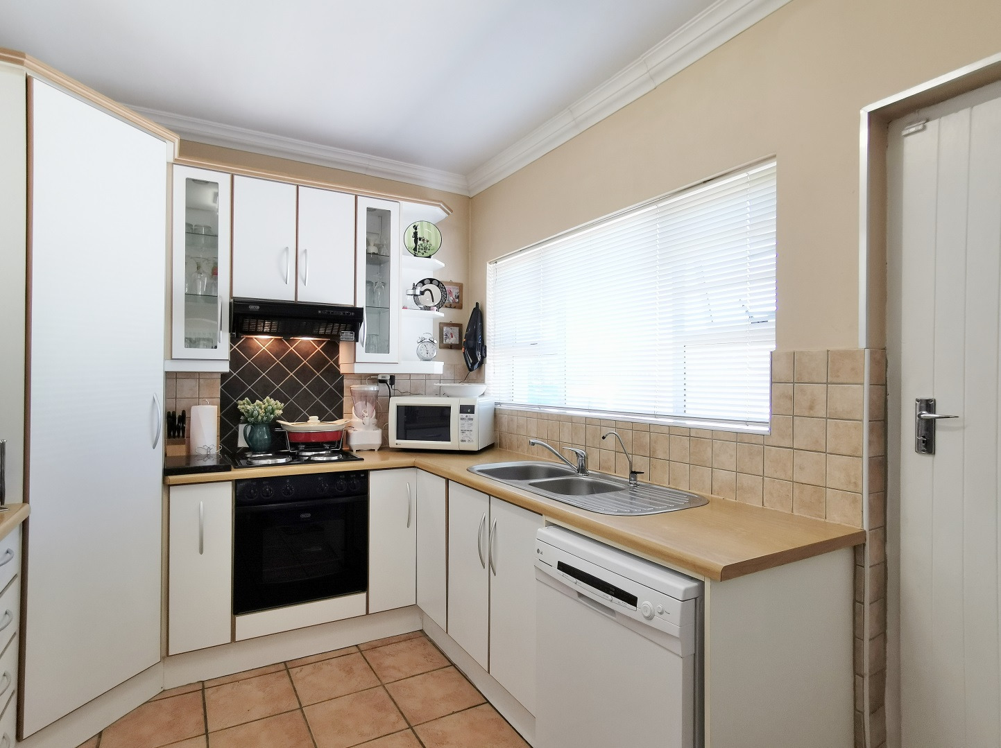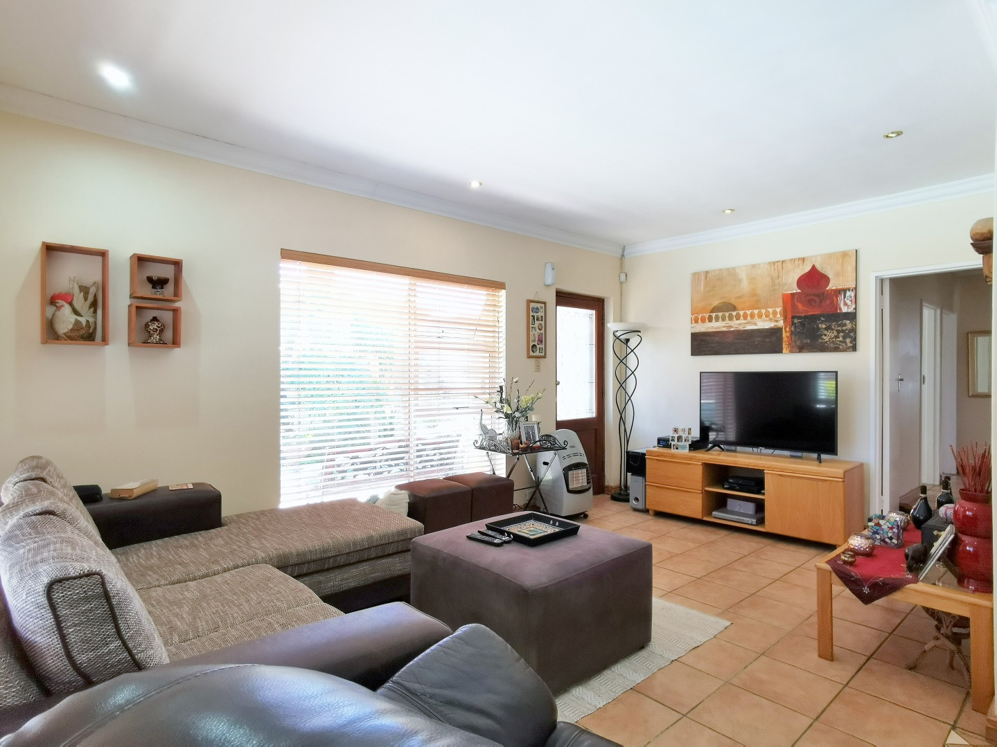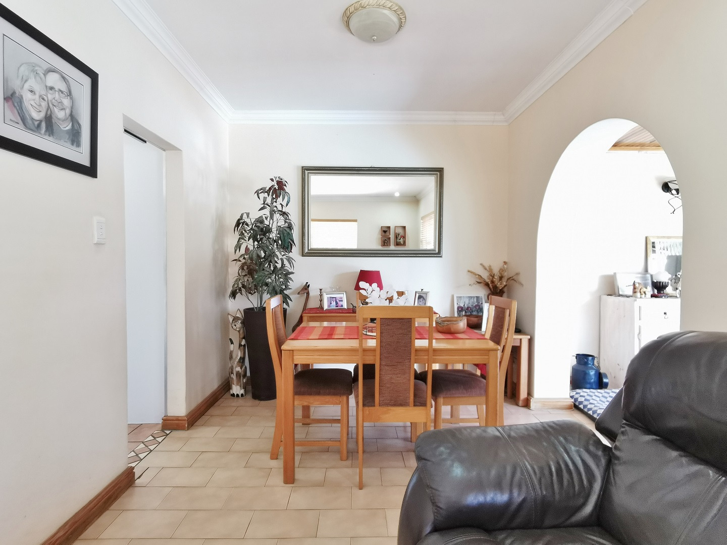 Security features include trellis security doors and burglar bars fitted throughout the home. The property is tiled throughout, with laminate flooring in the bedrooms for added comfort.