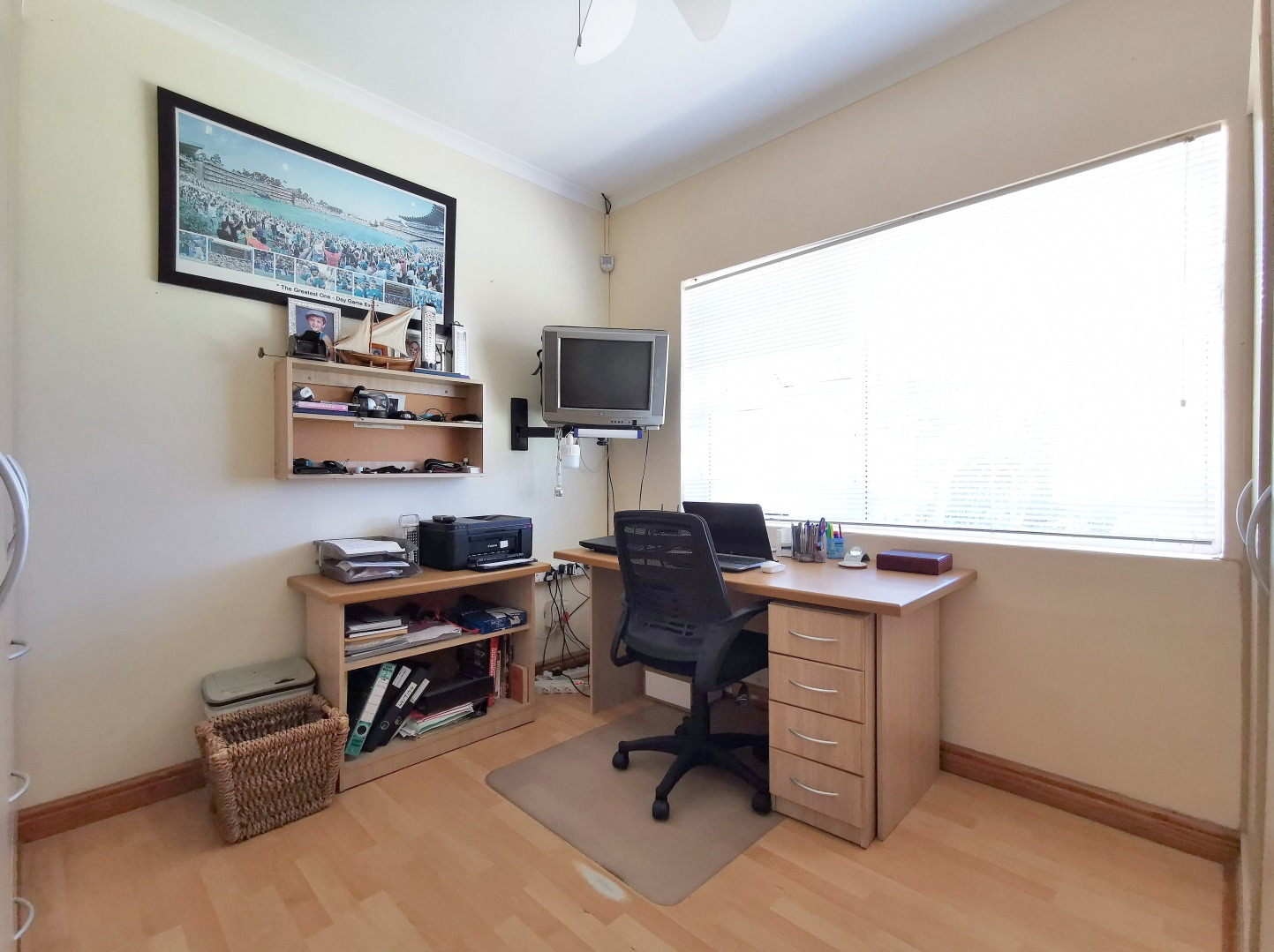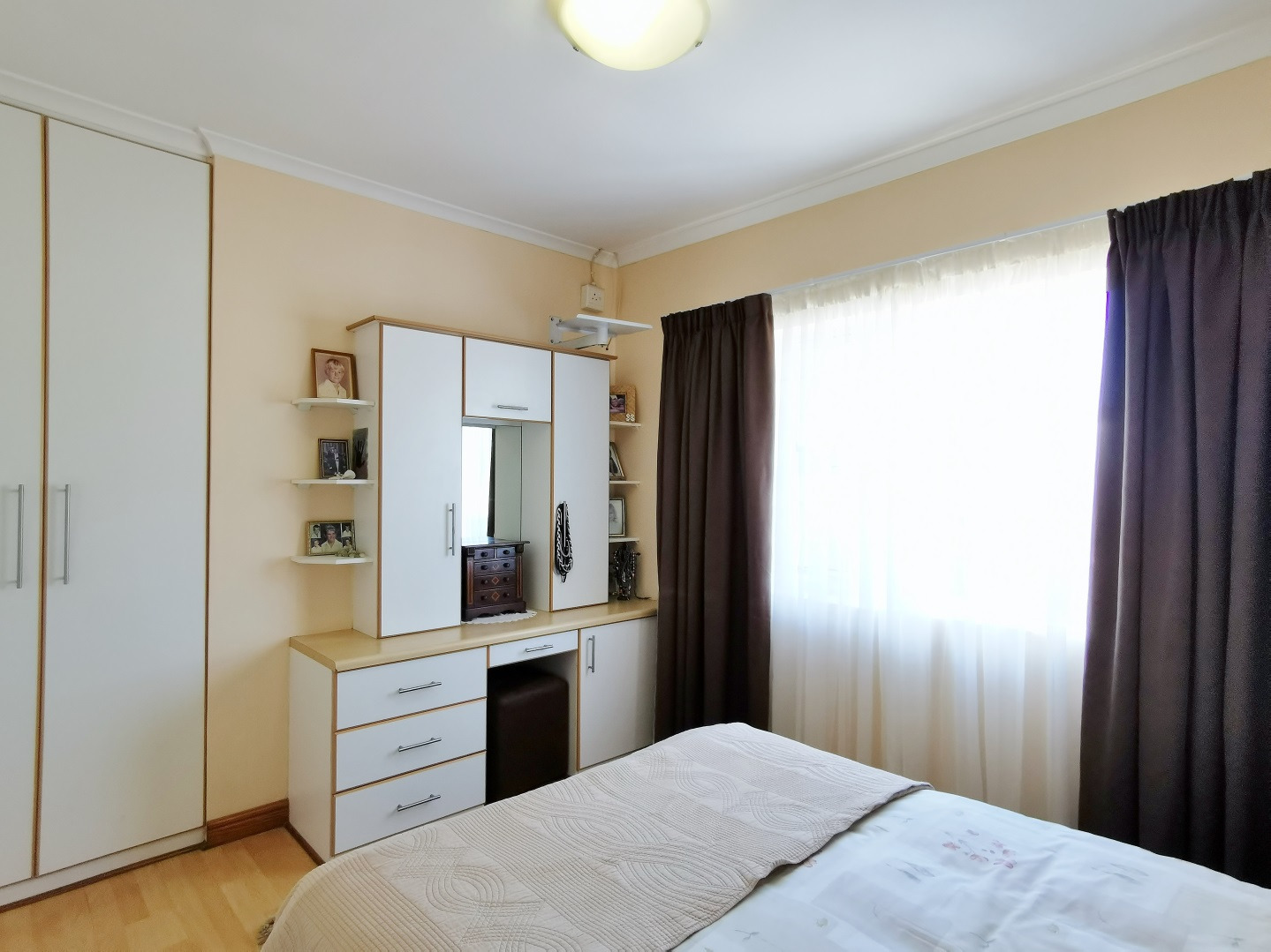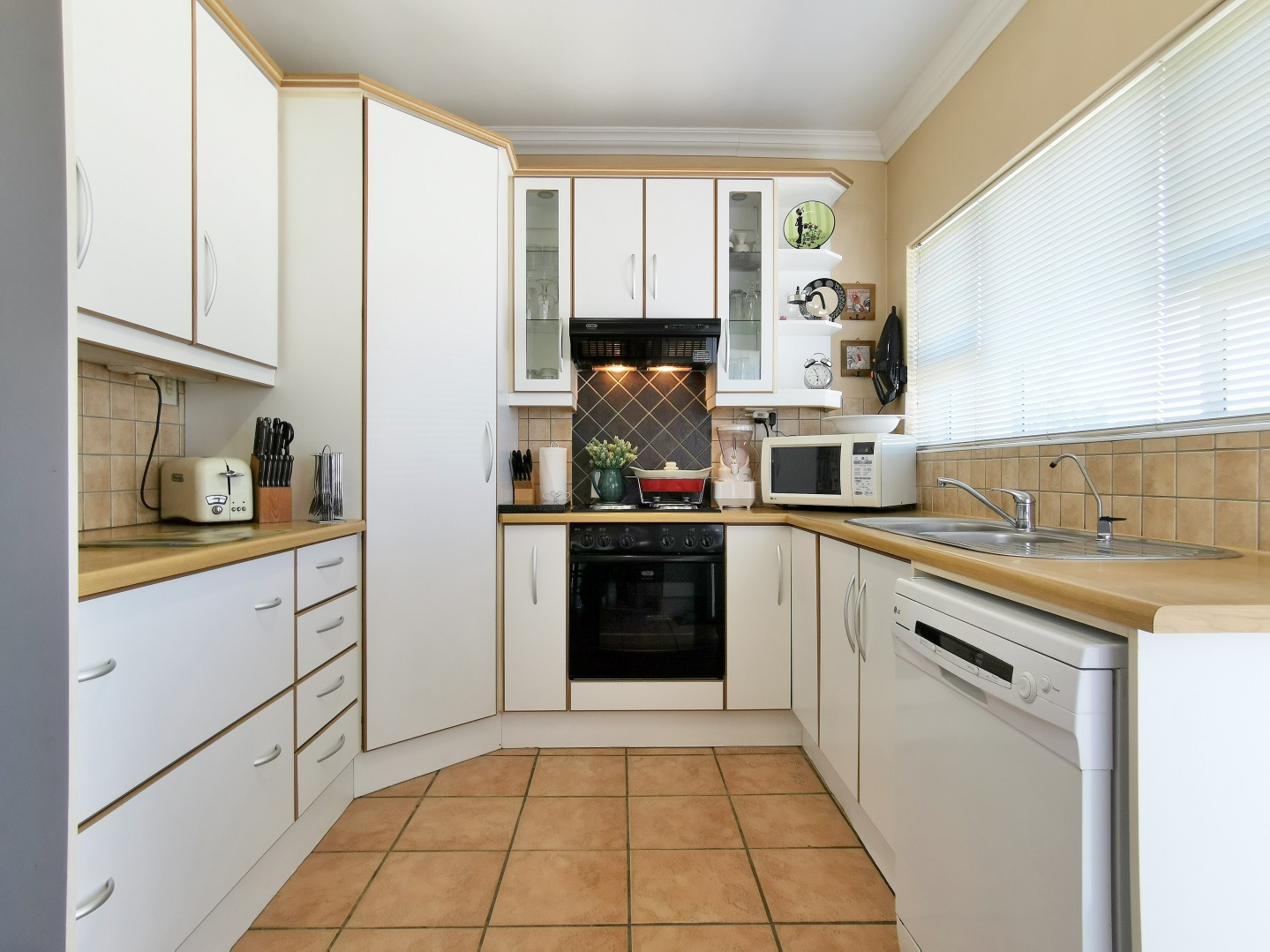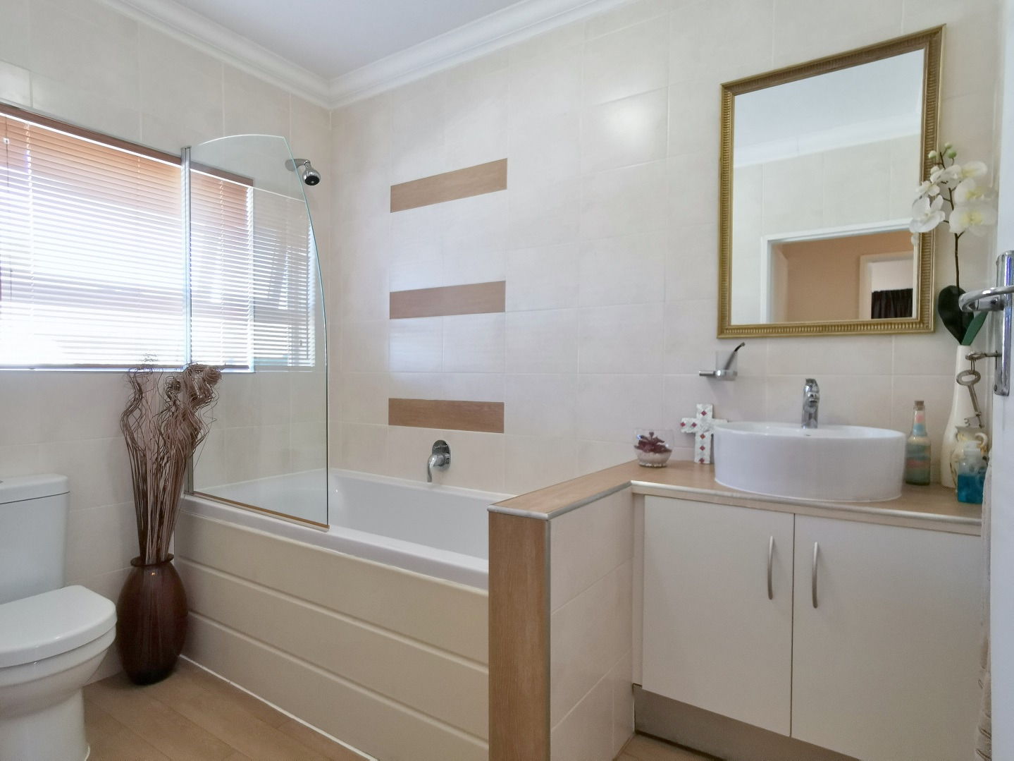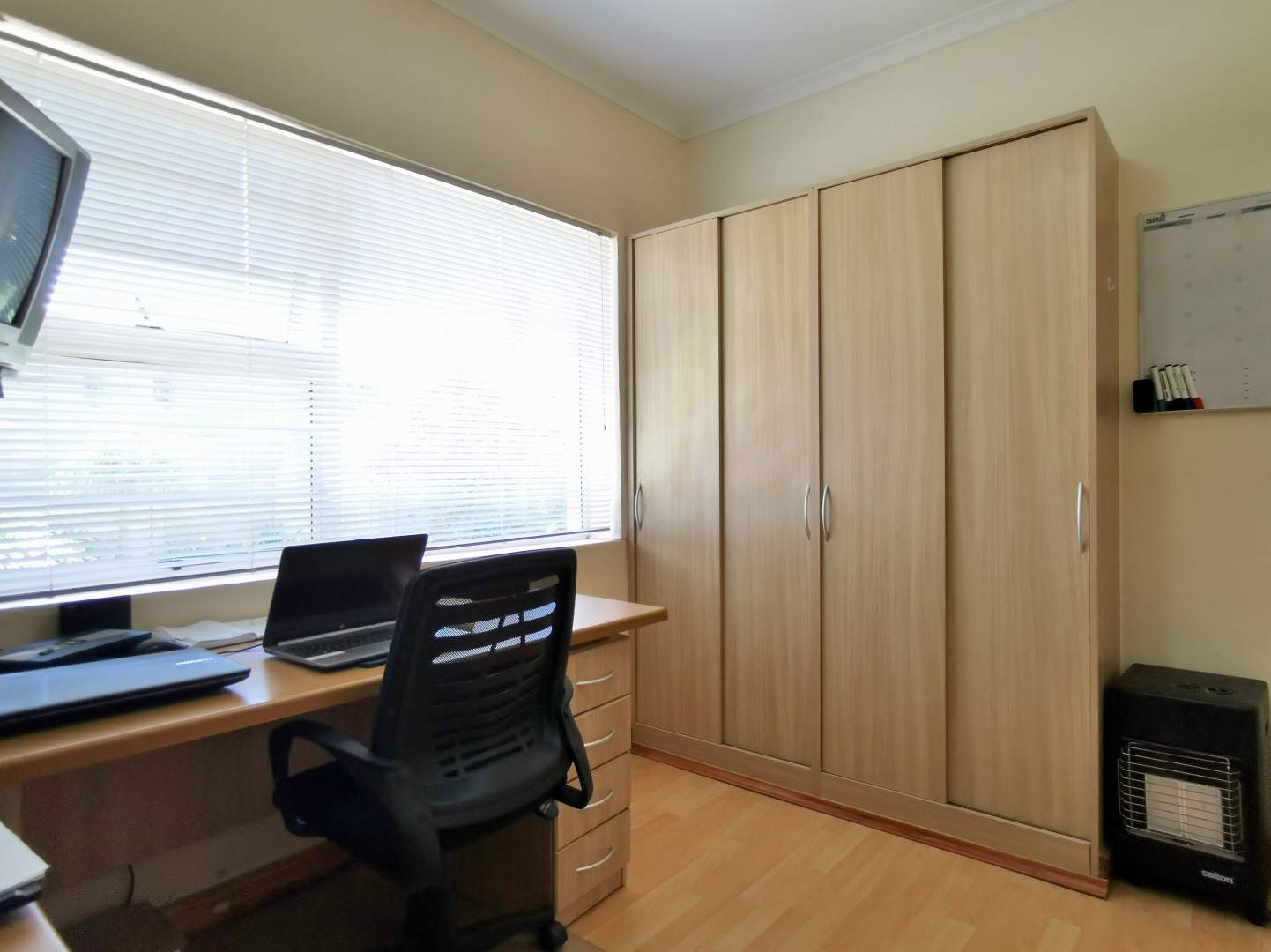 Security features include trellis security doors and burglar bars fitted throughout the home. The property is tiled throughout, with laminate flooring in the bedrooms for added comfort.