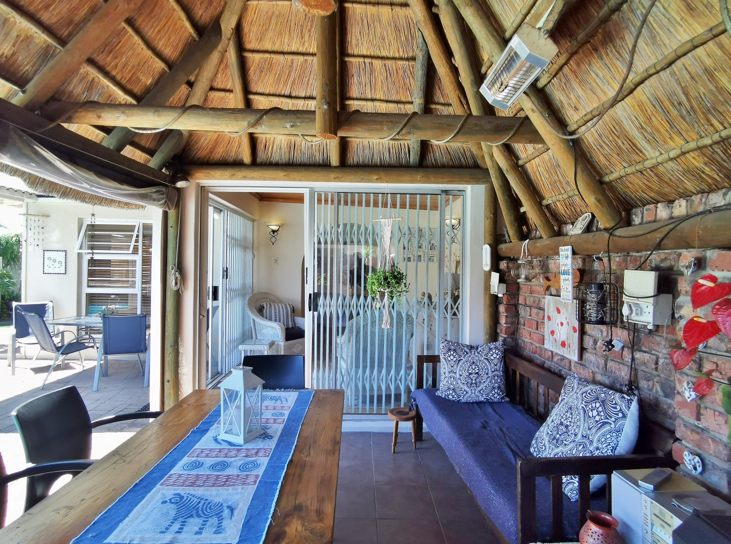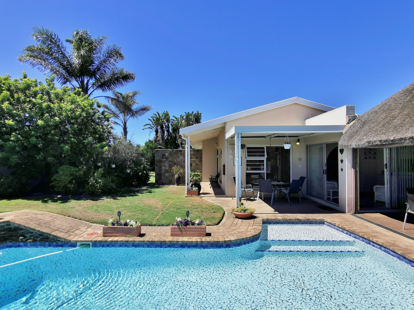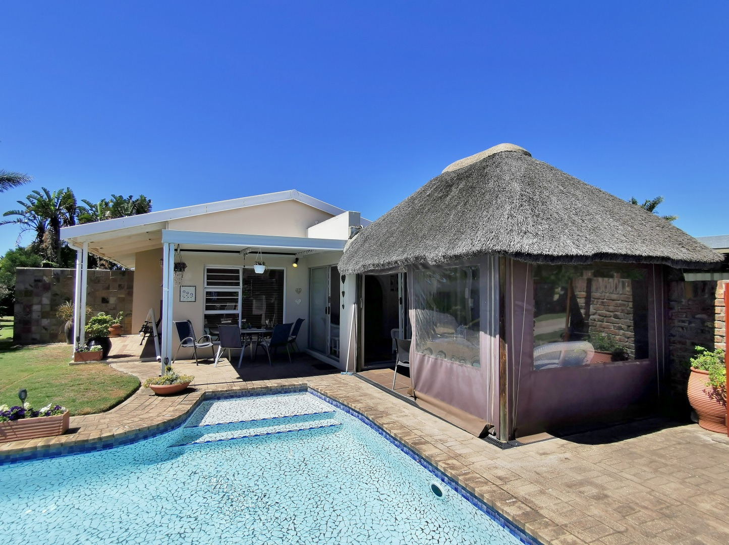 The kitchen offers ample cupboard space and flows into the dining area, which connects to an informal sun lounge. From here, the home extends into a thatch-roof entertainment area overlooking the pool, creating a relaxed and inviting entertainment space.