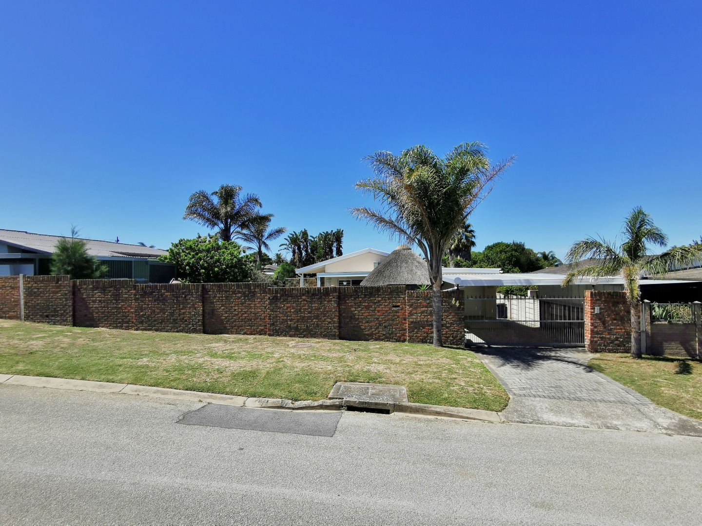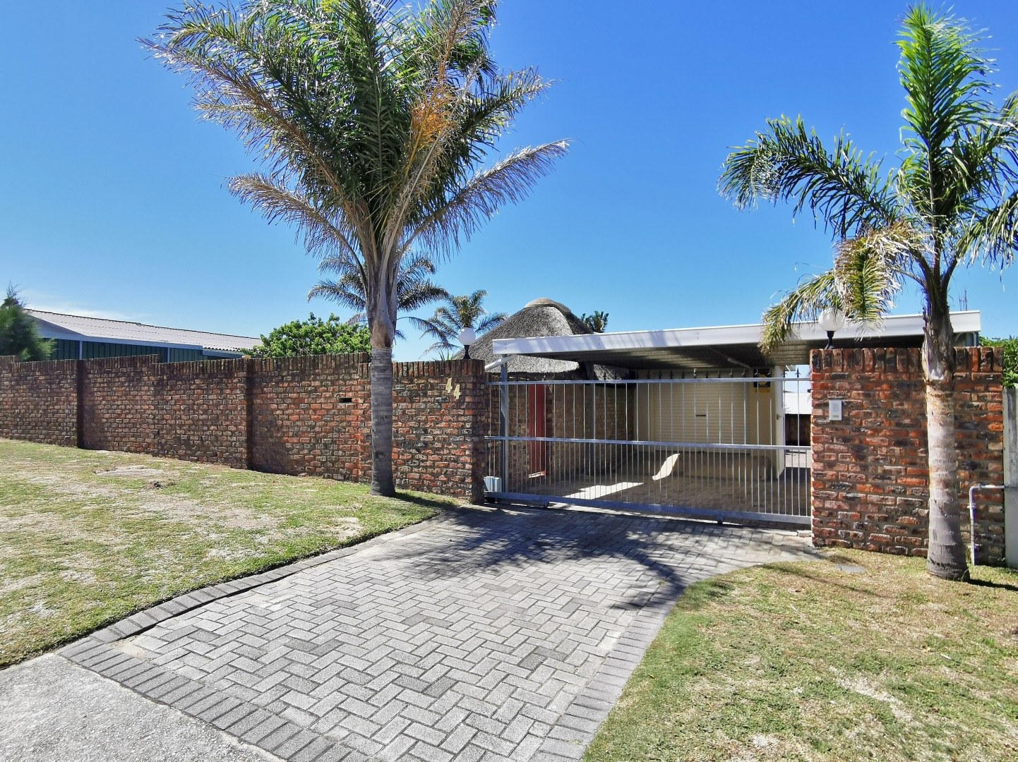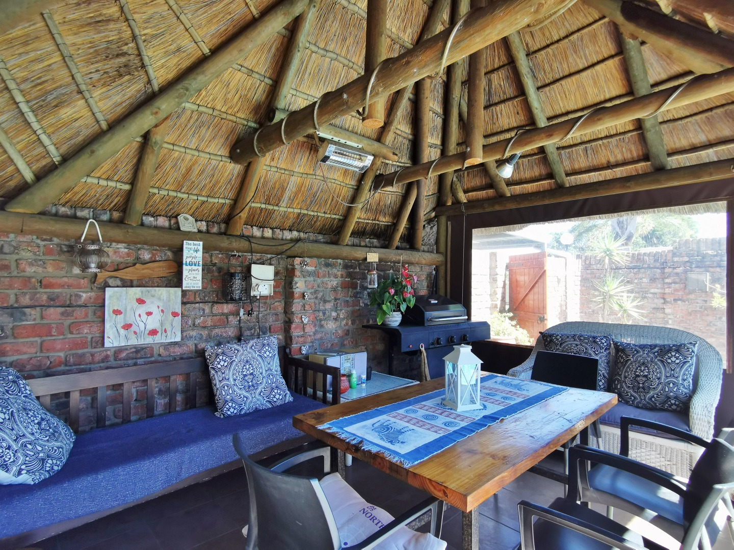 The kitchen offers ample cupboard space and flows into the dining area, which connects to an informal sun lounge. From here, the home extends into a thatch-roof entertainment area overlooking the pool, creating a relaxed and inviting entertainment space.