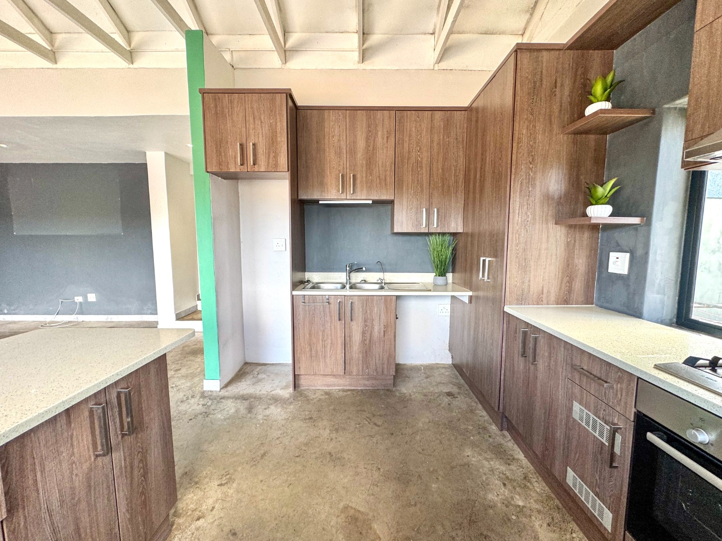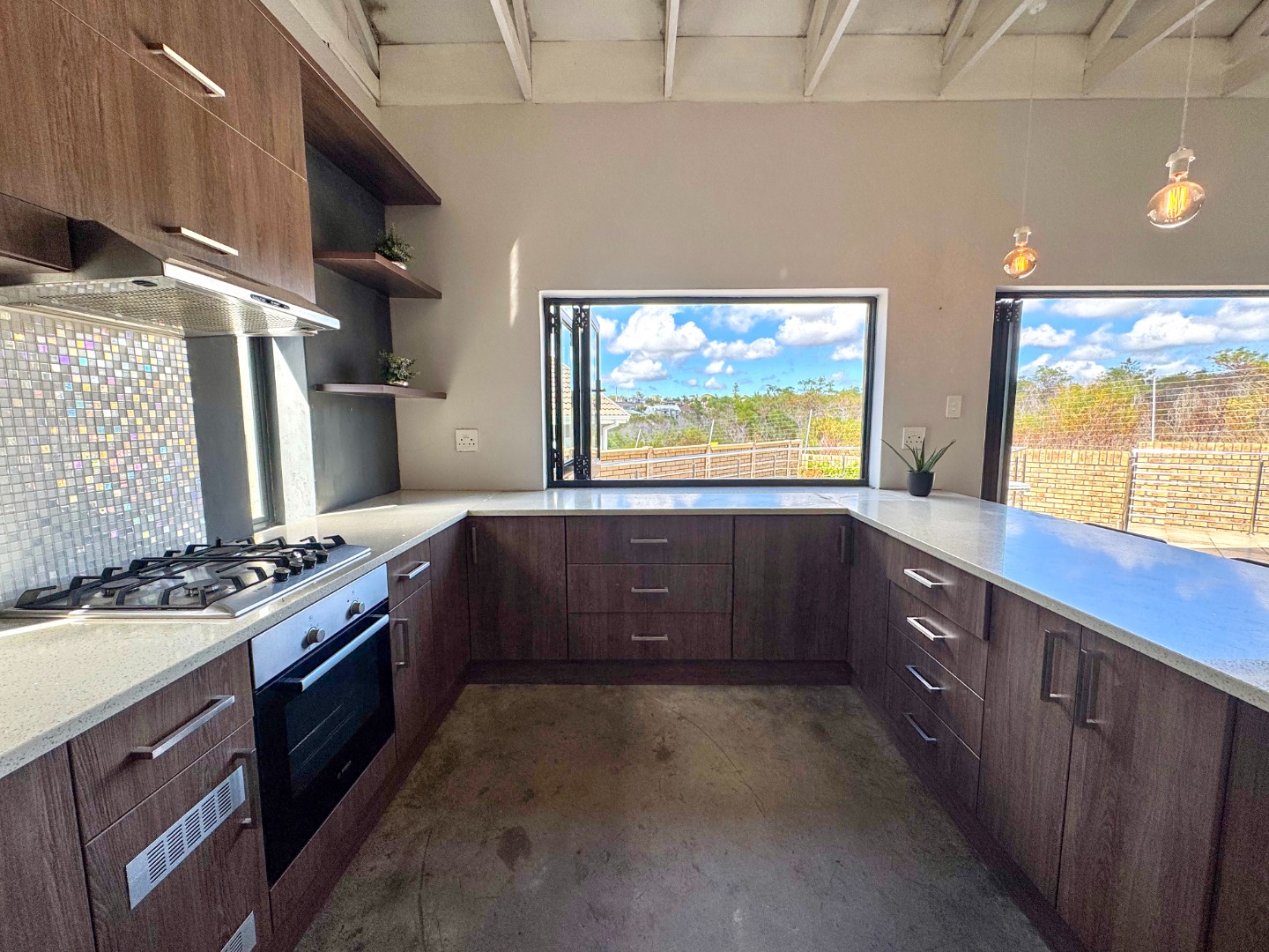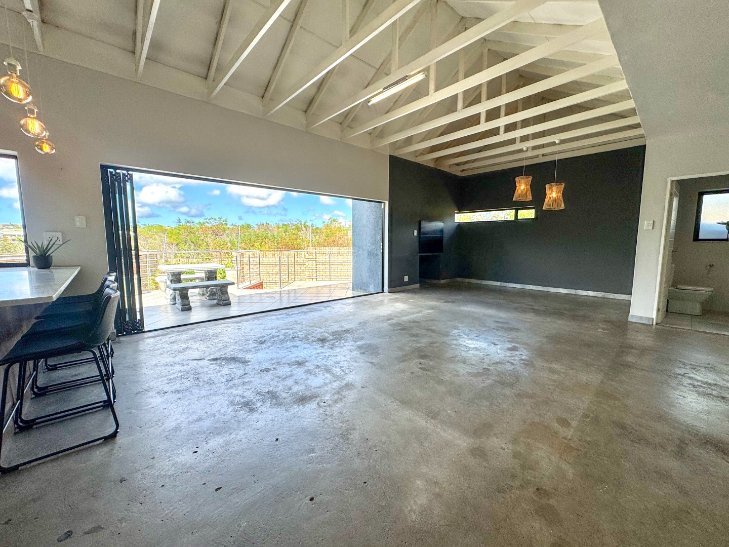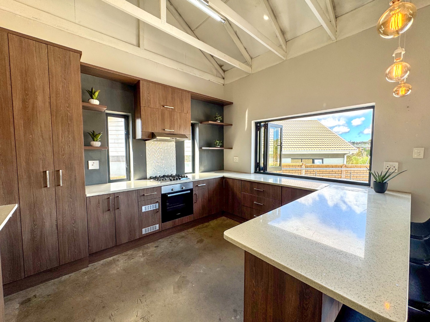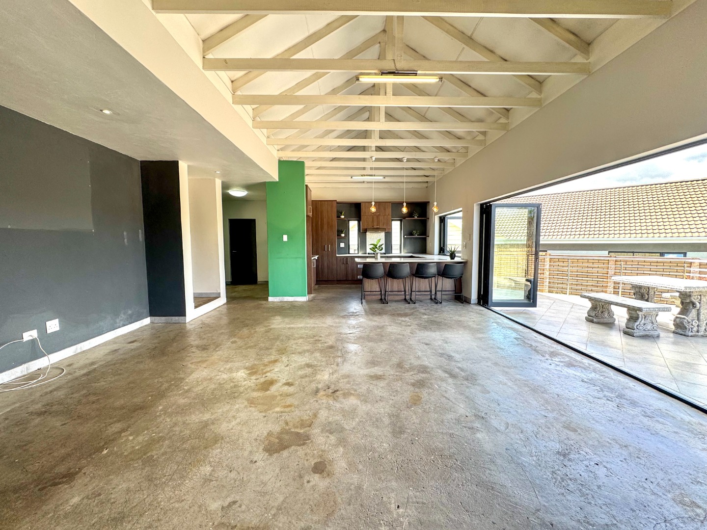 The spacious open-plan lounge, dining area, and kitchen flow seamlessly onto an entertainers’ deck through stacker doors, creating the perfect indoor-outdoor living experience. An indoor and outdoor braai ensures year-round entertaining.