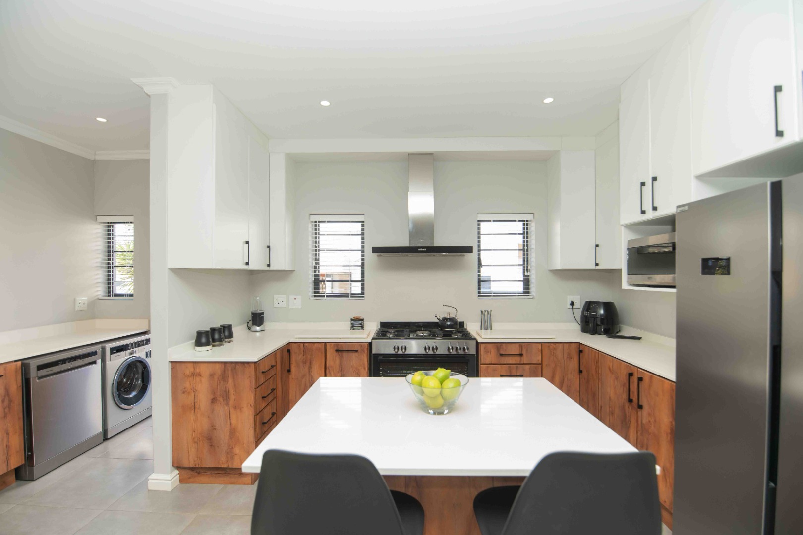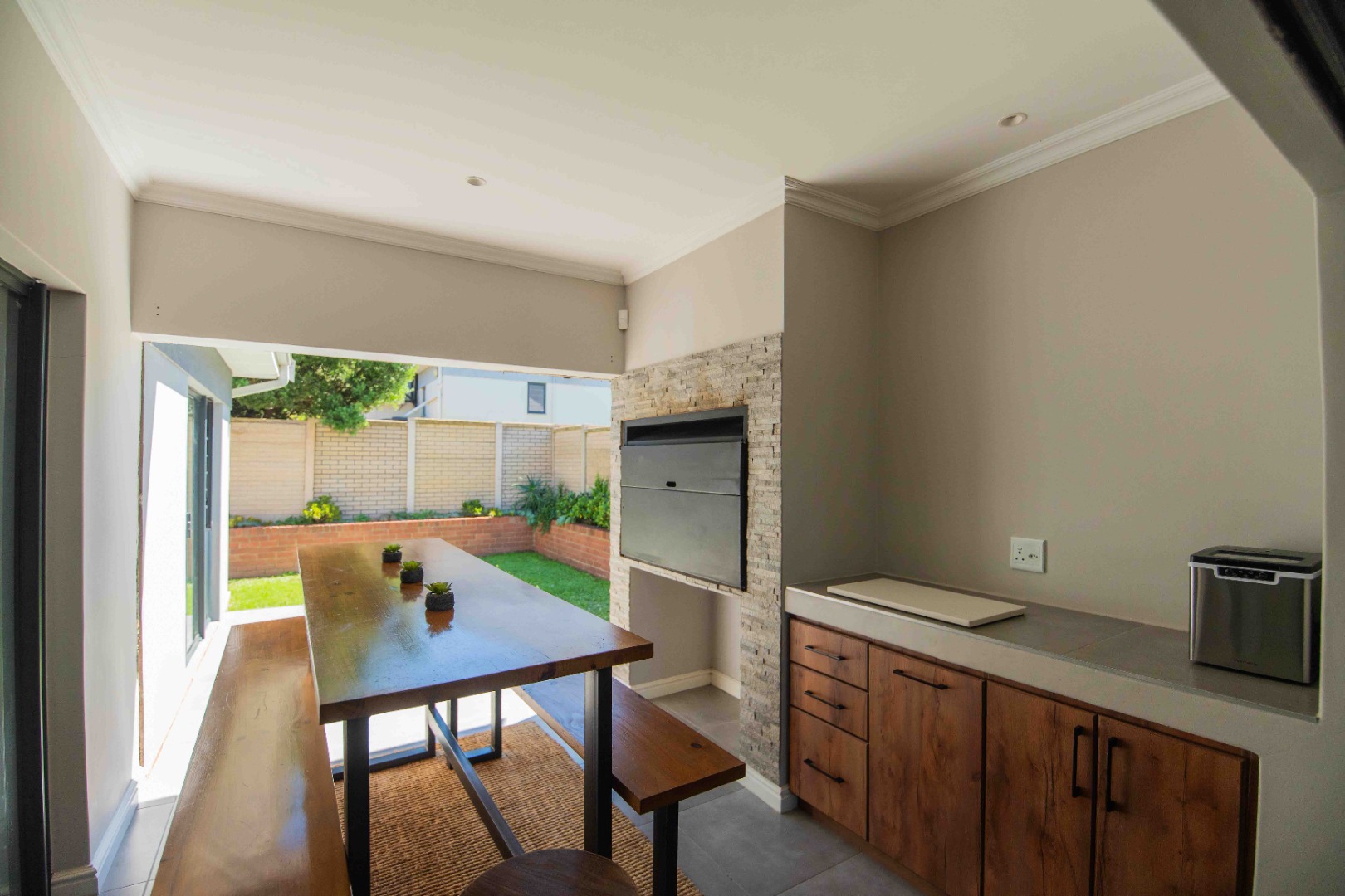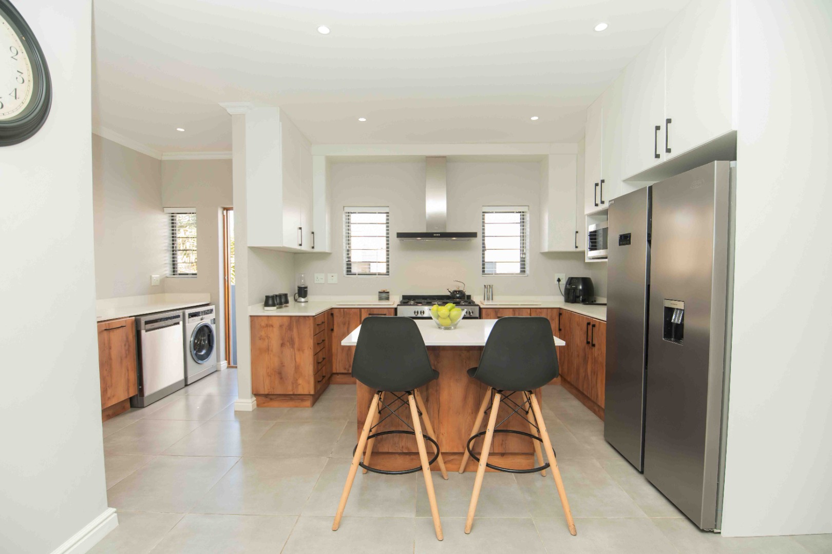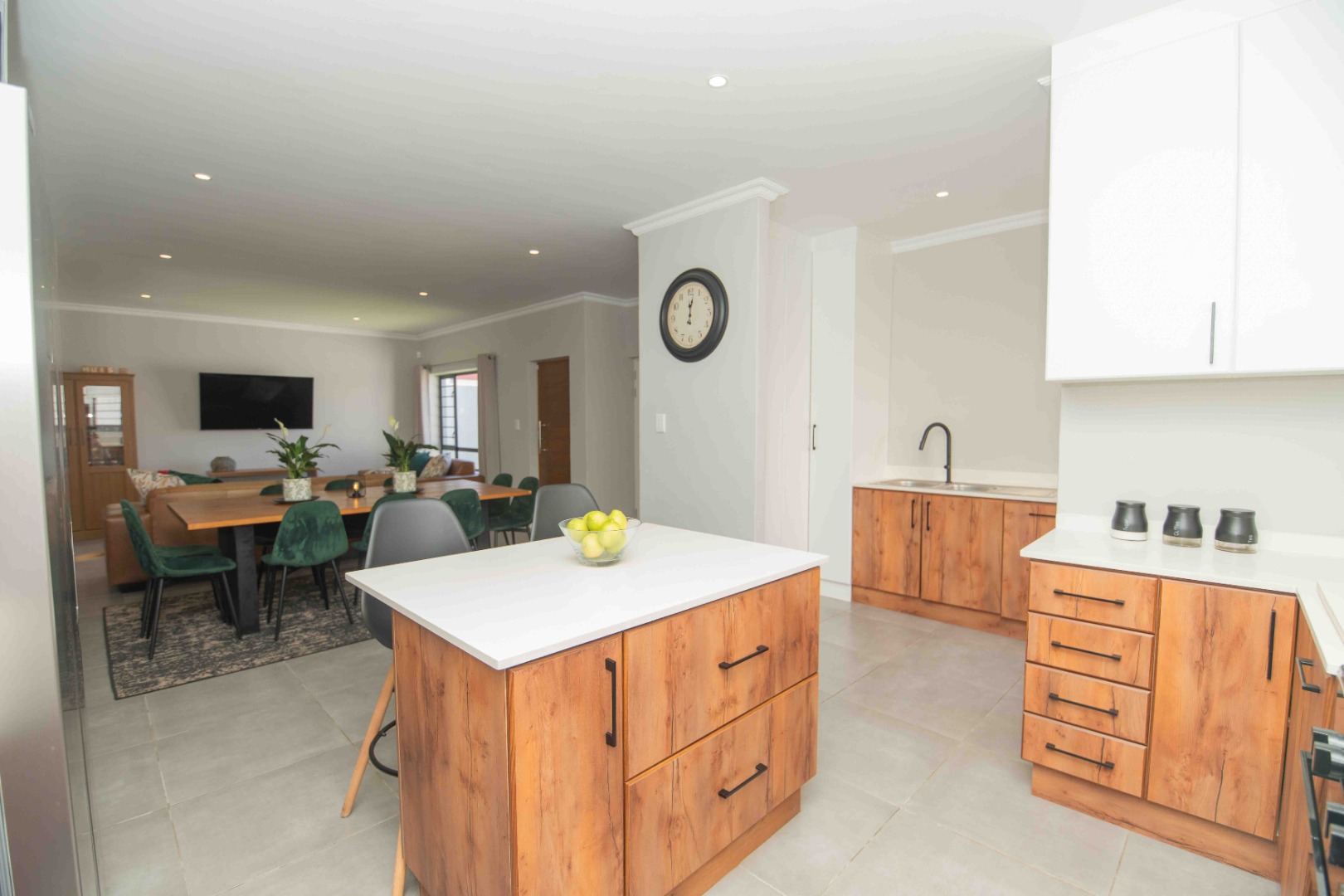 At the heart of the home, a beautifully appointed open-plan kitchen with scullery combine form and function, featuring a freestanding oven with gas hob and modern quartz counters throughout. Perfectly suited to both everyday living and stylish entertaining. The adjoining living areas extend effortlessly onto a covered verandah with a built-in braai, creating a seamless indoor/outdoor lifestyle ideal for year-round enjoyment.