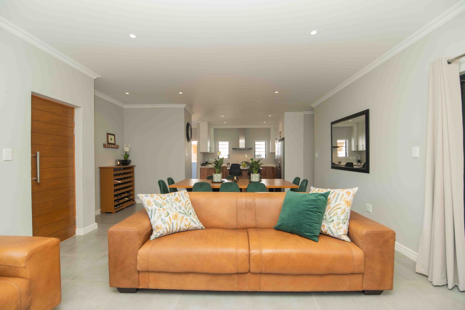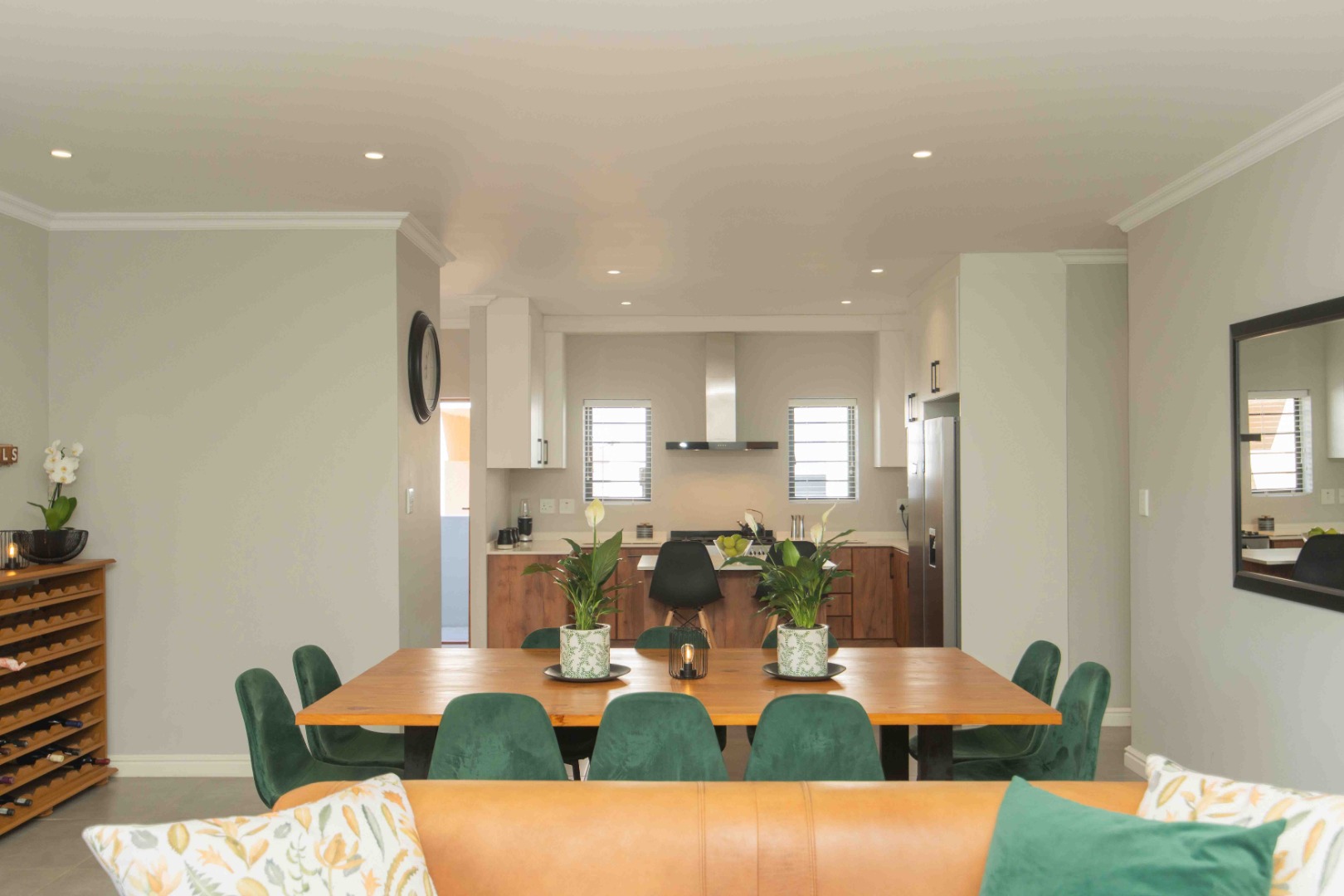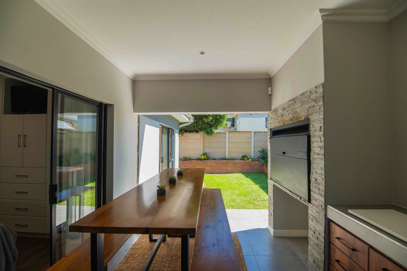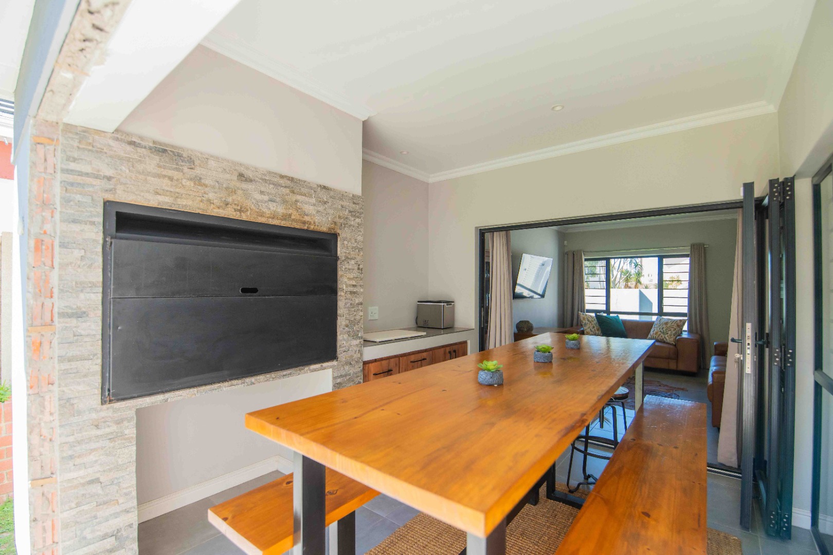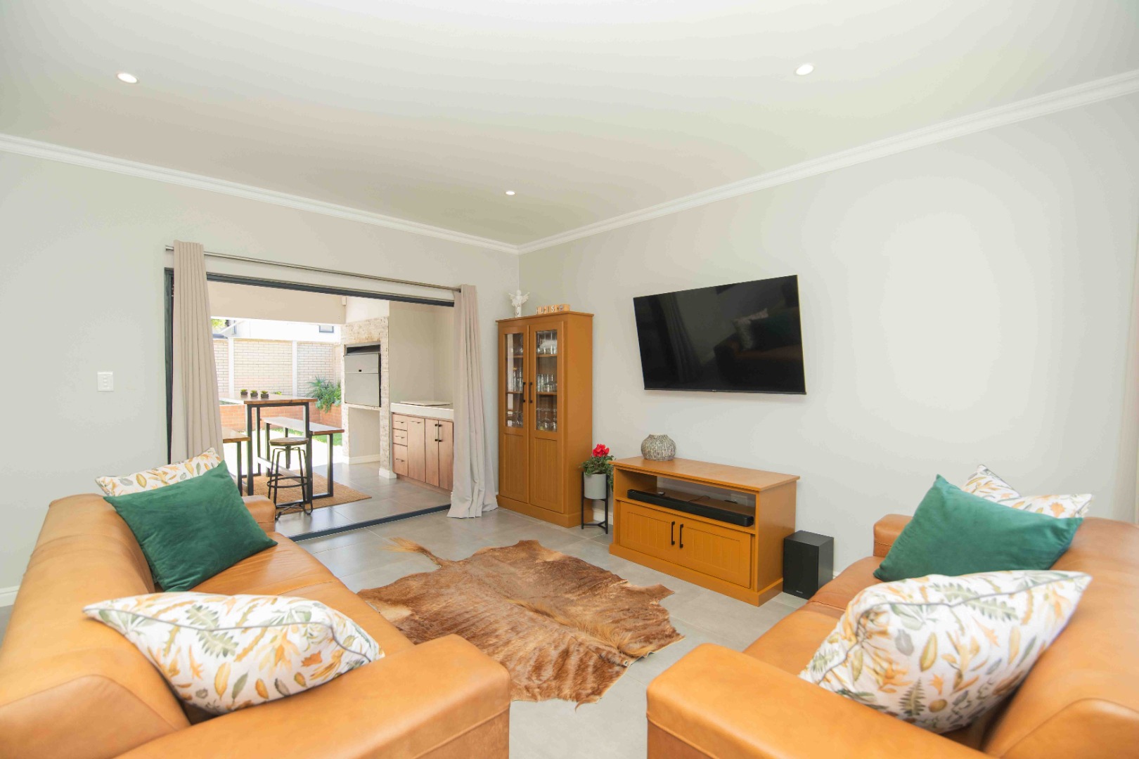 At the heart of the home, a beautifully appointed open-plan kitchen with scullery combine form and function, featuring a freestanding oven with gas hob and modern quartz counters throughout. Perfectly suited to both everyday living and stylish entertaining. The adjoining living areas extend effortlessly onto a covered verandah with a built-in braai, creating a seamless indoor/outdoor lifestyle ideal for year-round enjoyment.